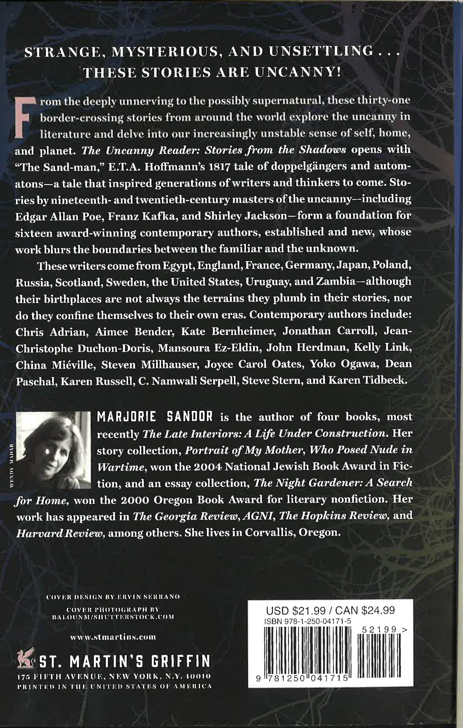From the deeply unsettling to the possibly supernatural, these thirty-one border-crossing stories from around the world explore the uncanny in literature, and delve into our increasingly unstable sense of self, home, and planet.The Uncanny Reader: Stories from the Shadows opens with "The Sand-man," E.T.A. Hoffmann's 1817 tale of doppelgangers and automatons - a tale that inspired generations of writers and thinkers to come. Stories by 19th and 20th century masters of the uncanny - including Edgar Allan Poe, Franz Kafka, and Shirley Jackson - form a foundation for sixteen award-winning contemporary authors, established and new, whose work blurs the boundaries between the familiar and the unknown. These writers come from Egypt, France, Germany, Japan, Poland, Russia, Scotland, England, Sweden, the United States, Uruguay, and Zambia - although their birthplaces are not always the terrains they plumb in their stories, nor do they confine themselves to their own eras. Contemporary authors include: Chris Adrian, Aimee Bender, Kate Bernheimer, Jean-Christophe Duchon-Doris, Mansoura Ez-Eldin, Jonathon Carroll, John Herdman, Kelly Link, Steven Millhauser, Joyce Carol Oates, Yoko Ogawa, Dean Paschal, Karen Russell, Namwali Serpell, Steve Stern and Karen Tidbeck.