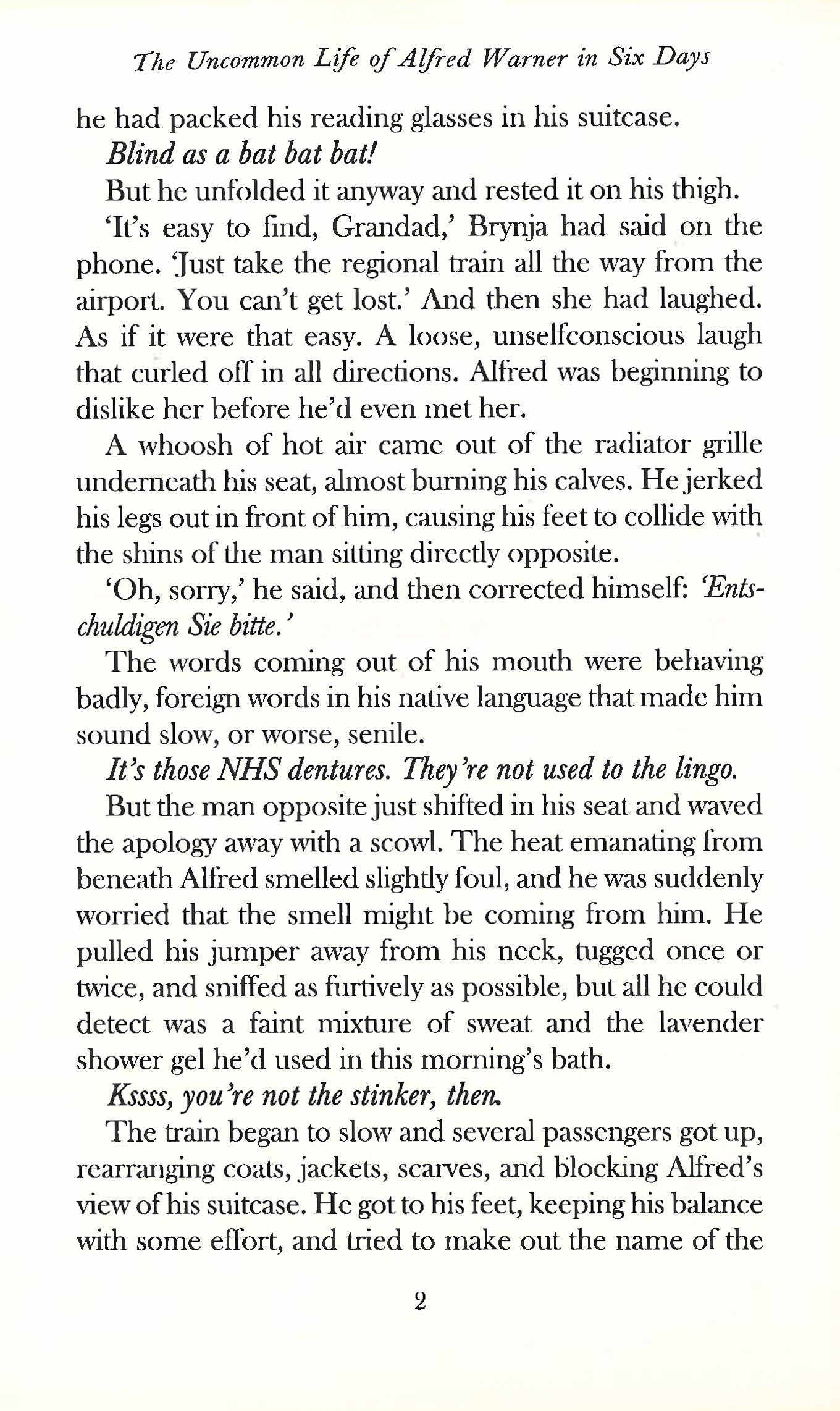 Shortly before Christmas, 79-year-old Alfred Warner arrives at Berlin's busy central train station, to meet his granddaughter Brynja for the first time. When she fails to arrive, Alfred, afraid and alone, is taken in by a stranger, Julia, who quickly realises that there is something remarkable about him. Worried sick, Alfred discovers that his granddaughter is lying in a coma in a Berlin hospital following an unexplained accident and may take months to fully recover. After the sympathetic Julia insists he stays at her home for Christmas, Alfred becomes increasingly anxious and announces that his time is running out and that he has only six days left to live. He knows this because the voices he has been listening to for his entire life have told him so. Alfred insists he must tell Julia his life story in the hope of saving Brynja's life after he is gone. If Brynja does recover, she must finally learn the truth about the voices. And so, over the ensuing six days he pours out his extraordinary tale. He tells Julia how, at the age of six, he began to hear voices, how soon afterwards he was tragically orphaned and of his terrifying ordeal at the hands of the Nazis as he grew up during the rise of the Third Reich. He also recounts how he was conscripted into the German army and how his life changed when he was captured and imprisoned in a POW camp in Scotland. Upon release he built a new life for himself in Britain, meeting the love of his life and raising a family. However, as we learn, his path through life's rich tapestry has undulated in some very unexpected ways. It has been a most uncommon life, but the one constant during each stage of his journey are the voices which accompany him, voices which for other members of his family, including Brynja, have been far less benign. Now Alfred's final duty is to make sure that Julia understands so that Brynja does not become yet another family tragedy.