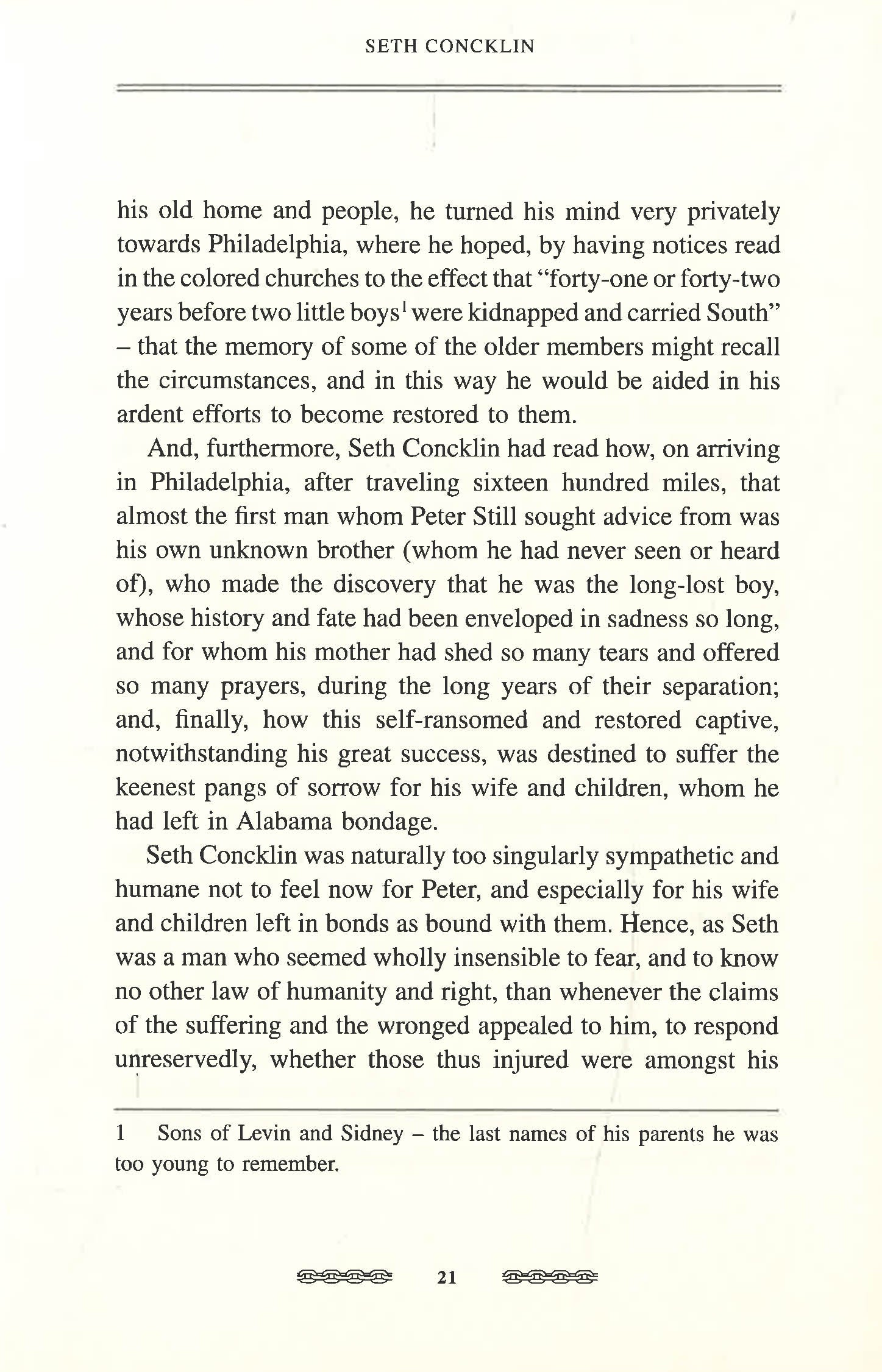 Like millions of my race, my mother and father were born slaves, but were not contented to live and die so. My father purchased himself in early manhood by hard toil. Mother saw no way for herself and children to escape the horrors of bondage but by flight. Bravely, with her four little ones, with firm faith in God and an ardent desire to be free, she forsook the prison-house, and succeeded, through the aid of my father, to reach a free State. Here life had to be begun anew. The old familiar slave names had to be changed, and others, for prudential reasons, had to be found. This was not hard work. However, hardly months had passed ere the keen scent of the slave-hunters had trailed them to where they had fancied themselves secure. In those days all power was in the hands of the oppressor, and the capture of a slave mother and her children was attended with no great difficulty other than the crushing of freedom in the breast of the victims. Without judge or jury, all were hurried back to wear the yoke again. But back this mother was resolved never to stay. She only wanted another opportunity to again strike for freedom. In a few months after being carried back, with only two of her little ones, she took her heart in her hand and her babes in her arms, and this trial was a success. Freedom was gained, although not without the sad loss of her two older children, whom she had to leave behind. Mother and father were again reunited in freedom, while two of their little boys were in slavery. What to do for them other than weep and pray, were questions unanswerable. For over forty years the mother's heart never knew what it was to be free from anxiety about her lost boys. But no tidings came in answer to her many prayers, until one of them, to the great astonishment of his relatives, turned up in Philadelphia, nearly fifty years of age, seeking his long-lost parents.