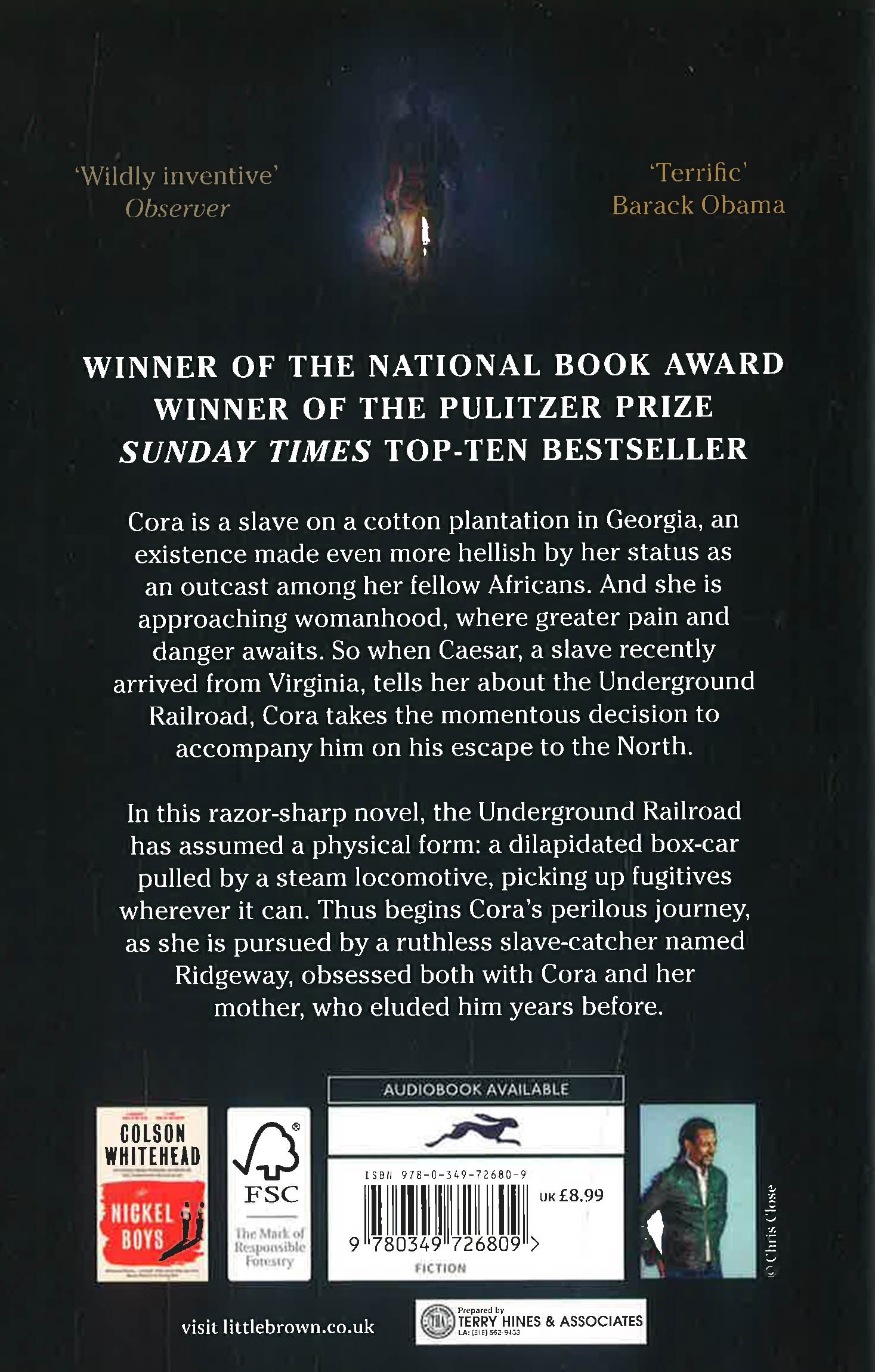 Cora is a slave on a cotton plantation in Georgia. All the slaves lead a hellish existence, but Cora has it worse than most; she is an outcast even among her fellow Africans and she is approaching womanhood, where it is clear even greater pain awaits. When Caesar, a slave recently arrived from Virginia, tells her about the Underground Railroad, they take the perilous decision to escape to the North.