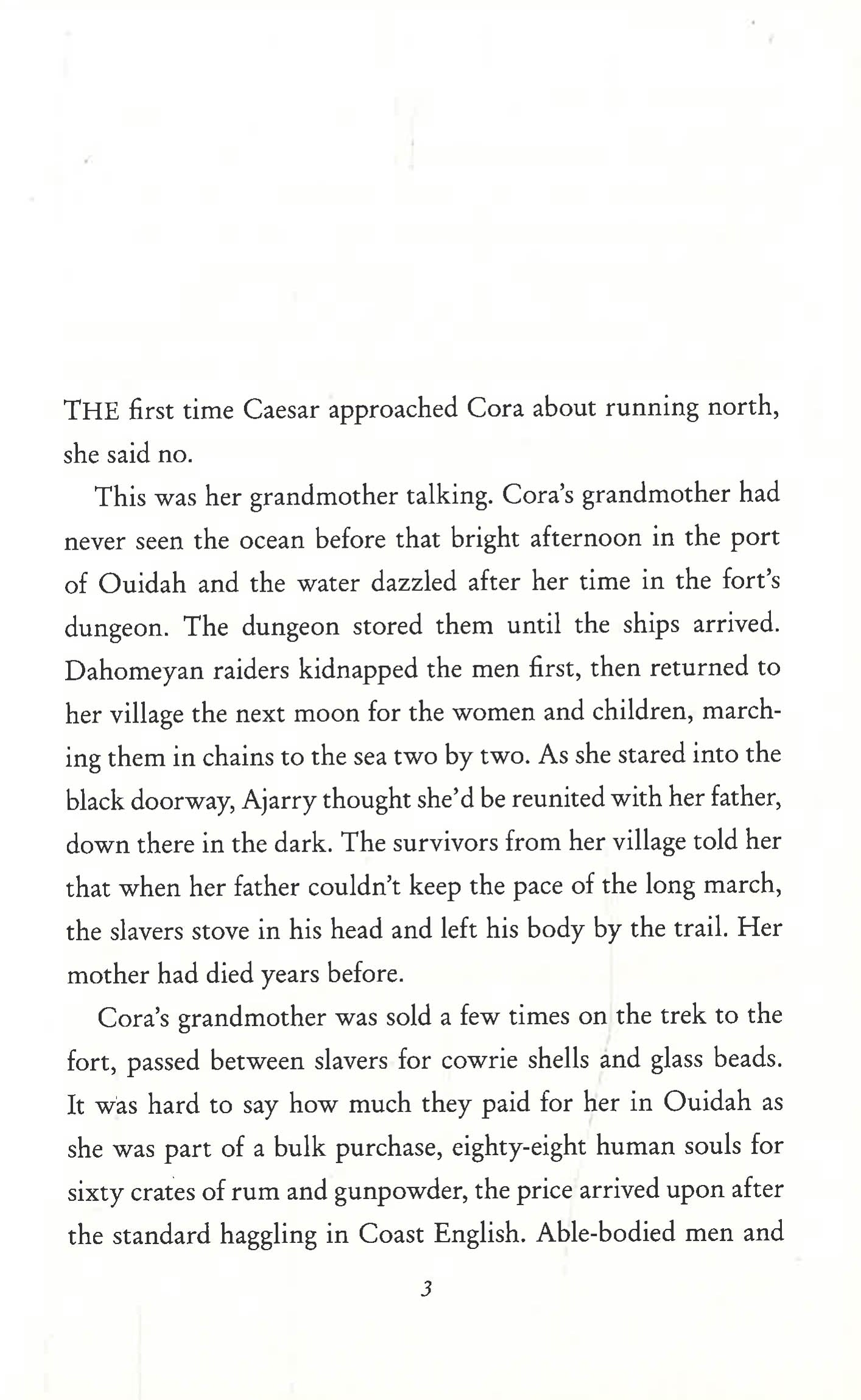 At each stop on her journey, Cora encounters a different world. As Whitehead brilliantly recreates the unique terrors for black people in the pre-Civil War era, his narrative seamlessly weaves the saga of America, from the brutal importation of Africans to the unfulfilled promises of the present day. The Underground Railroad is at once the story of one woman's ferocious will to escape the horrors of bondage and a shatteringly powerful meditation on history.