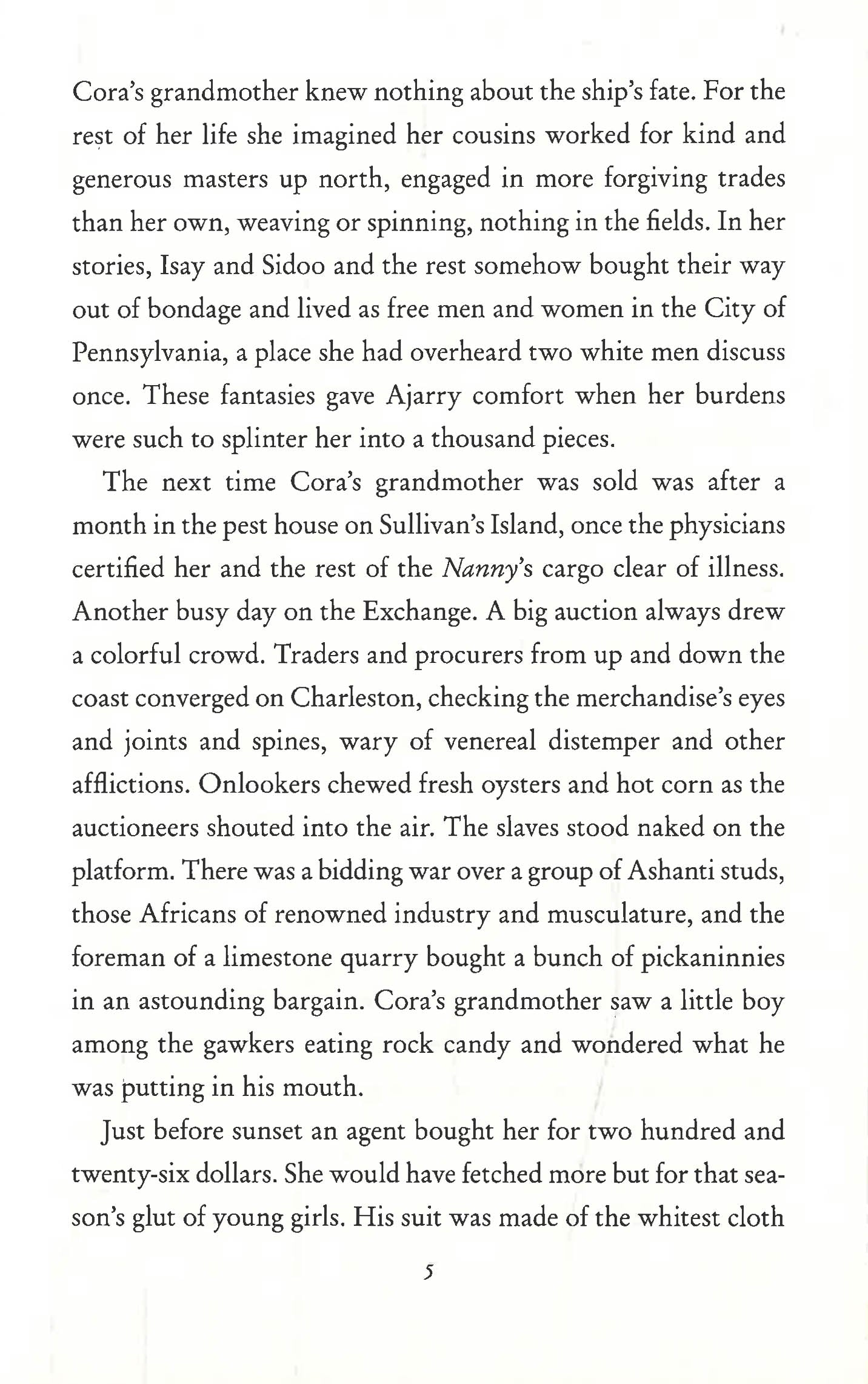 In Whitehead's razor-sharp imagining of the antebellum South, the Underground Railroad has assumed a physical form: a dilapidated box car pulled along subterranean tracks by a steam locomotive, picking up fugitives wherever it can. Cora and Caesar's first stop is South Carolina, in a city that initially seems like a haven. But its placid surface masks an infernal scheme designed for its unknowing black inhabitants. And even worse: Ridgeway, the relentless slave catcher sent to find Cora, is close on their heels. Forced to flee again, Cora embarks on a harrowing flight, state by state, seeking true freedom.
