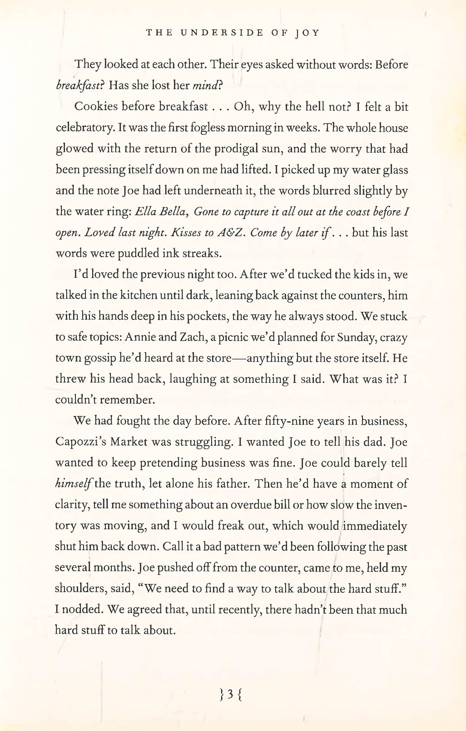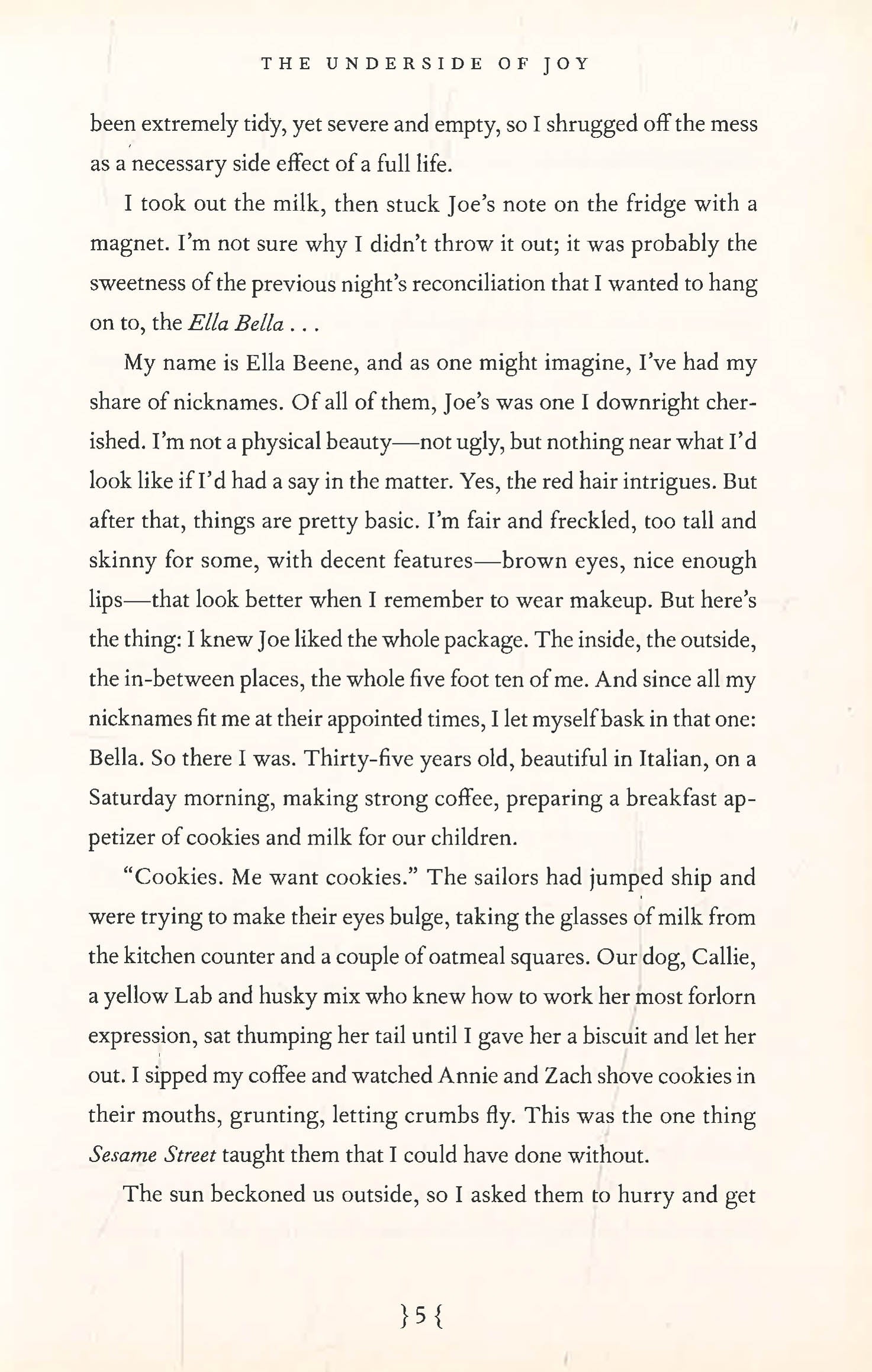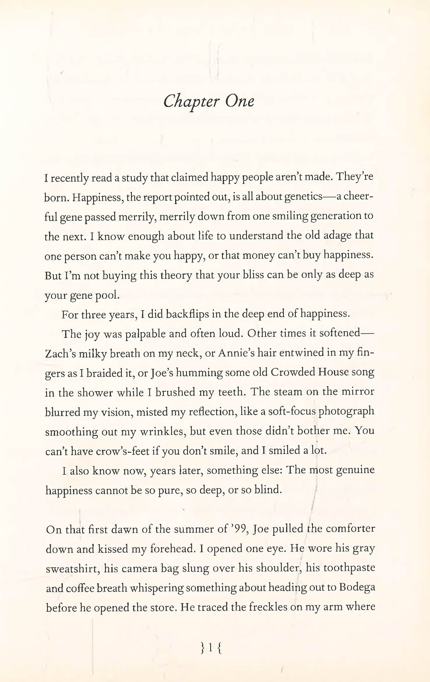 To Ella Beene, happiness means living in the Northern California river town of Elbow, California, with her husband Joe and his two young children. But one summer day Joe drowns, leaving Ella alone with Annie and Zach-until his ex-wife, Paige, shows up at the funeral. For three years, Ella believed that Paige had selfishly abandoned her family. Yet-as the custody fight between mother and stepmother ensues-Ella realizes there may be more to the story than Joe ever revealed.