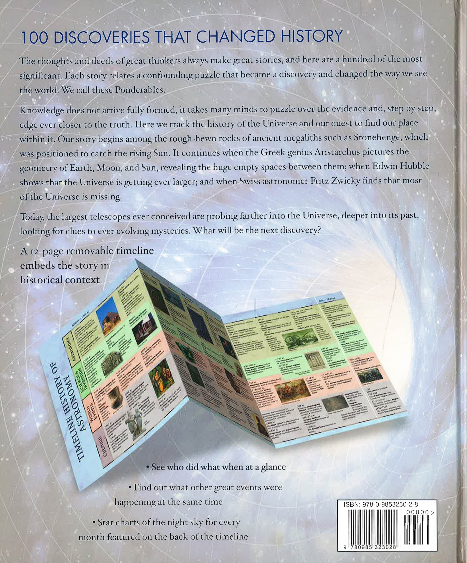 Includes a removable fold-out concertina neatly housed in the back of the book. This fold-out provides a 12-page Timeline History of the Universe that embeds the story in historical context and shows Who Did What When at a glance. On the reverse side is a 12 page Star Chart of the Night Sky of the northern and southern hemisphere for every month.