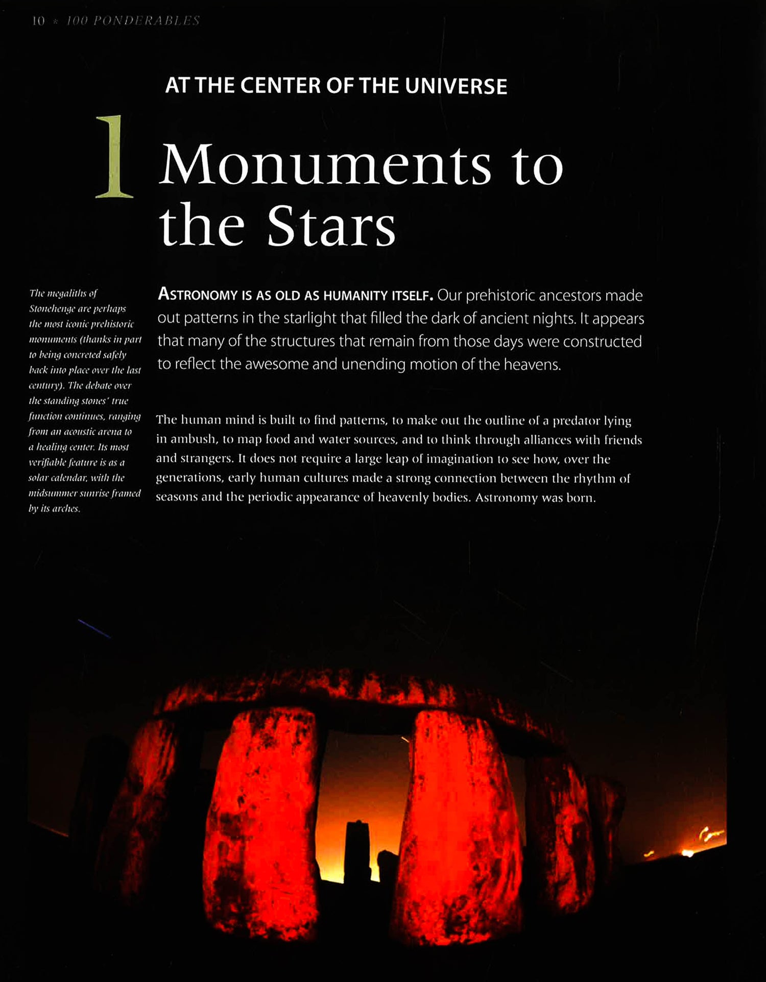 Here we track the history of the Universe and our quest to find our place within it. The story begins among the rough-hewn rocks of ancient megaliths such as Stonehenge, when they are positioned to catch the rising Sun. It continues when the Greek genius Aristarchus pictures the geometry of Earth, Moon, and Sun, revealing the huge empty spaces between them; when Edwin Hubble shows that the Universe is getting ever larger; and when Swiss astronomer Fritz Zwicky finds that most of the Universe is missing. These moments were turning points, times when years of accumulated thought converged upon one astronomer’s obsession, to turn a confounding puzzle into a discovery that changed the way we see the world. We call these Ponderables.