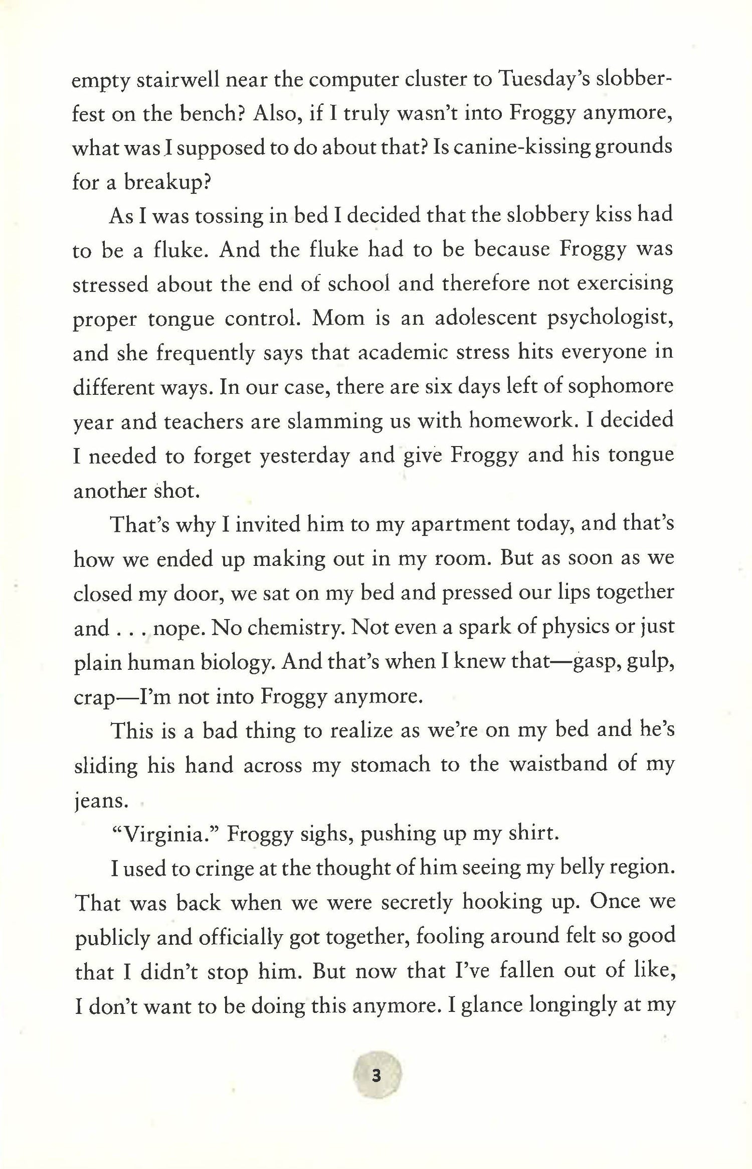 It's been five months since sixteen-year-old Virginia Shreves thought her life was finally back on course: she has come to terms with who she is both inside and out, and she's even started to rebuild her relationship with her older brother Byron, whose date-rape charge completely shattered everything.But just as she's getting used to the new normal, Virginia's world turns upside down again. Sparks with boyfriend Froggy Welsh the Fourth fade, her best friend Shannon bombshells bad news, and then the police arrest Byron.As Virginia struggles to cope, she meets Sebastian, an artist with his own baggage. The pair make a pact not to share their personal dramas. But secrets have a way of coming out, and theirs have the potential to ruin everything.