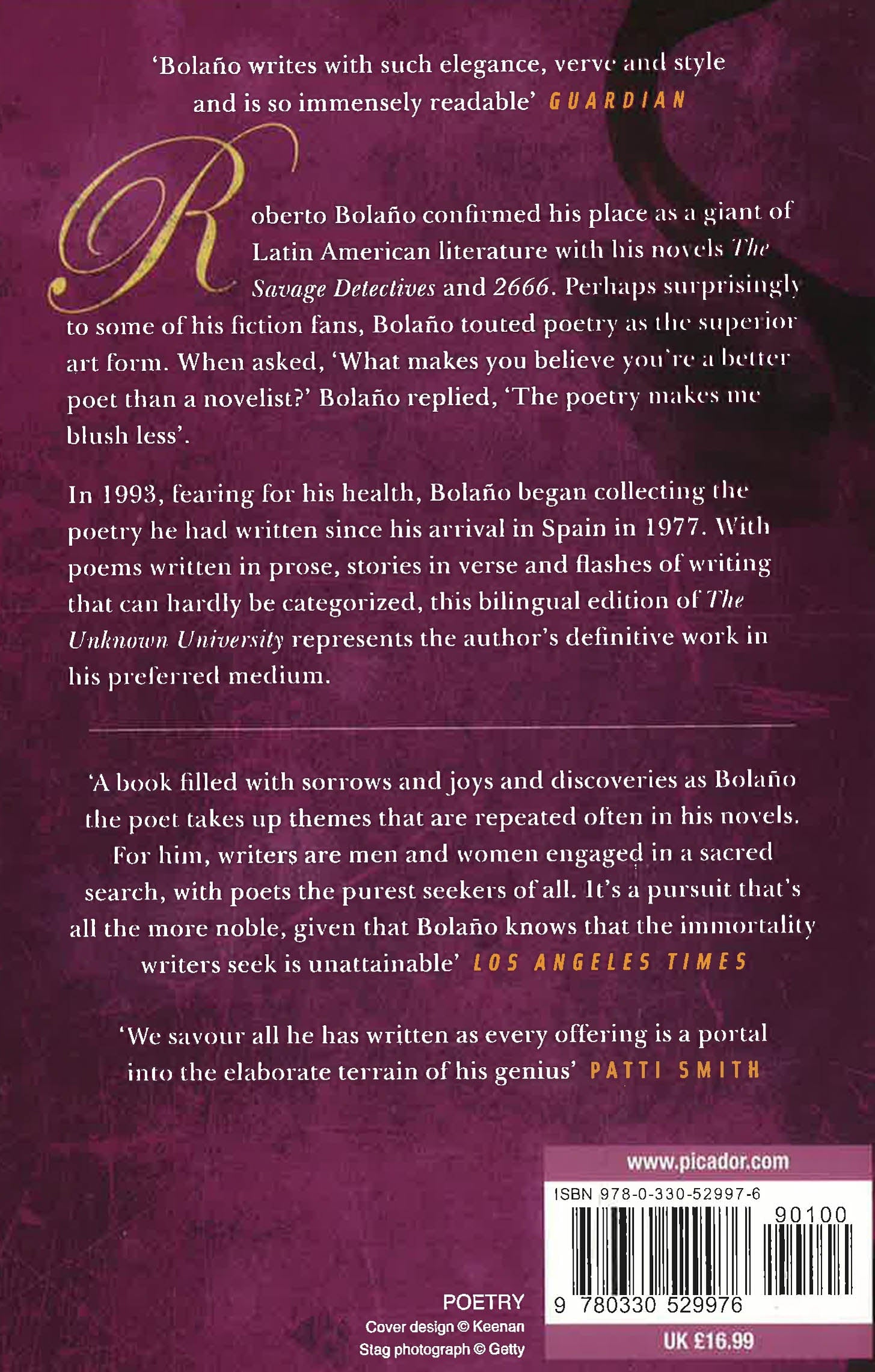 In 1993, fearing for his health, Bolano began collecting the poetry he had written since his arrival in Spain in 1977. This bilingual edition of The Unknown University represents the author's definitive work in his preferred medium.