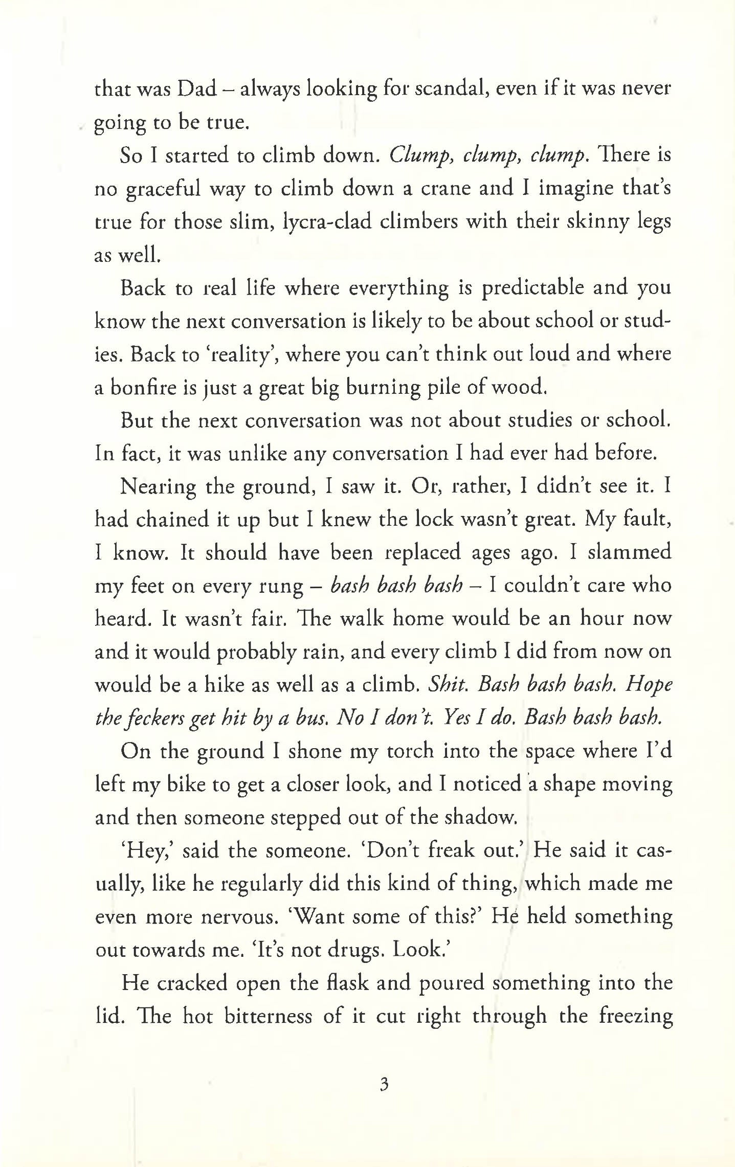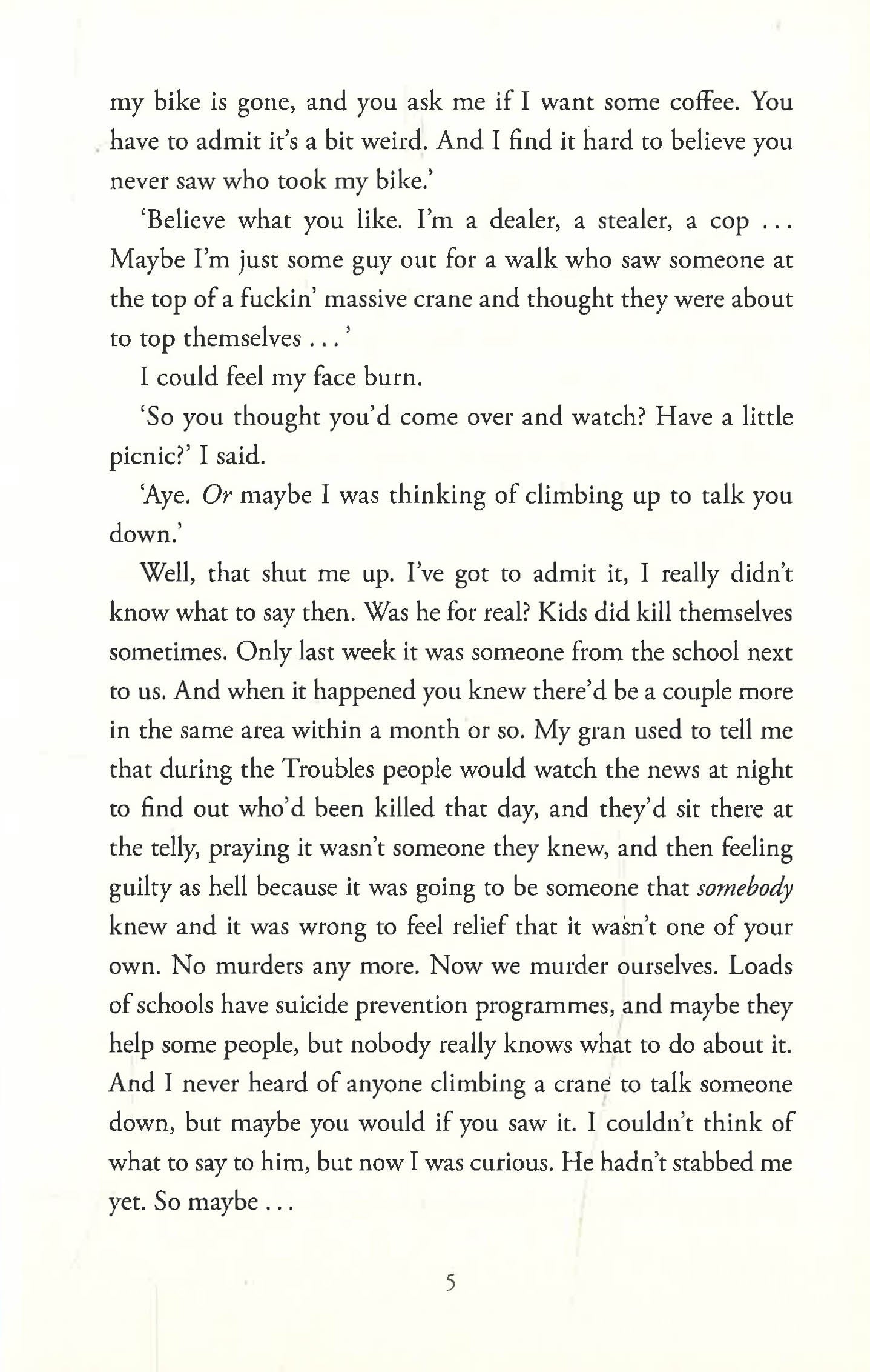 Tilly is perched at the top of Belfast's largest crane. She likes to climb up high at night in order to feel free from a city which, despite the best PR, is still full of trouble and conflict. Eventually, she comes back down to discover her bike is missing and in its place is a boy named Brew. Wearing eyeliner and high-heeled boots, he offers her a drink from his flask of coffee before disappearing into the night. The next morning, Tilly's bike is returned, but tucked into the spoke of the wheel is a card with Brew's number on it.