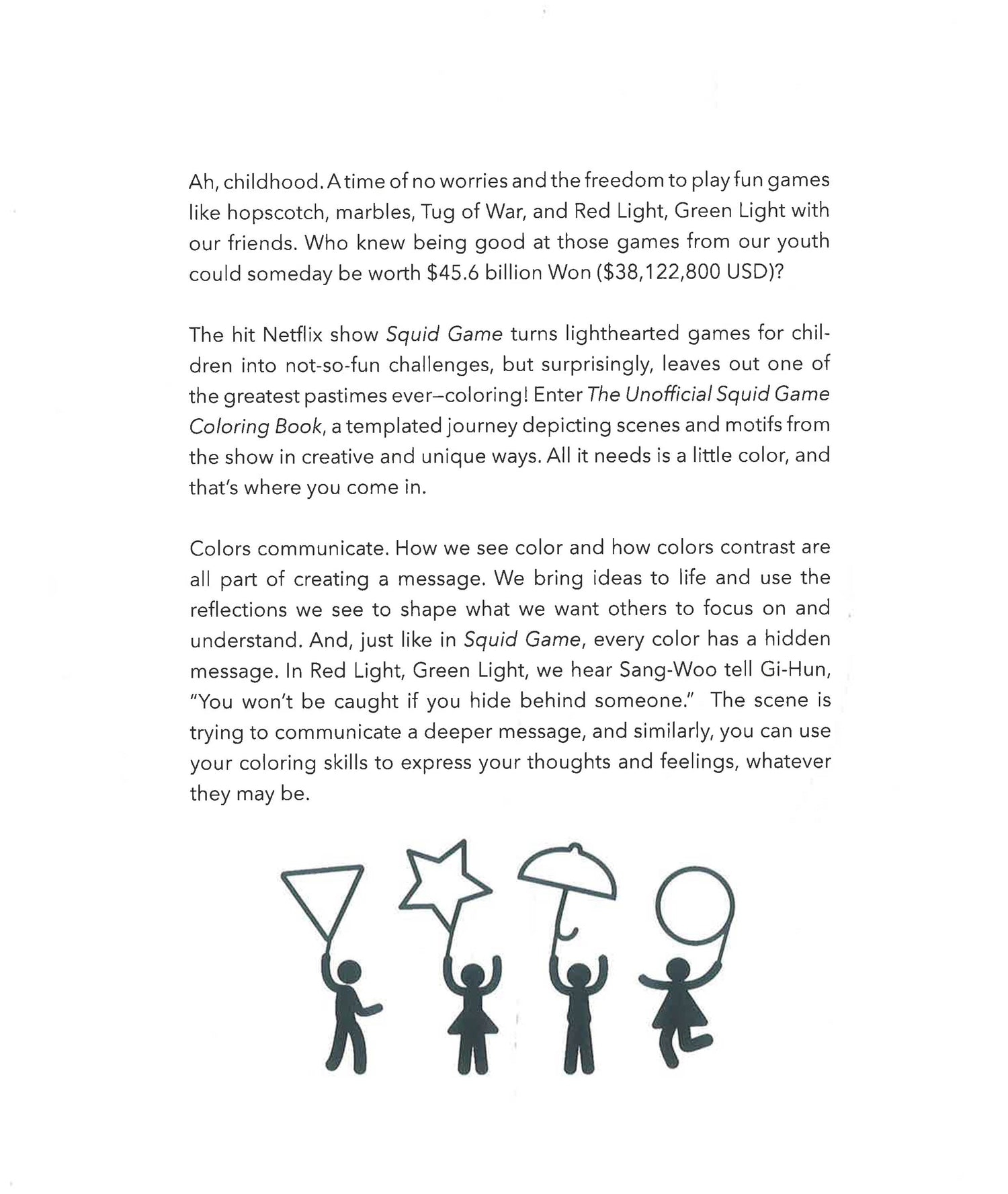 With inspiring images that are character-based without all the violence of the show, interesting quotes, and playful takes on the number system, this book is ideal for those who enjoy coloring and want to become closer with the characters of the show. The Unofficial Squid Game Coloring Book incorporates all of the memorable and favorited moments and motifs throughout.