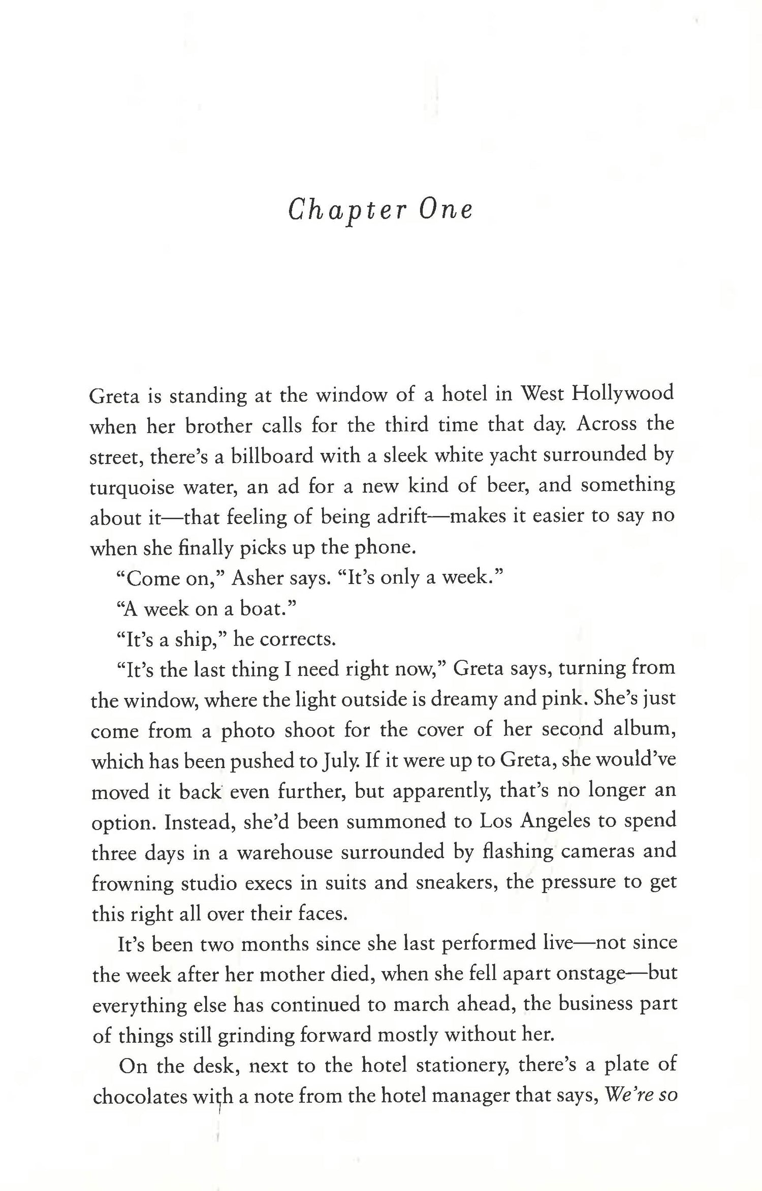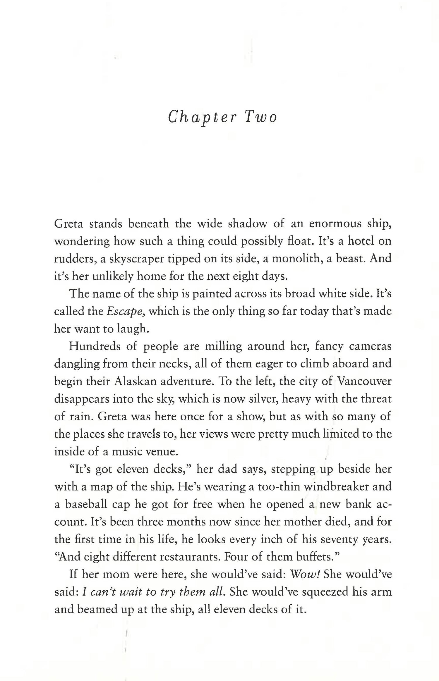 It’s here in this unlikeliest of places—at sea, far from the packed city venues where she usually plays and surrounded by the stunning scenery of Alaska—Greta will finally confront the choices she’s made, the heartbreak she’s suffered, and the family hurts that run deep. In the end, she’ll have to decide what her path forward might look like—and how to find her voice again.