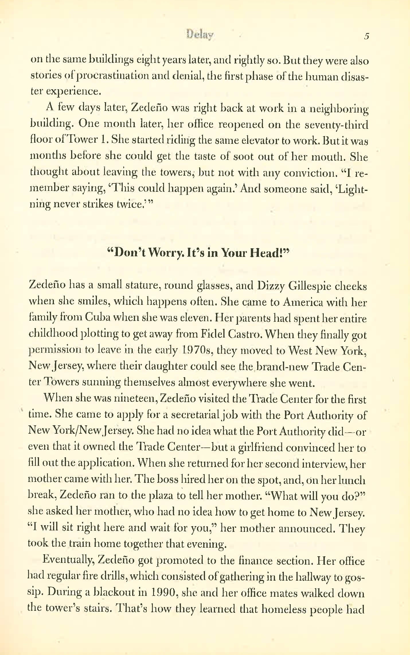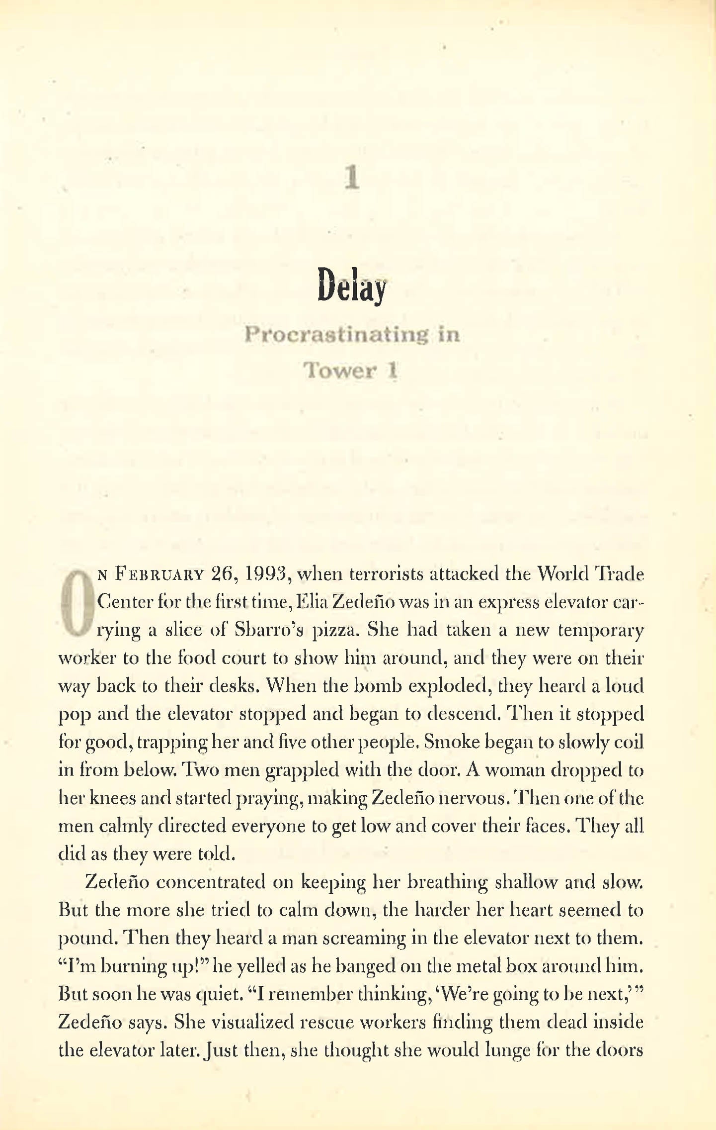 It was 8.46 a.m. on 9/11 when Elia Zedeño, who had worked in the World Trade Center for twenty-one years, heard a booming explosion and felt the building lurch violently to the south. She grabbed her desk, taking her feet off the floor, and screamed, 'What's happening?'