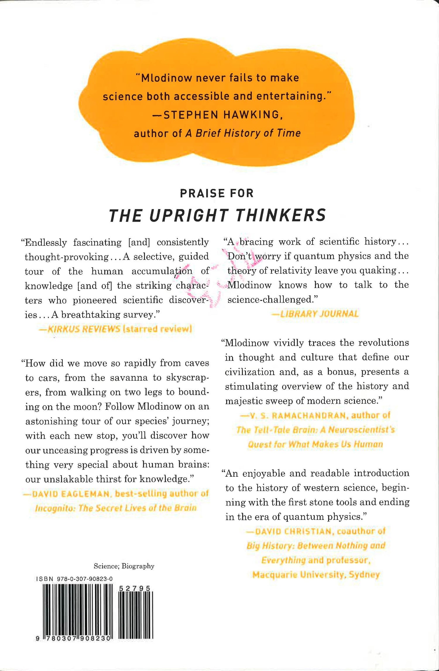 A few million years ago, our ancestors came down from the trees and began to stand upright, freeing our hands to create tools and our minds to grapple with the world around us. Leonard Mlodinow takes us on a passionate and inspiring tour through the exciting history of human progress and the key events in the development of science. In the process, he presents a fascinating new look at the unique characteristics of our species and our society that helped propel us from stone tools to written language and through the birth of chemistry, biology, and modern physics to today s technological world. Along the way he explores the cultural conditions that influenced scientific thought through the ages and the colorful personalities of some of the great philosophers, scientists, and thinkers: Galileo, who preferred painting and poetry to medicine and dropped out of university; Isaac Newton, who stuck needlelike bodkins into his eyes to better understand changes in light and color; and Antoine Lavoisier, who drank nothing but milk for two weeks to examine its effects on his body. Charles Darwin, Albert Einstein, Werner Heisenberg, and many lesser-known but equally brilliant minds also populate these pages, each of their stories showing how much of human achievement can be attributed to the stubborn pursuit of simple questions (why? how?), bravely asked. "The Upright Thinkers" is a book for science lovers and for anyone interested in creative thinking and in our ongoing quest to understand our world. At once deeply informed, accessible, and infused with the author s trademark wit, this insightful work is a stunning tribute to humanity s intellectual curiosity. (With black-and-white illustrations throughout.) * This book may have remainder mark*