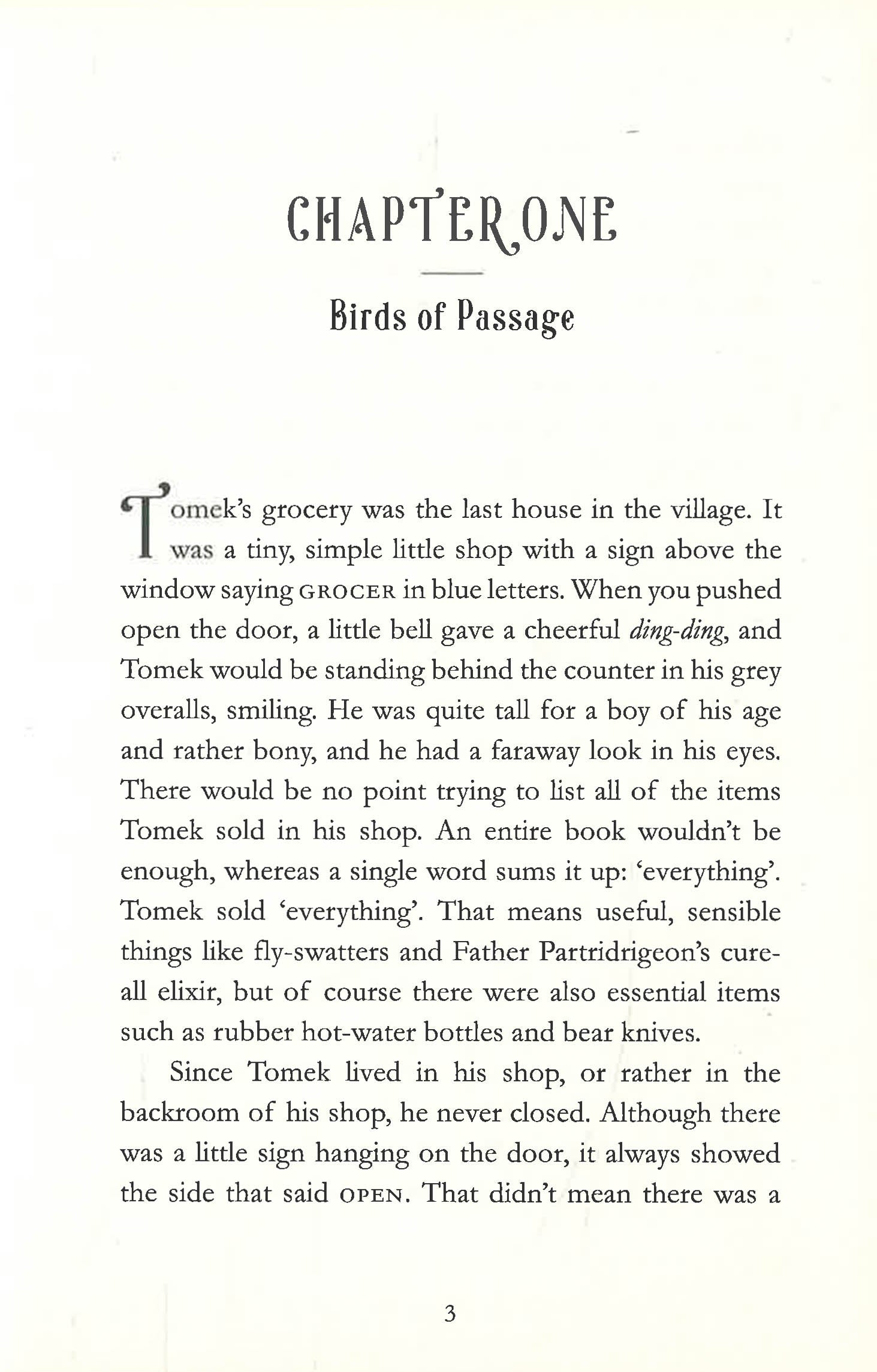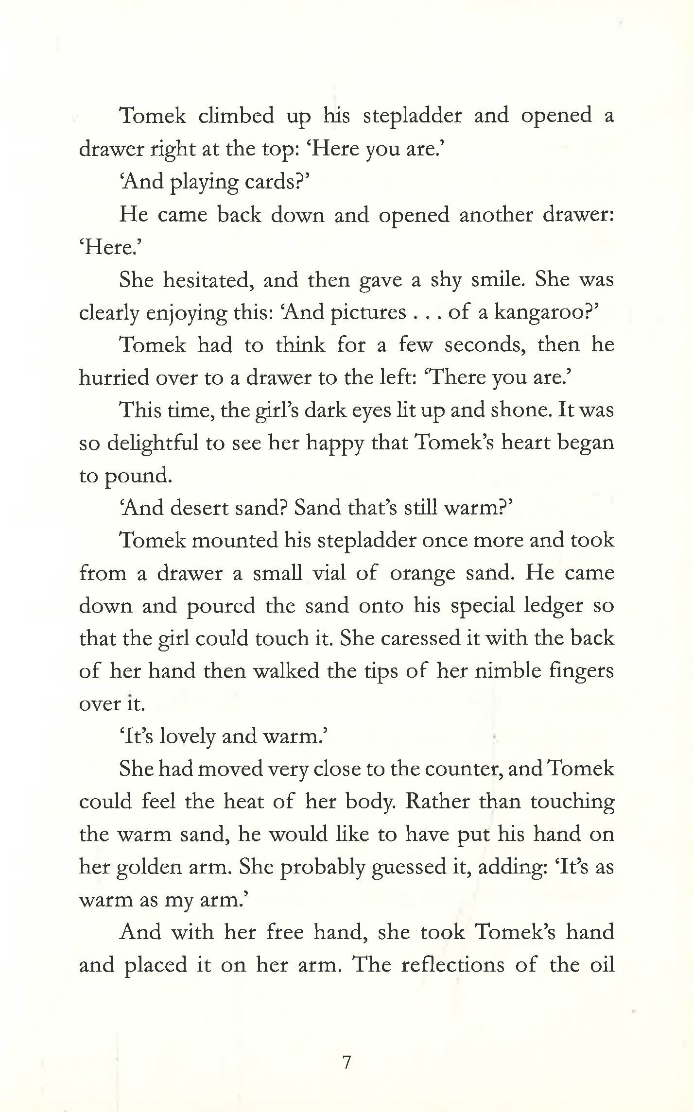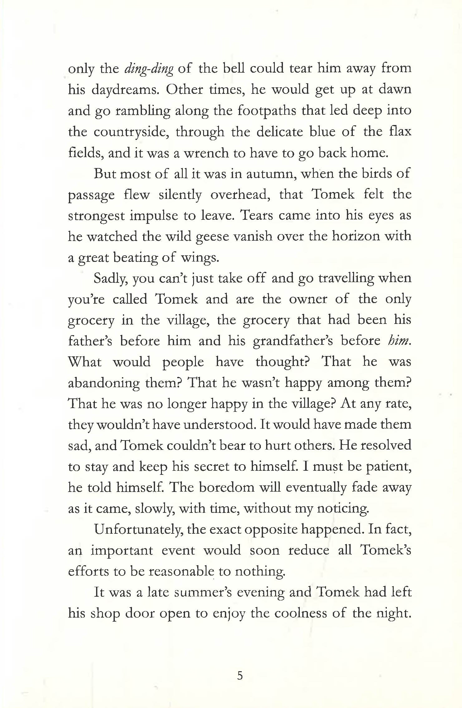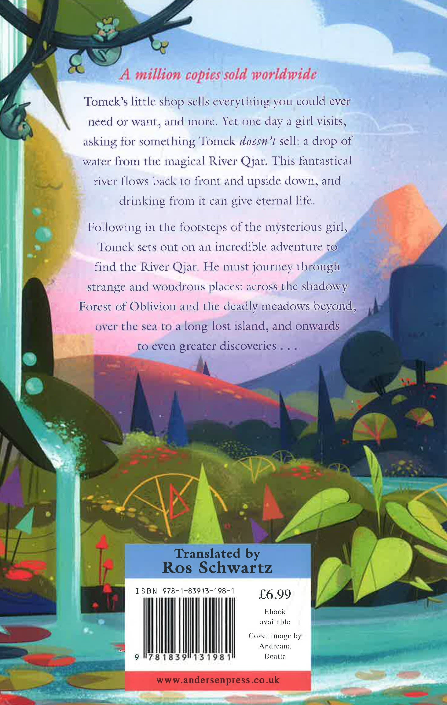 Tomek lives a quiet life running his late parents' village store, which has everything you could ever need, and more. Then one day a girl visits. She asks Tomek if he sells something he's never heard of before: a drop of water from the magical River Qjar, which flows back to front and upside down. When he admits he has none, she slips away. Tomek is desperate to follow the mysterious girl, and so he sets out on an incredible adventure. To find the upside down river, he must journey through strange and wondrous places: the Forest of Oblivion where monstrous bears roam, a meadow of deadly scented flowers, a long-hidden island cursed by a witch, and beyond . . . A million-copy bestseller in France, this beloved fantasy story is at last published in English for the very first time. Translated by Ros Schwartz