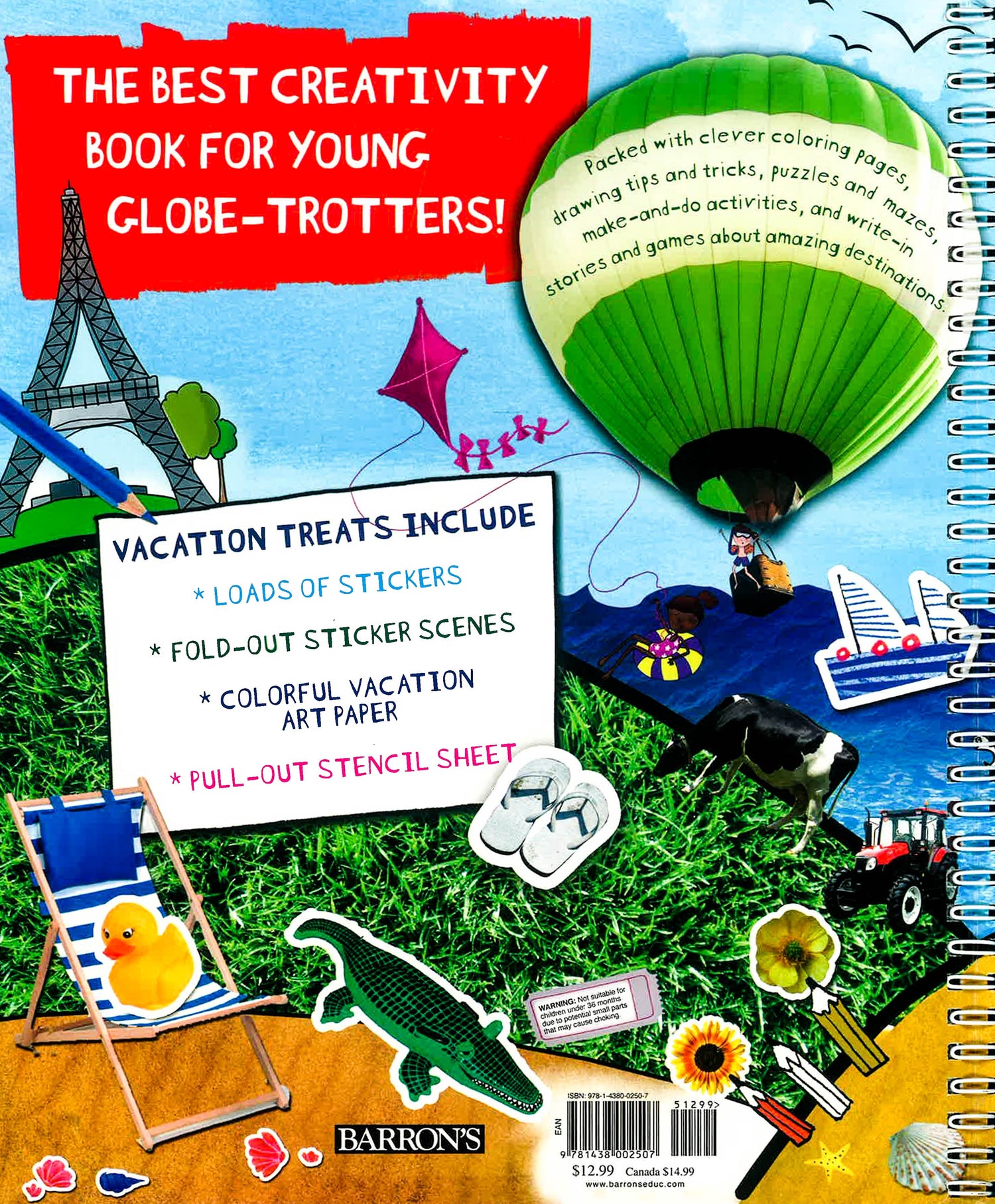 Vacations mean travel, and kids can travel in their imaginations to the seashore, the country, or to faraway cities like Paris. This activity book gives them pictures to color, vacation scenes to create with stickers, puzzles to solve, and lots more! This title in Barron's growing list of "Creativity Books" is filled with fun projects to keep kids cheerfully occupied on rainy days, on lengthy car trips, or during quiet time at home. Its features include-- Games, puzzles, stencils, sticker sheets, and an illustrated gatefold page for sticker decorating Special pull-out art paper and art projects to complete Pages for coloring Fun-to-answer quizzes Each " Creativity Book" has a distinctive theme to capture specific interests of boys and girls. Illustrations on virtually every page include 40 pages in color.