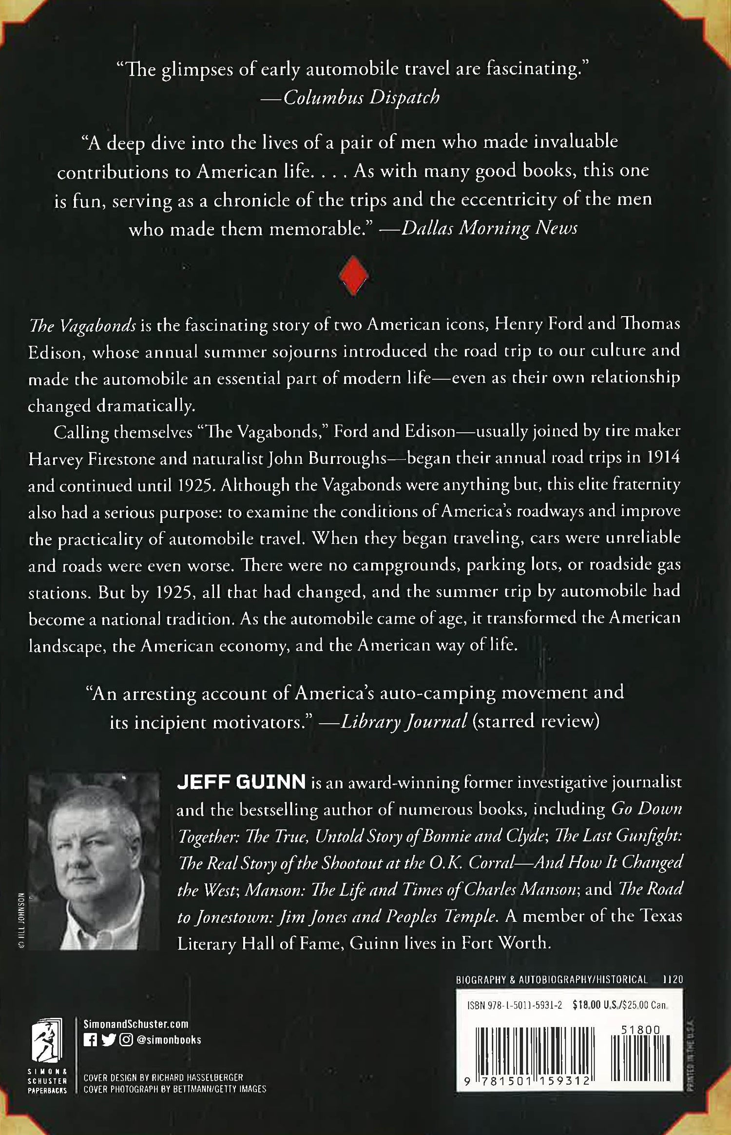 A "fascinating slice of rarely considered American history" (Booklist)-the story of Henry Ford and Thomas Edison-whose annual summer sojourns introduced the road trip to our culture and made the automobile an essential part of modern life.In 1914 Henry Ford and naturalist John Burroughs visited Thomas Edison in Florida and toured the Everglades. The following year Ford, Edison, and tire maker Harvey Firestone joined together on a summer camping trip and decided to call themselves the Vagabonds. They would continue their summer road trips until 1925, when they announced that their fame made it too difficult for them to carry on. Although the Vagabonds traveled with an entourage of chefs, butlers, and others, this elite fraternity also had a serious purpose: to examine the conditions of America's roadways and improve the practicality of automobile travel. Cars were unreliable and the roads were even worse. But newspaper coverage of these trips was extensive, and as cars and roads improved, the summer trip by automobile soon became a desired element of American life. The Vagabonds is "a portrait of America's burgeoning love affair with the automobile" (NPR) but it also sheds light on the important relationship between the older Edison and the younger Ford, who once worked for the famous inventor. The road trips made the automobile ubiquitous and magnified Ford's reputation, even as Edison's diminished. The automobile would transform the American landscape, the American economy, and the American way of life and Guinn brings this seminal moment in history to vivid life.
