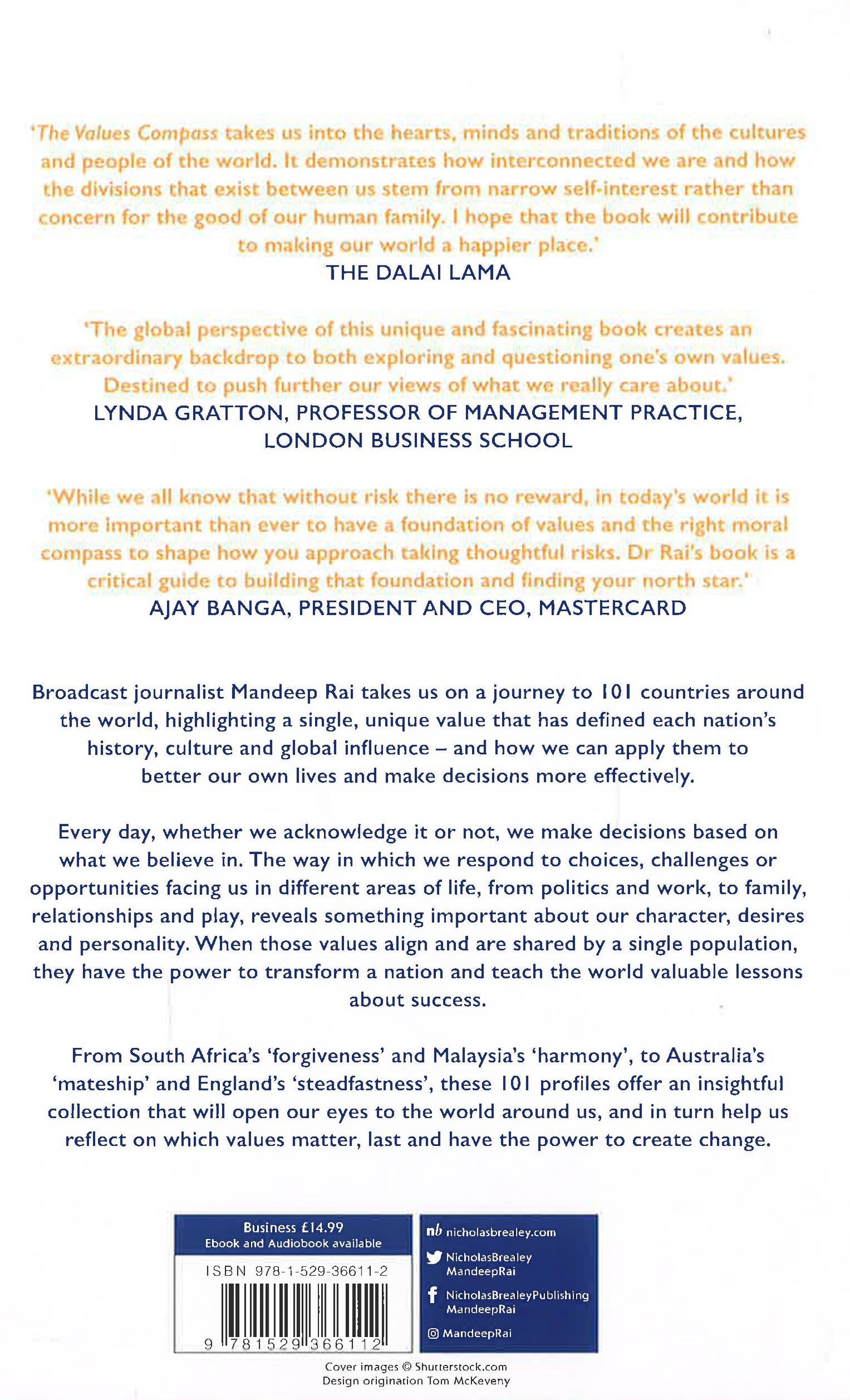 THE VALUES COMPASS takes us into the hearts, minds, and traditions of the cultures and people of the world. It demonstrates how interconnected we are and how the divisions that exist between us stem from narrow self-interest rather than concern for the good of our human family. I hope that the book will contribute to making our world a happier place.' The Dalai Lama 'THE VALUES COMPASS is a fresh, engaging and eye-opening guide to understanding ourselves and others in the most profound and practical ways.' Deepak ChopraEvery day, whether we acknowledge it or not, we make decisions based on what we believe in. The choices, challenges, or opportunities facing us - and how we engage with them - in politics, family, relationships, work, and play reveal something important about our character, desires, and personality to ourselves and to others. When those values align and are shared by a single population, they have the power to transform a nation and teach the world valuable lessons about success. In THE VALUES COMPASS, Mandeep Rai explores this concept by taking 101 distinct countries and identifying a single key value in each that is represented throughout its history, geography, and culture in the hope that we may find a way to incorporate those values into our own lives. From India's 'faith' to Vietnam's 'resilience', Argentina's 'passion' to Singapore's 'order', Australia's 'mateship' to Uganda's 'heritage' and from Malta's 'community' to Sri Lanka's 'joy', we may all find something of ourselves in others and succeed together as a result. This is an insightful and readable collection of profiles that open our eyes to the world around us, and in turn help us reflect on which values matter, last, and have the power to create change.