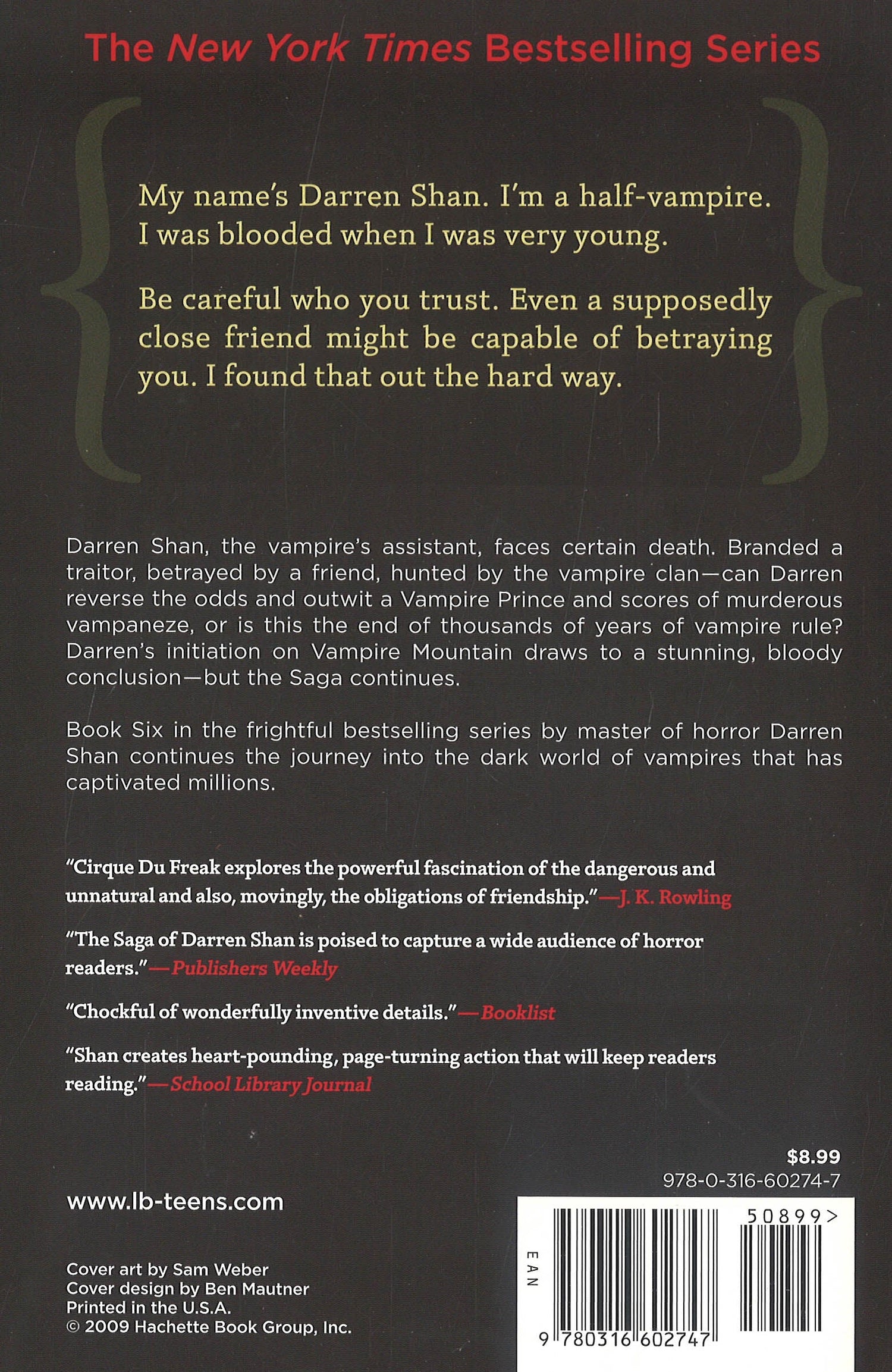 Branded a traitor, betrayed by a friend, hunted by the vampire clan-Darren Shan, the Vampire's Assistant, faces certain death. Can Darren reverse the odds and outwit a Vampire Prince? Darren's initiation on Vampire Mountain draws to a stunning, bloody conclusion-but the Saga continues ...