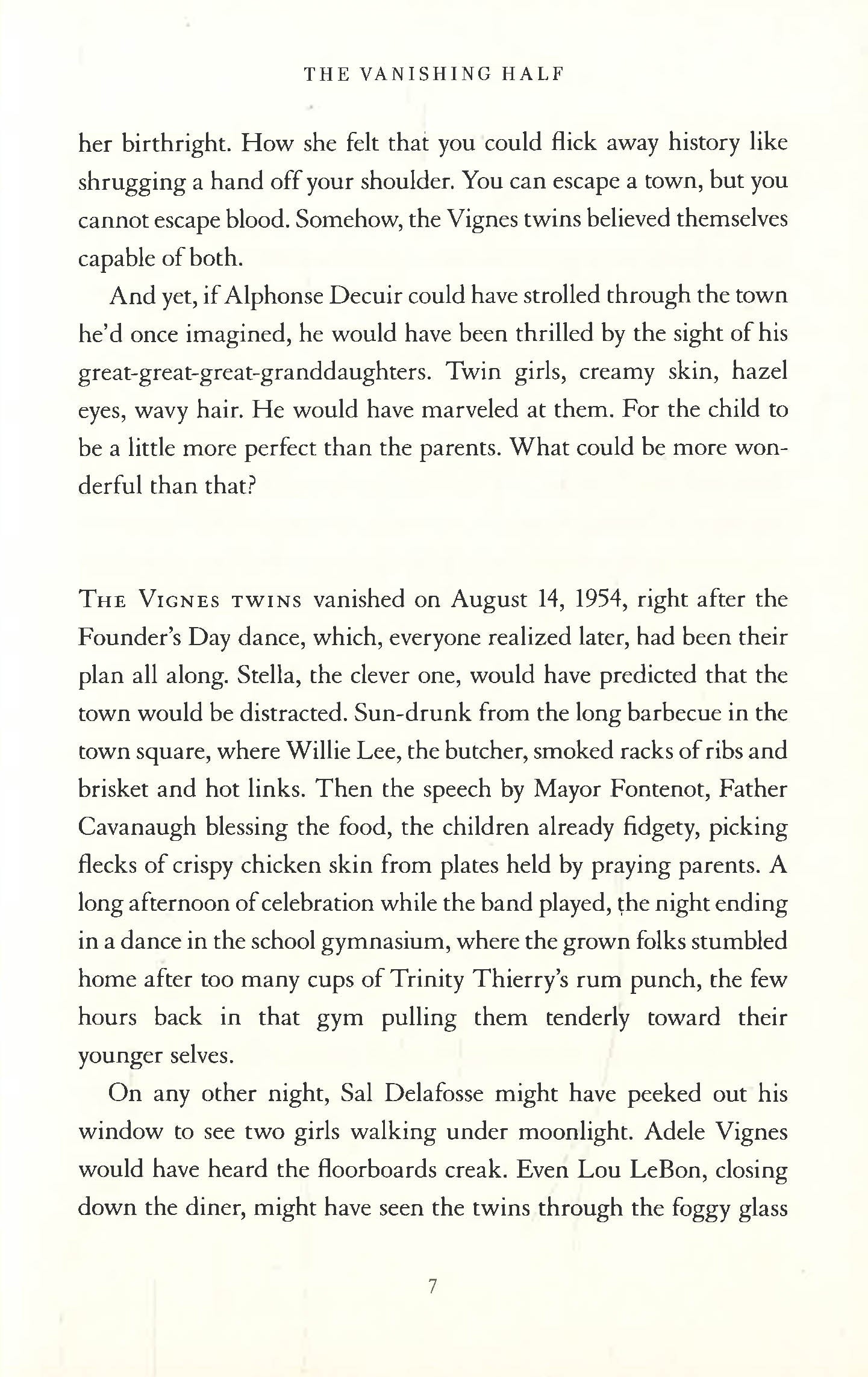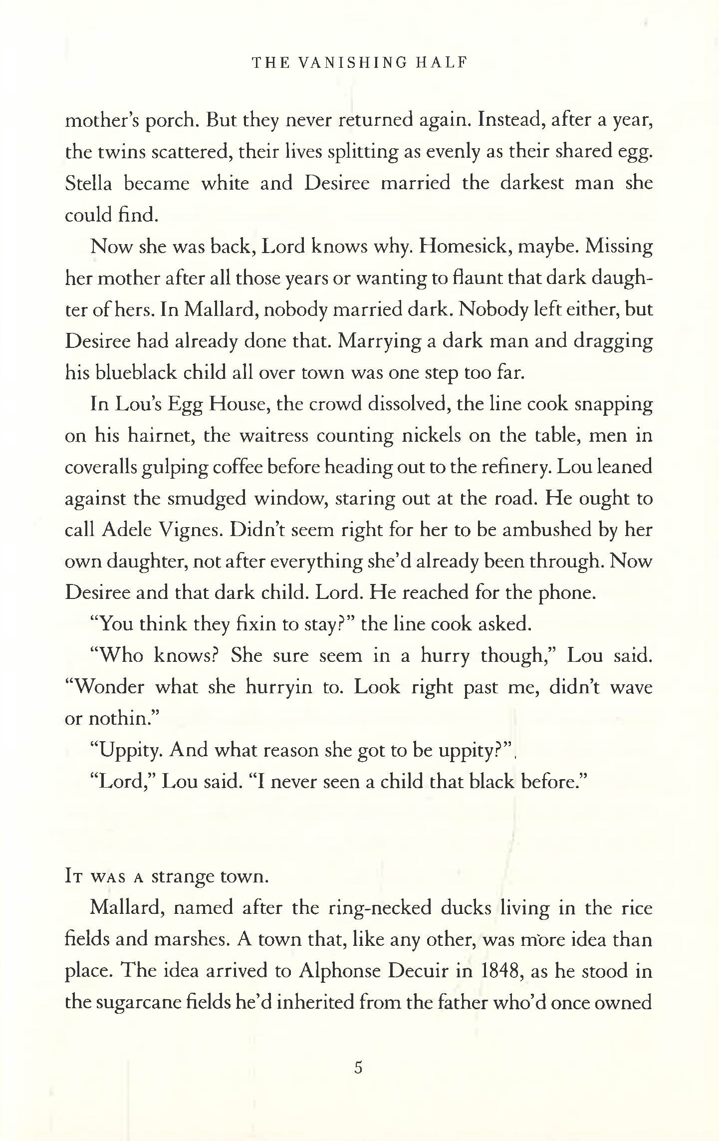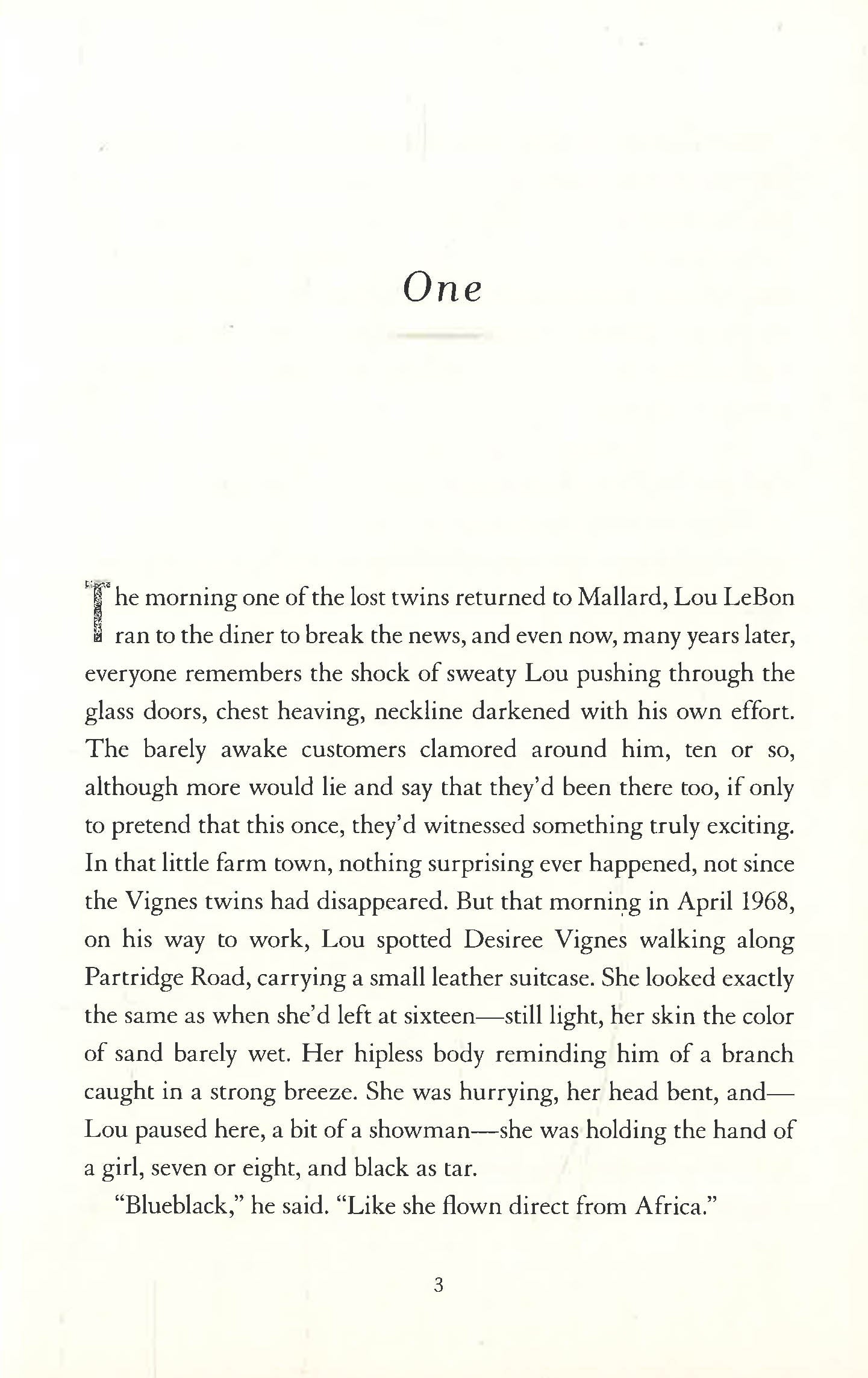 The Vignes twin sisters will always be identical. But after growing up together in a small, southern black community and running away at age sixteen, it's not just the shape of their daily lives that is different as adults, it's everything: their families, their communities, their racial identities. Ten years later, one sister lives with her black daughter in the same southern town she once tried to escape. The other secretly passes for white, and her white husband knows nothing of her past. Still, even separated by so many miles and just as many lies, the fates of the twins remain intertwined. What will happen to the next generation, when their own daughters' story lines intersect?