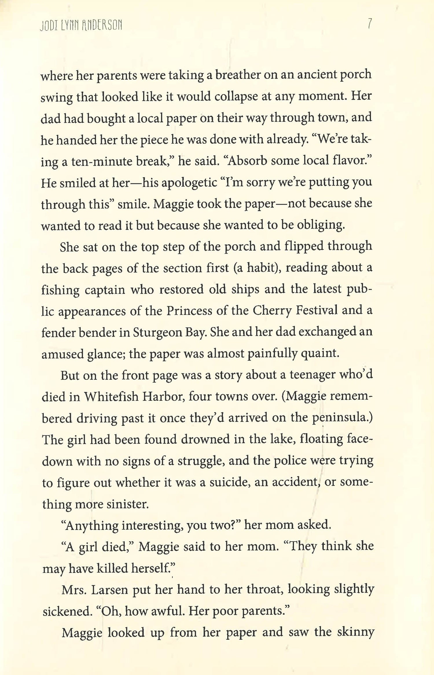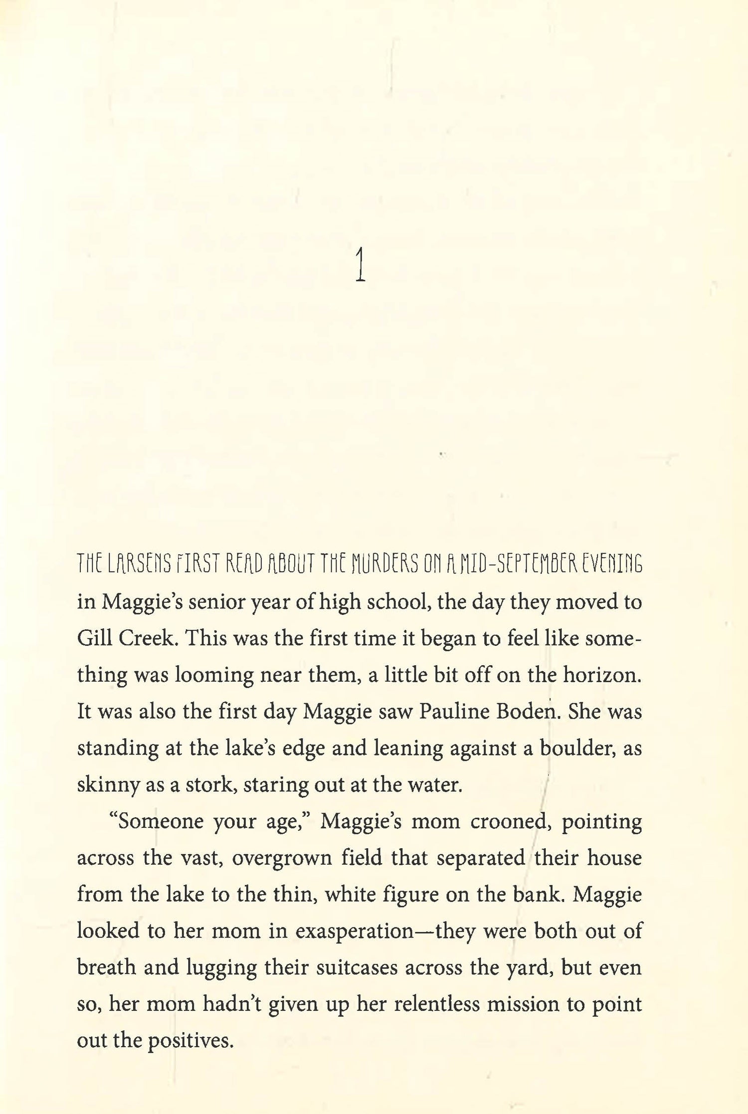 For Maggie Larsen, the town of Gill Creek is only a stopgap before college and freedom. Until she meets Pauline and Liam. What starts as an uneventful year suddenly changes. Someone is killing teenage girls, and the town reels from the tragedy. As Maggie's and Pauline's worlds collide and change around them, they will both experience love and loss. And by the end of the book, only one of them will survive.