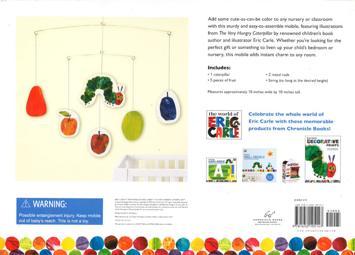 This fun, easy to assemble mobile kit features art from Eric Carle's beloved book, The Very Hungry Caterpillar. With eye popping colour and a simple design, this mobile fits the bill for all kinds of decorating needs, from the nursery to the classroom and beyond!