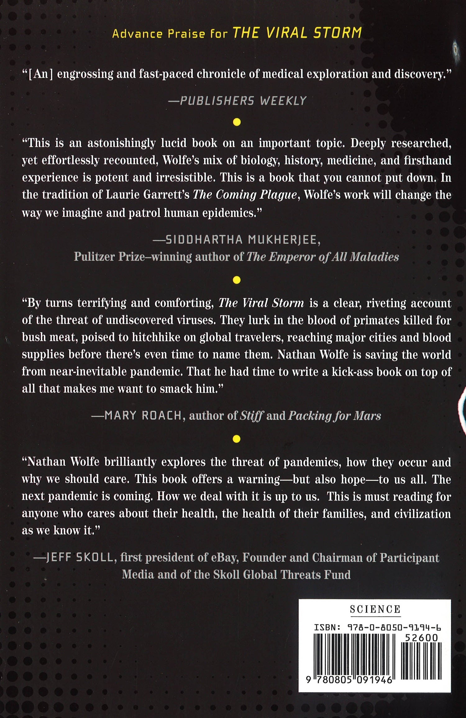 Dynamic young Stanford biologist Nathan Wolfe reveals the surprising origins of the world's most deadly viruses, and how we can overcome catastrophic pandemics. In "The Viral Storm," award-winning biologist Nathan Wolfe tells the story of how viruses and human beings have evolved side by side through history; how deadly viruses like HIV, swine flu, and bird flu almost wiped us out in the past; and why modern life has made our species vulnerable to the threat of a global pandemic. Wolfe's research missions to the jungles of Africa and the rain forests of Borneo have earned him the nickname "the Indiana Jones of virus hunters," and here Wolfe takes readers along on his groundbreaking and often dangerous research trips--to reveal the surprising origins of the most deadly diseases and to explain the role that viruses have played in human evolution. In a world where each new outbreak seems worse than the one before, Wolfe points the way forward, as new technologies are brought to bear in the most remote areas of the world to neutralize these viruses and even harness their power for the good of humanity. His provocative vision of the future will change the way we think about viruses, and perhaps remove a potential threat to humanity's survival.