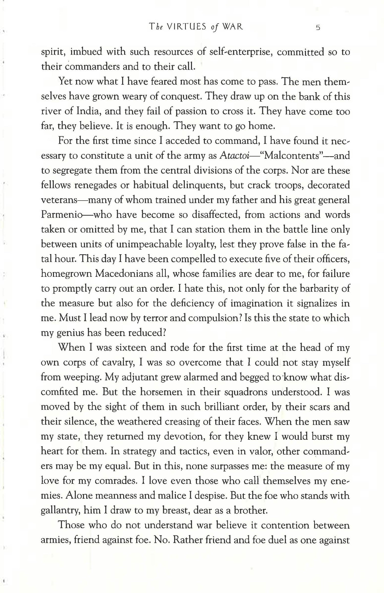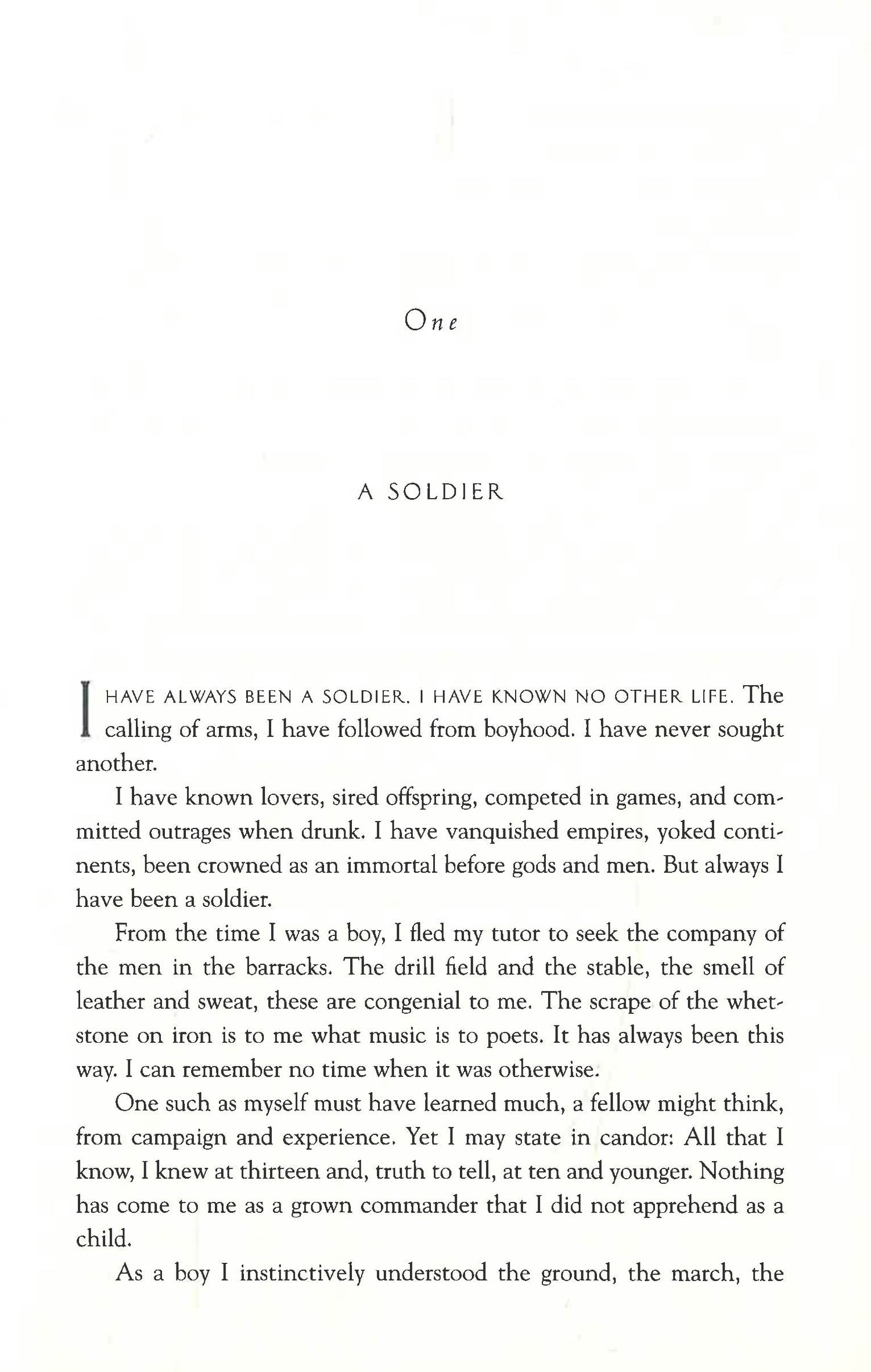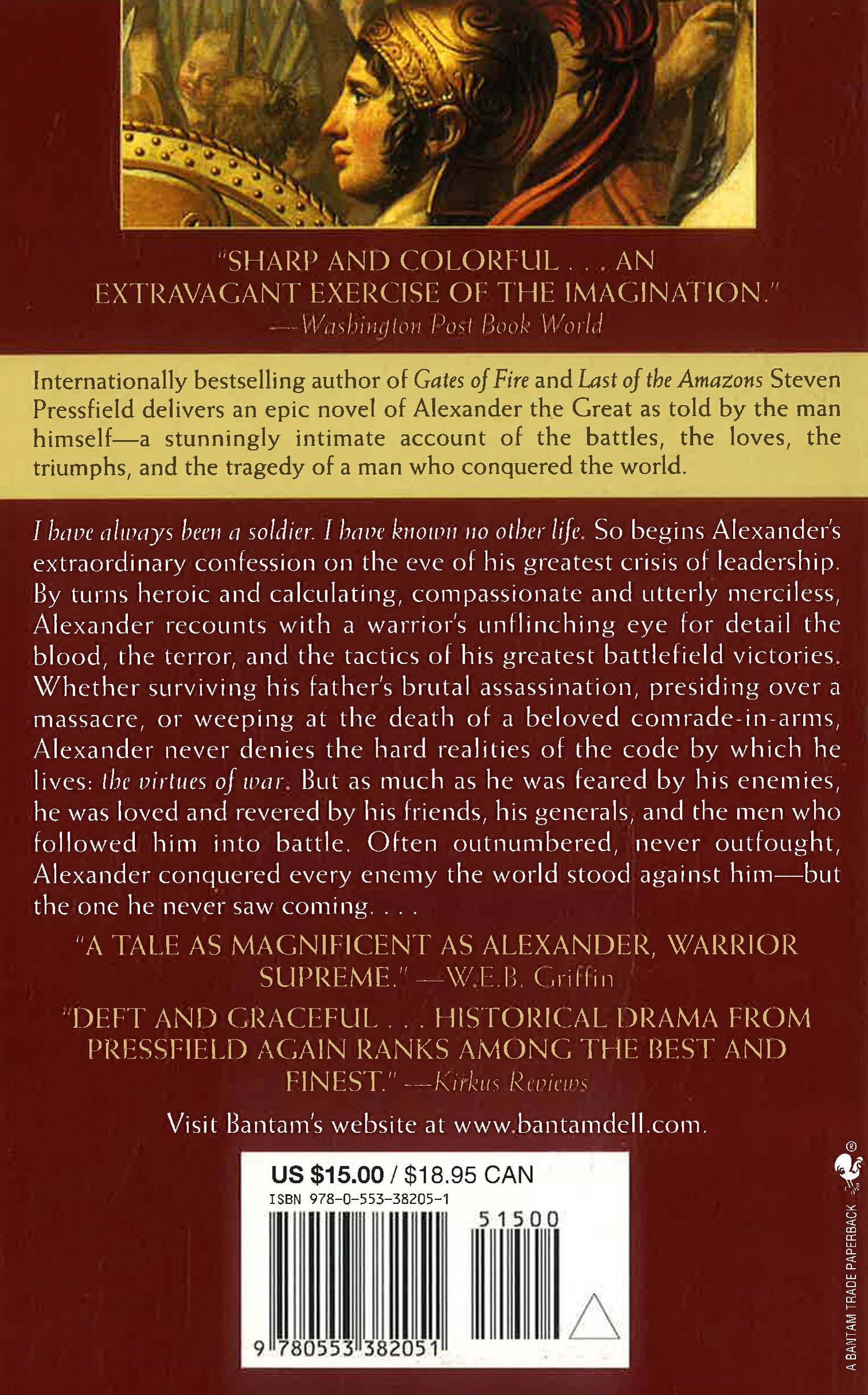 I have always been a soldier. I have known no other life. So begins Alexander's extraordinary confession on the eve of his greatest crisis of leadership. By turns heroic and calculating, compassionate and utterly merciless, Alexander recounts with a warrior's unflinching eye for detail the blood, the terror, and the tactics of his greatest battlefield victories. Whether surviving his father's brutal assassination, presiding over a massacre, or weeping at the death of a beloved comrade-in-arms, Alexander never denies the hard realities of the code by which he lives: the virtues of war. But as much as he was feared by his enemies, he was loved and revered by his friends, his generals, and the men who followed him into battle. Often outnumbered, never outfought, Alexander conquered every enemy the world stood against him-but the one he never saw coming. . . .