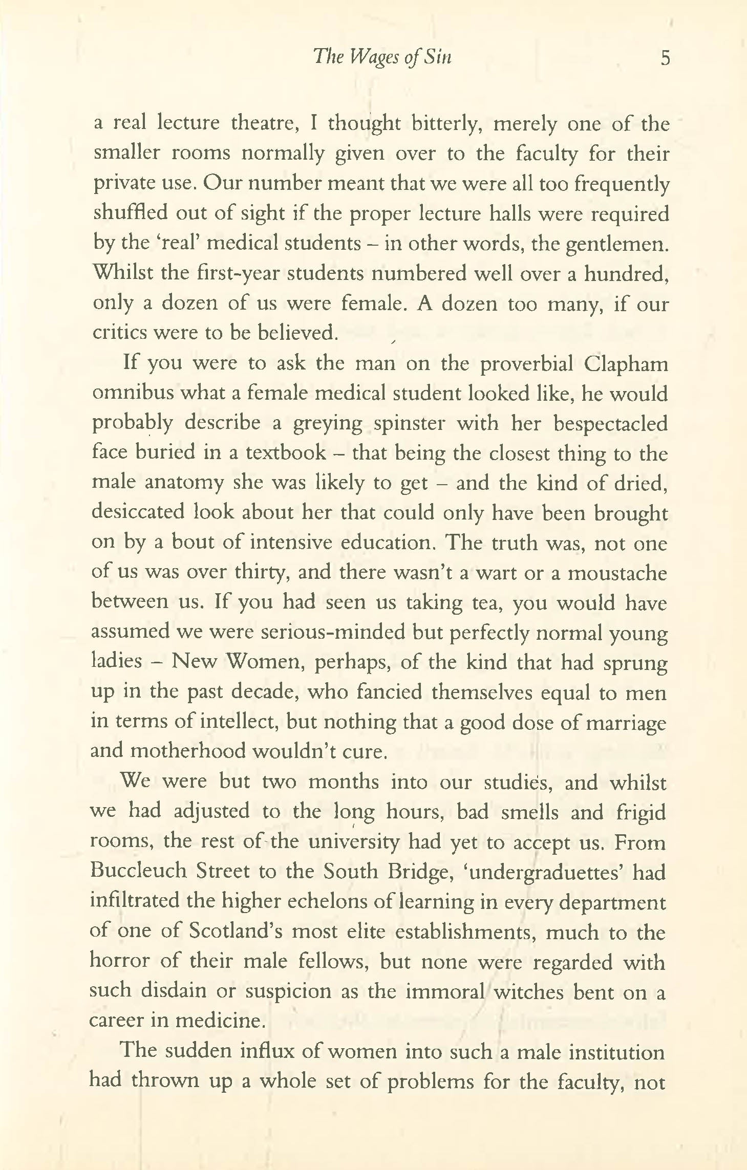 Sarah Gilchrist has fled from London to Edinburgh in disgrace and is determined to become a doctor, despite the misgivings of her family and society. As part of the University of Edinburgh's first intake of female medical students, Sarah comes up against resistance from lecturers, her male contemporaries, and - perhaps worst of all - her fellow women, who will do anything to avoid being associated with a fallen woman...
