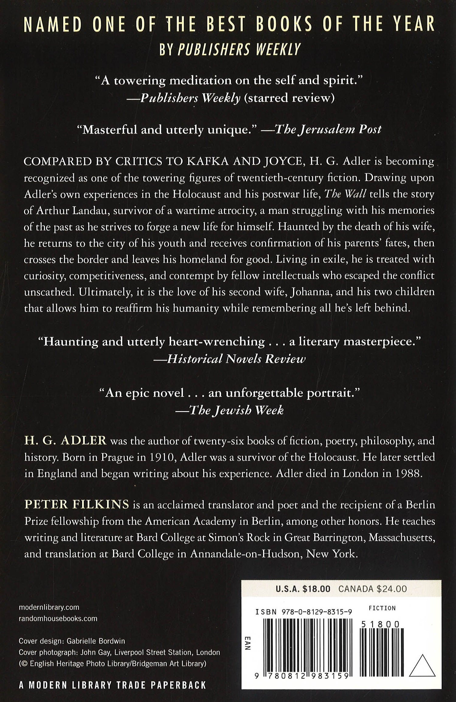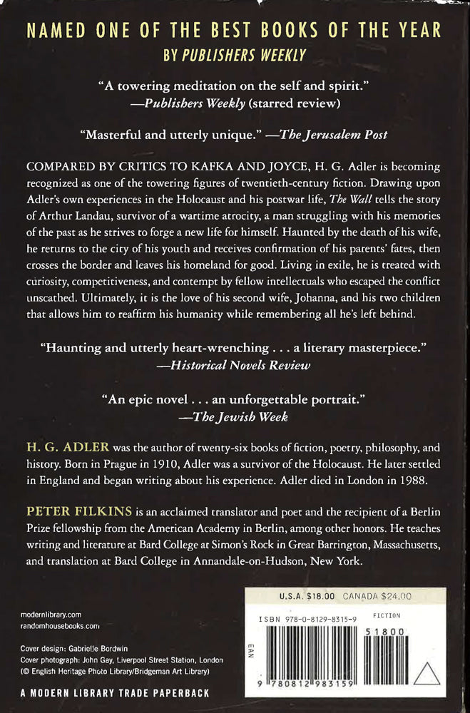 NAMED ONE OF THE BEST BOOKS OF THE YEAR BY PUBLISHERS WEEKLY Compared by critics to Kafka, Joyce, and Musil, H. G. Adler is becoming recognized as one of the towering figures of twentieth-century fiction. Nobel Prize winner Elias Canetti wrote that "Adler has restored hope to modern literature," and the first two novels rediscovered after his death, Panorama and The Journey, were acclaimed as "modernist masterpieces" by The New Yorker. Now his magnum opus, The Wall, the final installment of Adler's Shoah trilogy and his crowning achievement as a novelist, is available for the first time in English. Drawing upon Adler's own experiences in the Holocaust and his postwar life, The Wall, like the other works in the trilogy, nonetheless avoids detailed historical specifics. The novel tells the story of Arthur Landau, survivor of a wartime atrocity, a man struggling with his nightmares and his memories of the past as he strives to forge a new life for himself. Haunted by the death of his wife, Franziska, he returns to the city of his youth and receives confirmation of his parents' fates, then crosses the border and leaves his homeland for good. Embarking on a life of exile, he continues searching for his place within the world. He attempts to publish his study of the victims of the war, yet he is treated with curiosity, competitiveness, and contempt by fellow intellectuals who escaped the conflict unscathed. Afflicted with survivor's guilt, Arthur tries to leave behind the horrors of the past and find a foothold in the present. Ultimately, it is the love of his second wife, Johanna, and his two children that allows him to reaffirm his humanity while remembering all he's left behind. The Wall is a magnificent epic of survival and redemption, powerfully told through stream of consciousness and suffused with daydream, fantasy, memory, nightmare, and pure imagination. More than a portrait of a Holocaust survivor's journey, it is a universal novel about recovering from the traumas of the past and finding a way to live again. Praise for The Wall"[A] majestic novel . . . Adler's prose is tidal, surge after narrative surge rushing forward and then enigmatically receding, the moment displaced by memory, and memory by introspective soliloquy."--Cynthia Ozick, The New York Times Book Review "A towering meditation on the self and spirit . . . The writing is sonorous and so entirely devastating that the reader is compelled to pore over every word."--Publishers Weekly (starred review)"Masterful and utterly unique."--The Jerusalem Post "Haunting and utterly heart-wrenching . . . a literary masterpiece."--Historical Novels Review "An epic novel . . . an unforgettable portrait."--The Jewish Week "[A] pensive portrait of a man struggling to find a place in the world after enduring transformative calamity . . . an eloquent record of suffering--and perhaps of redemption as well."--Kirkus Reviews Praise for H. G. Adler's novels The Journey and Panorama, translated by Peter Filkins "Modernist masterpieces worthy of comparison to those of Kafka or Musil."--The New Yorker "Haunting . . . as remarkable for its literary experimentation as for its historical testimony."--San Francisco Chronicle, on Panorama