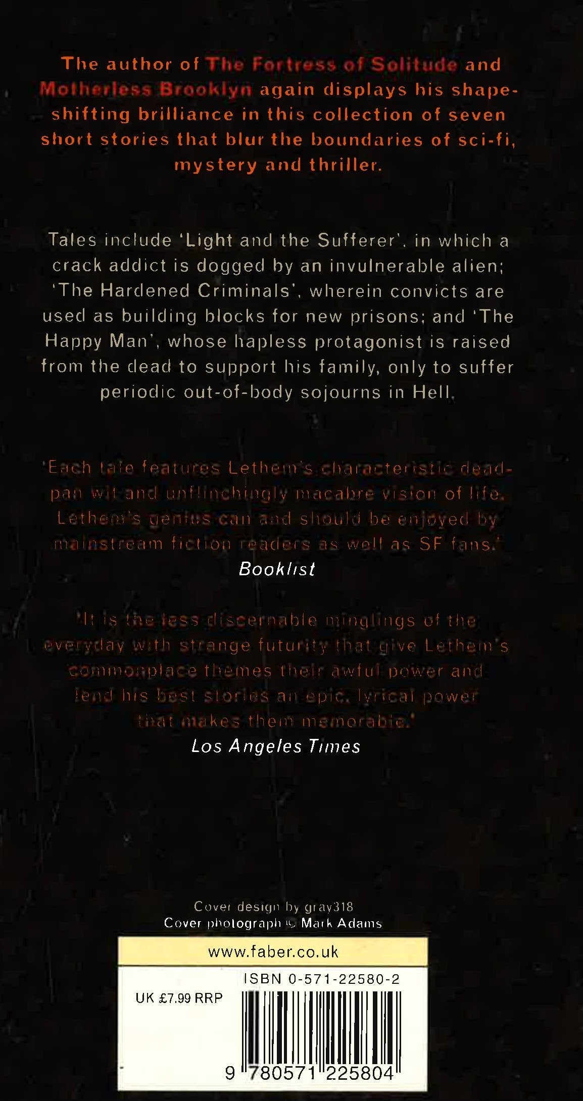 Jonathan Lethem again displays his brilliance in this collection of seven short stories, blurring the boundaries of sci-fi, mystery, and thriller. Tales include 'Light and the Sufferer', in which a crack addict is dogged by an invulnerable alien; 'The Hardened Criminals', wherein convicts are used as building blocks for new prisons; and 'The Happy Man', whose hapless protagonist is raised from the dead to support his family, only to suffer periodic out-of-body sojourns in Hell. Each tale features Lethem's characteristic deadpan wit and unflinchingly macabre vision of life.