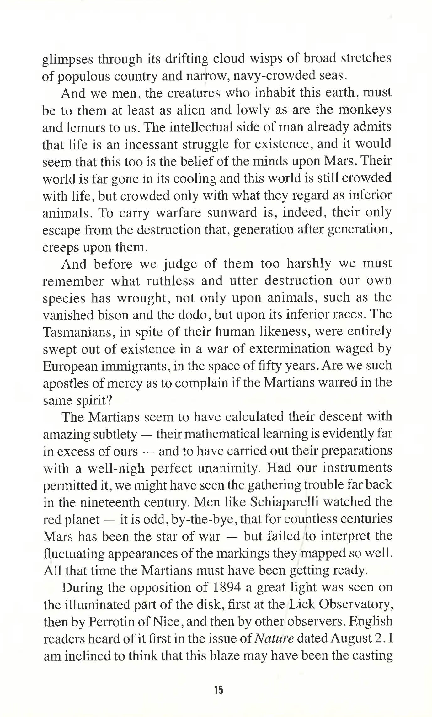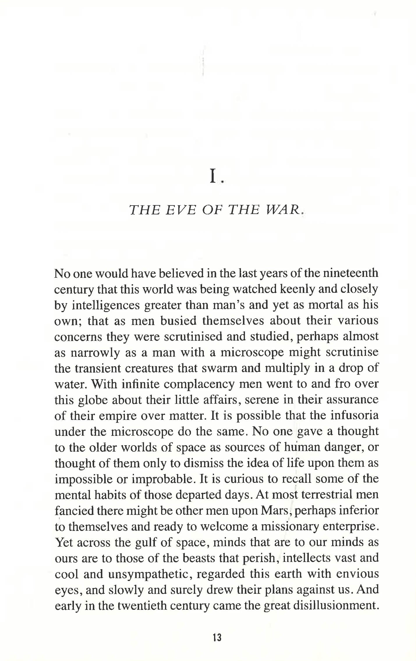 Yet across the gulf of space, minds that are to our minds as ours are to those of the beasts that perish, intellects vast and cool and unsympathetic, regarded this earth with envious eyes, and slowly and surely drew their plans against us.