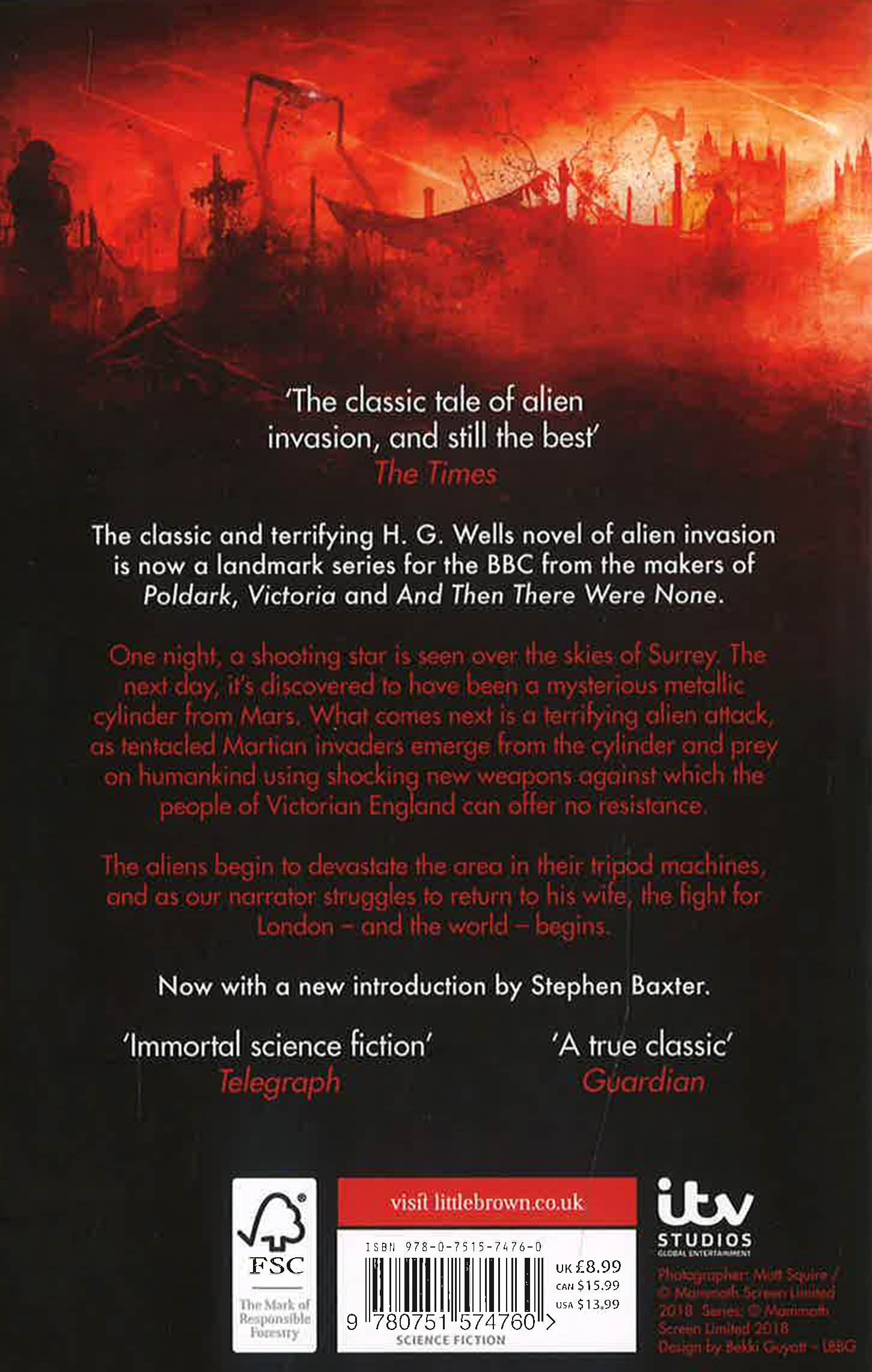 The classic and terrifying HG Wells novel of alien invasion is now a landmark series for the BBC from the makers of Poldark, Victoria and And Then There Were None. One night a shooting star is seen over the skies of Surrey. The next day, it's discovered to have been a mysterious metallic cylinder from Mars. What comes next is a terrifying alien attack, as tentacled Martian invaders emerge from the cylinder and prey on humankind using shocking new weapons against which the people of Victorian England can offer no resistance.The aliens begin to devastate the area in their tripod machines, and as our narrator struggles to return to his wife, the fight for London - and the world - begins. Now with a new introduction by Stephen Baxter.'A true classic'GUARDIAN'Immortal science fiction' TELEGRAPH