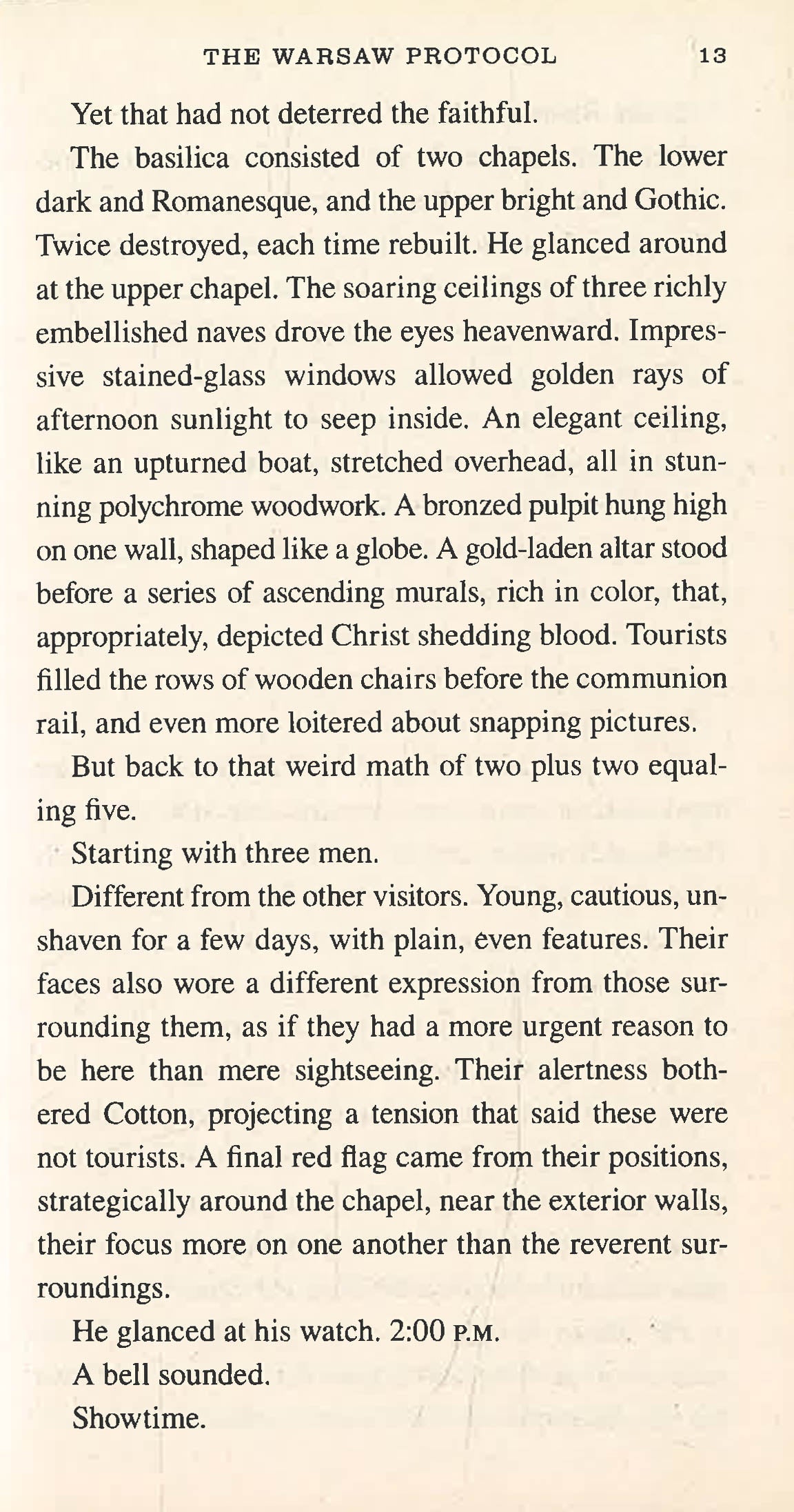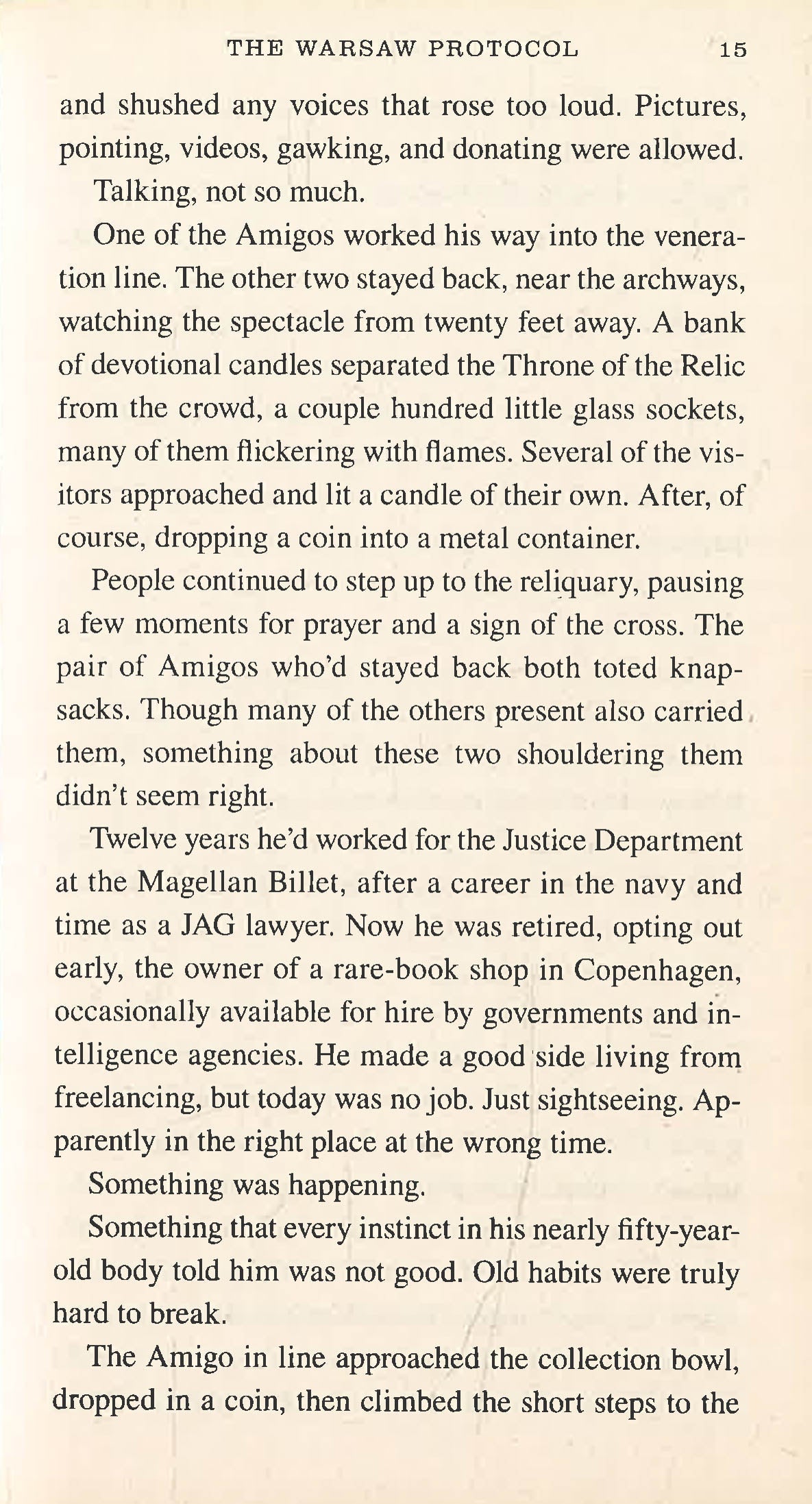 From the tranquil canals of Bruges, to the elegant rooms of Wawel Castle, to deep beneath the earth into an ancient Polish salt mine, Malone is caught in the middle of a deadly war—the outcome of which turns on a secret known as the Warsaw Protocol.