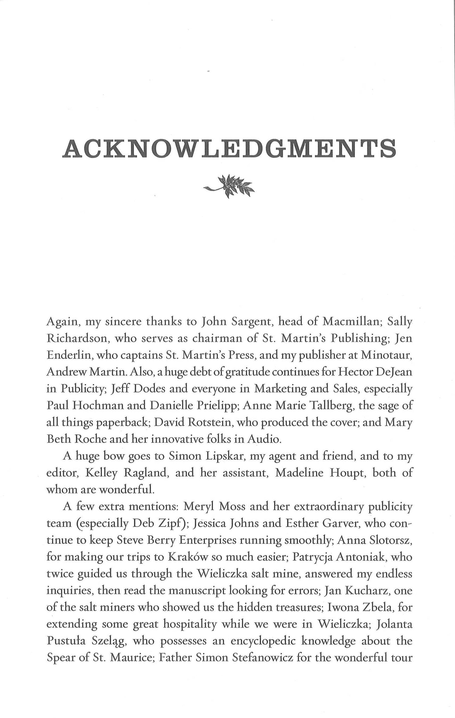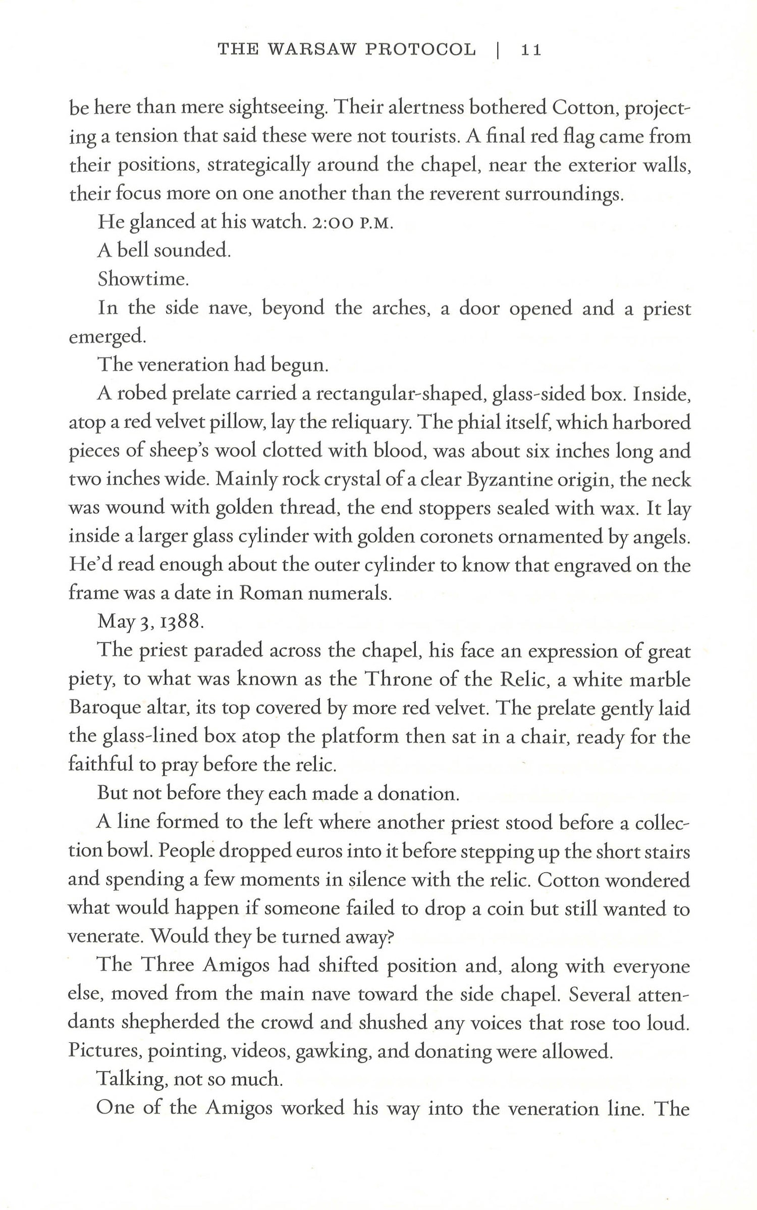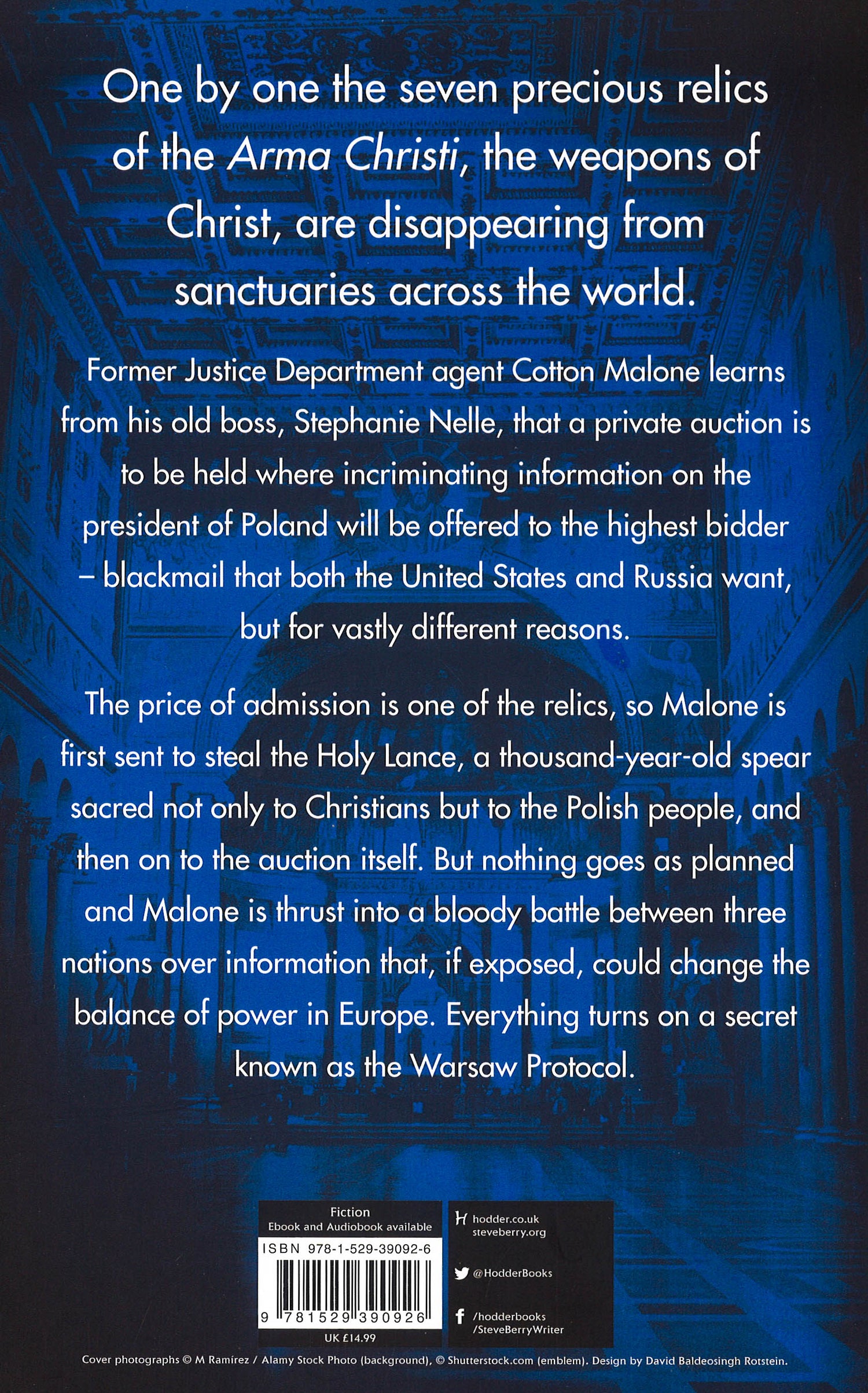 In the latest thrilling Cotton Malone adventure from international bestseller Steve Berry, one by one the seven precious relics of the Arma Christi, the weapons of Christ, are disappearing from sanctuaries across the world.After former Justice Department agent Cotton Malone witnesses the theft of one of them, he learns from his old boss, Stephanie Nelle, that a private auction is about to be held where incriminating information on the president of Poland will be offered to the highest bidder - blackmail that both the United States and Russia want, but for vastly different reasons.The price of admission to that auction is one of the relics, so Malone is first sent to a castle in Poland to steal the Holy Lance, a thousand-year-old spear sacred not only to Christians but to the Polish people, and then on to the auction itself. But nothing goes as planned and Malone is thrust into a bloody battle between three nations over information that, if exposed, could change the balance of power in Europe.From the tranquil canals of Bruges, to the elegant rooms of Wawel Castle, to deep beneath the earth in an ancient Polish salt mine, Malone is caught in the middle of a deadly war - the outcome of which turns on a secret known as the Warsaw Protocol.