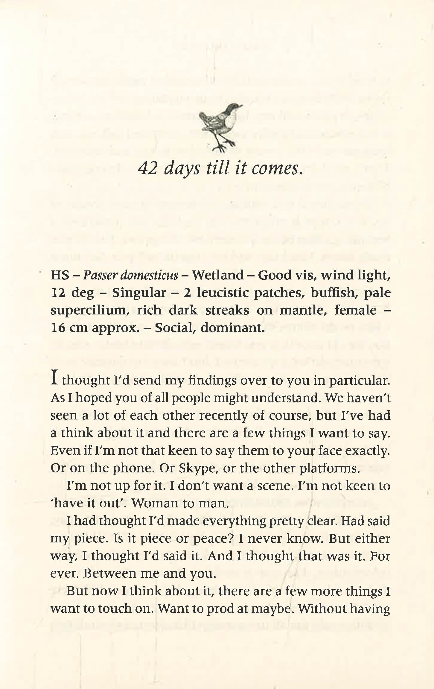 Lily Gullick lives with her husband Aiden in a new-build flat opposite an estate which has been marked for demolition. A keen birdwatcher, she can't help spying on her neighbours.