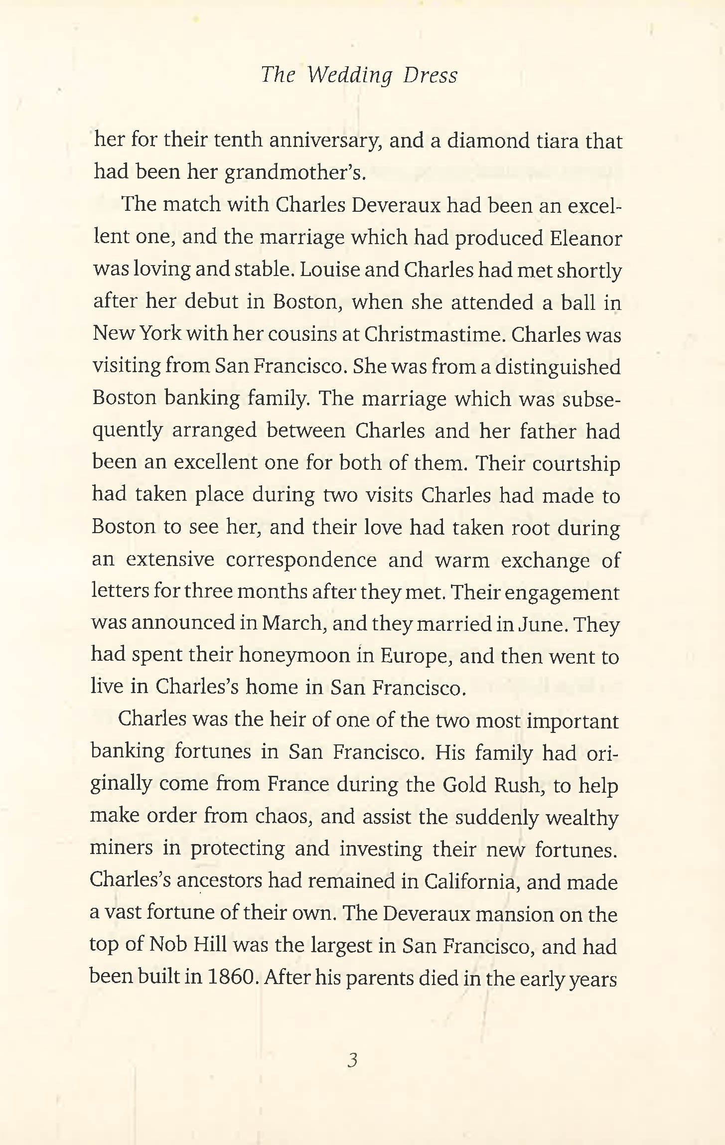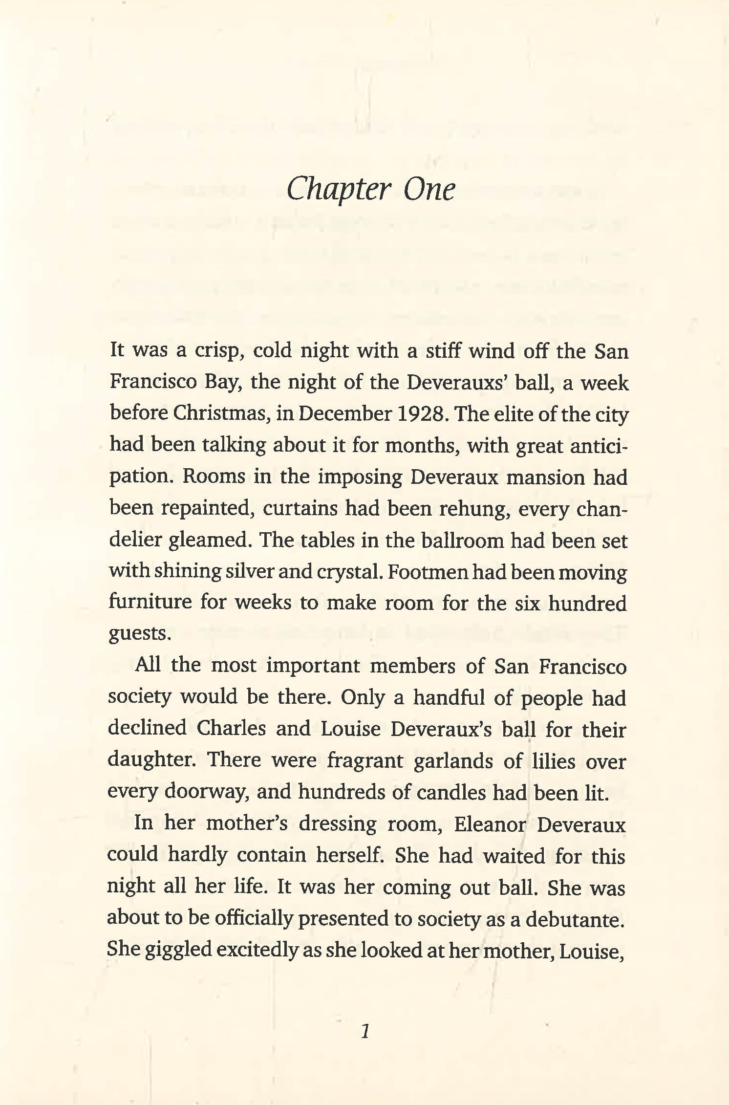 The Deveraux family were among the most important members of 1920s San Francisco society, and the wedding of their daughter Eleanor to wealthy banker Alexander Allen would be the highlight of the 1929 social calendar. The wedding, held in the family’s magnificent Pacific Heights mansion, was everything they’d hoped, and Eleanor’s dress was a triumph. Designed by one of the most famous fashion houses in Paris, it was exquisite in every way. But the dream life, along with the most perfect honeymoon in Europe, was about to come to an end when Alex received news of the Wall Street Crash. It appeared that the family had lost everything . . .