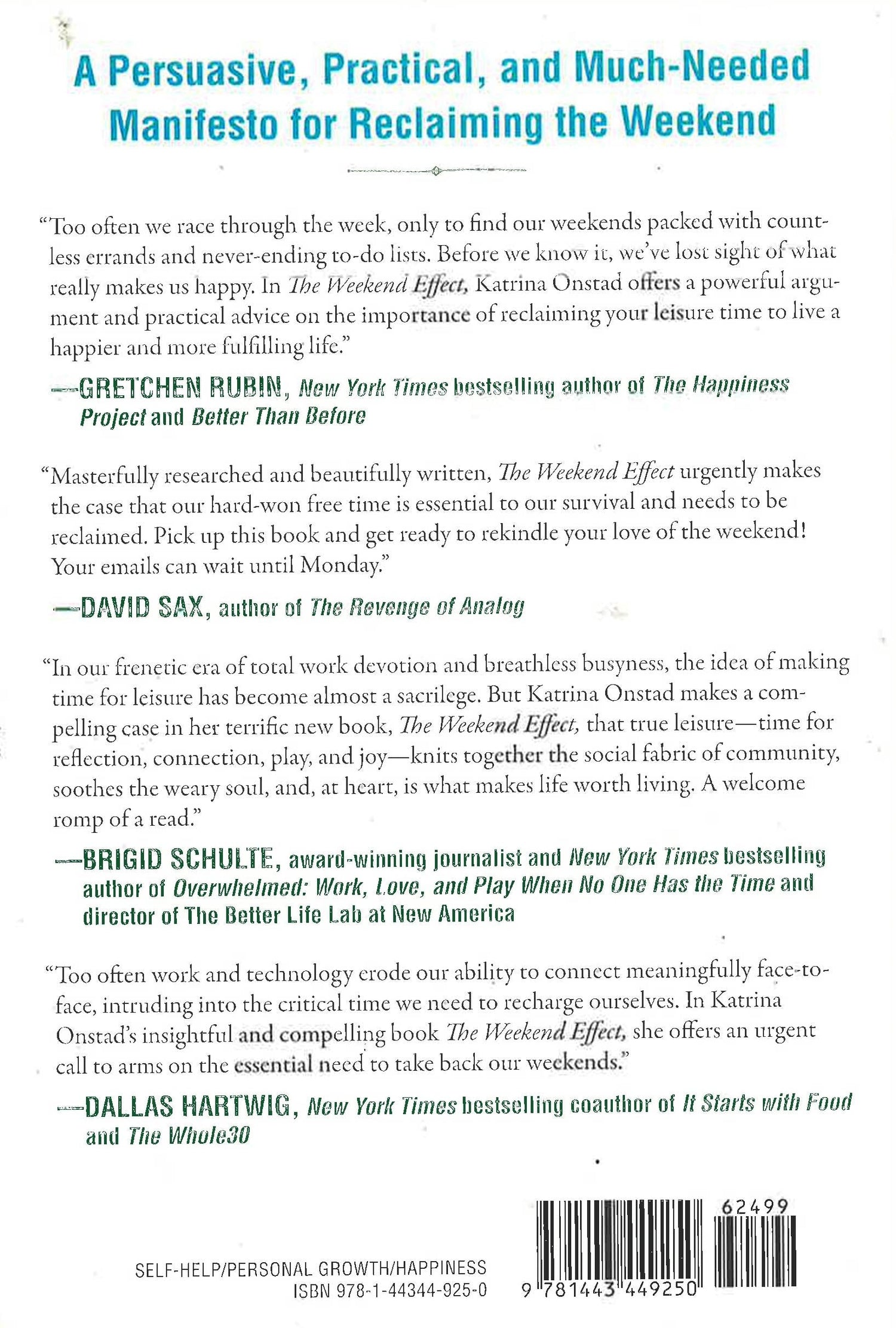 The weekend - the once-sacred forty-eight hours of leisure - has been lost to overbooked schedules, pinging devices and encroaching work demands. Many of us are working more hours than we did a decade ago, and worse, we allow those hours to slide over seven days a week, giving us no respite to tune out and recharge.We don’t need the research to tell us that this is hurting us. Our health is deteriorating, our social networks (the face-to-face kind) are weak and our productivity is down. It wasn’t long ago that working less and living more was considered a virtue. So what happened?In The Weekend Effect, journalist Katrina Onstad, herself suffering from Sunday-night letdown, digs into the history, the positive psychology and the cultural anthropology of the great missing weekend. She pushes back against the all-work, no-fun ethos and follows the trail of people, companies and countries who are vigilantly protecting their weekends for joy, for adventure and, most important, for meaning. Readers of The Happiness Project, All Joy and No Fun and Thrive will find personal and business inspiration in Onstad’s well-researched argument to re-frame our weekends.