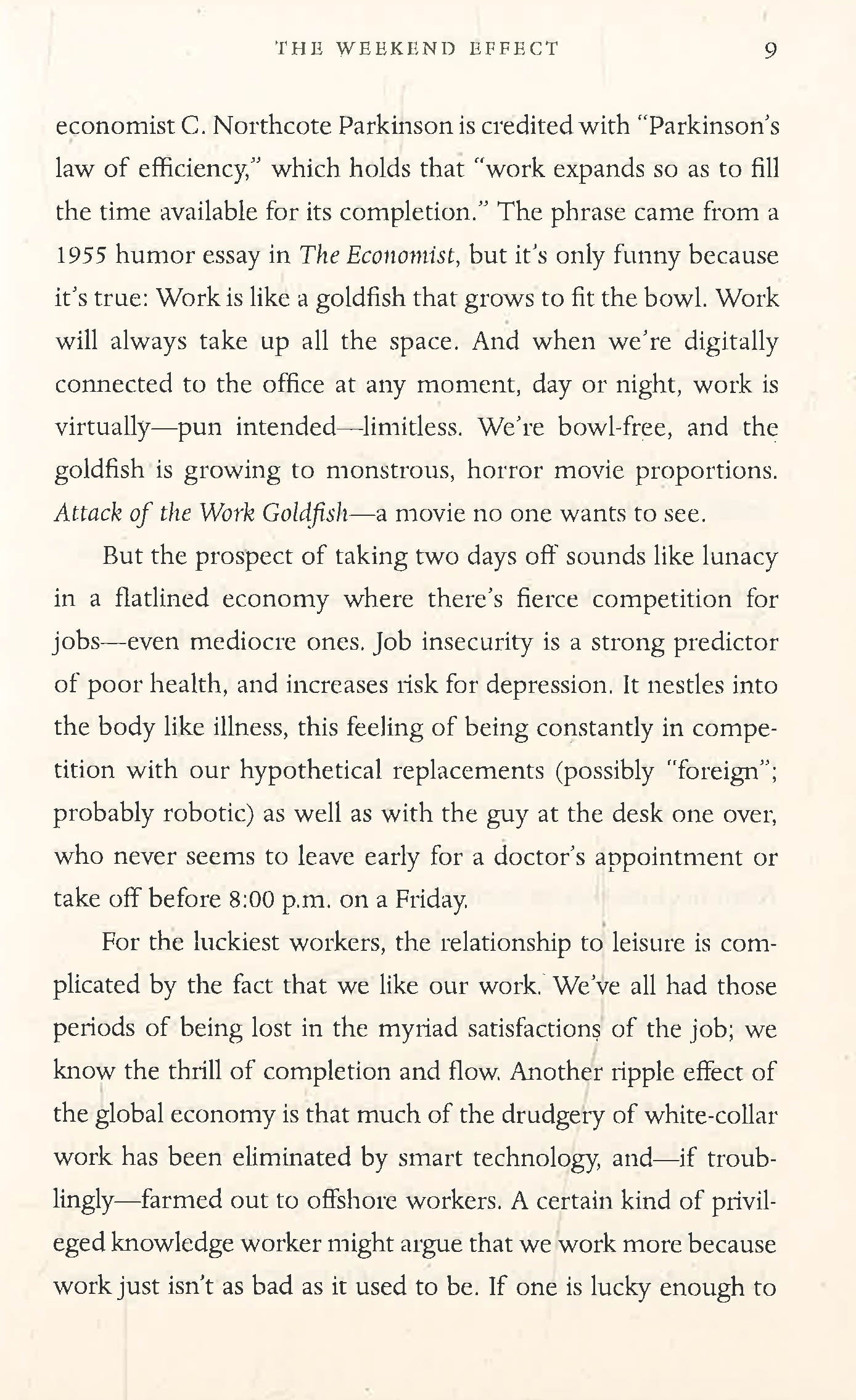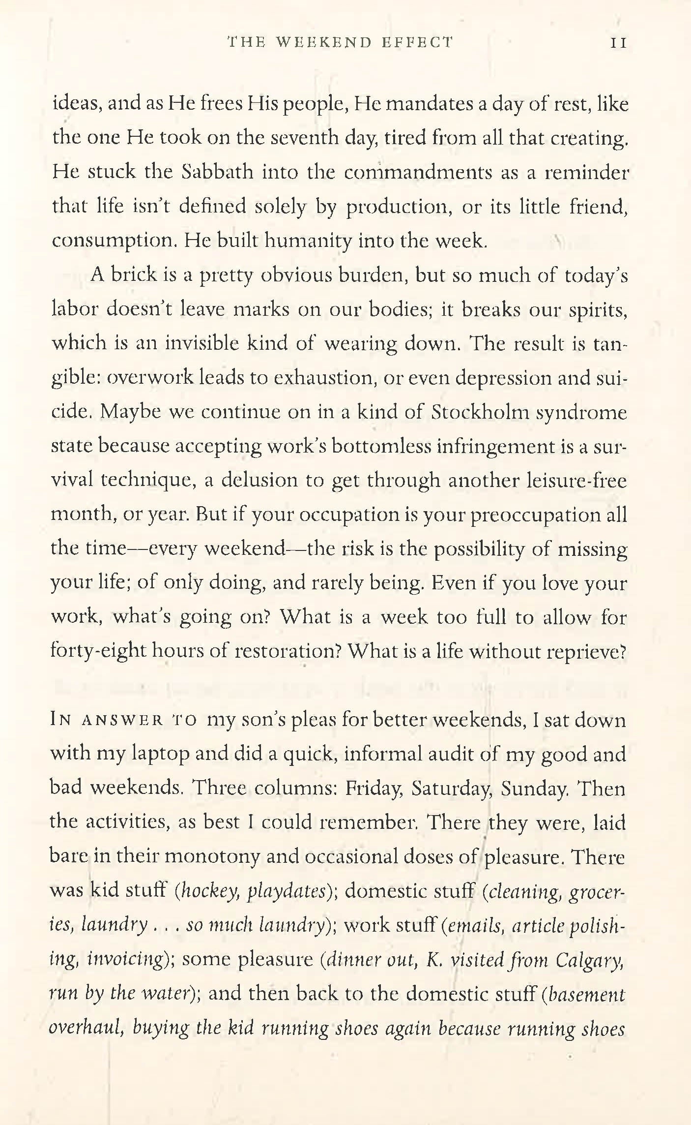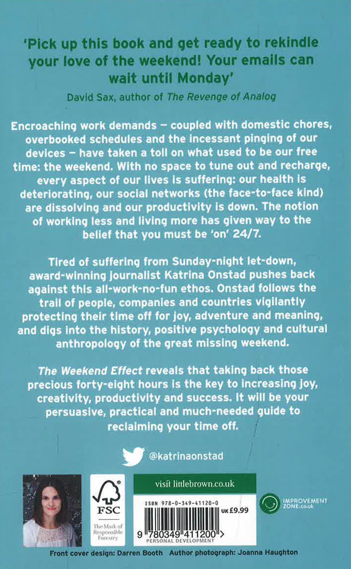 A powerful argument, and practical advice, on the importance of reclaiming your leisure time to live a happier and more fulfilling life' - Gretchen Rubin, New York Times bestselling author of Better Than Before and The Happiness ProjectEncroaching work demands - coupled with domestic chores, overbooked schedules, and the incessant pinging of our devices - have taken a toll on what used to be our free time: the weekend. With no space to tune out and recharge, every aspect of our lives is suffering: our health is deteriorating, our social networks (the face-to-face kind) are dissolving and our productivity is down. The notion of working less and living more has given way to the belief that you must be 'on' 24/7.Tired of suffering from Sunday-night let down, award-winning journalist Katrina Onstad pushes back against this all-work-no-fun ethos. Onstad follows the trail of people, companies and countries vigilantly protecting their time off for joy, adventure and meaning, and digs into the history, positive psychology and cultural anthropology of the great missing weekend. The Weekend Effect reveals that taking back those precious forty-eight hours is the key to increasing joy, creativity, productivity and success. It will be your persuasive, practical and much-needed guide to reclaiming your time off and, ultimately, saving yourself.
