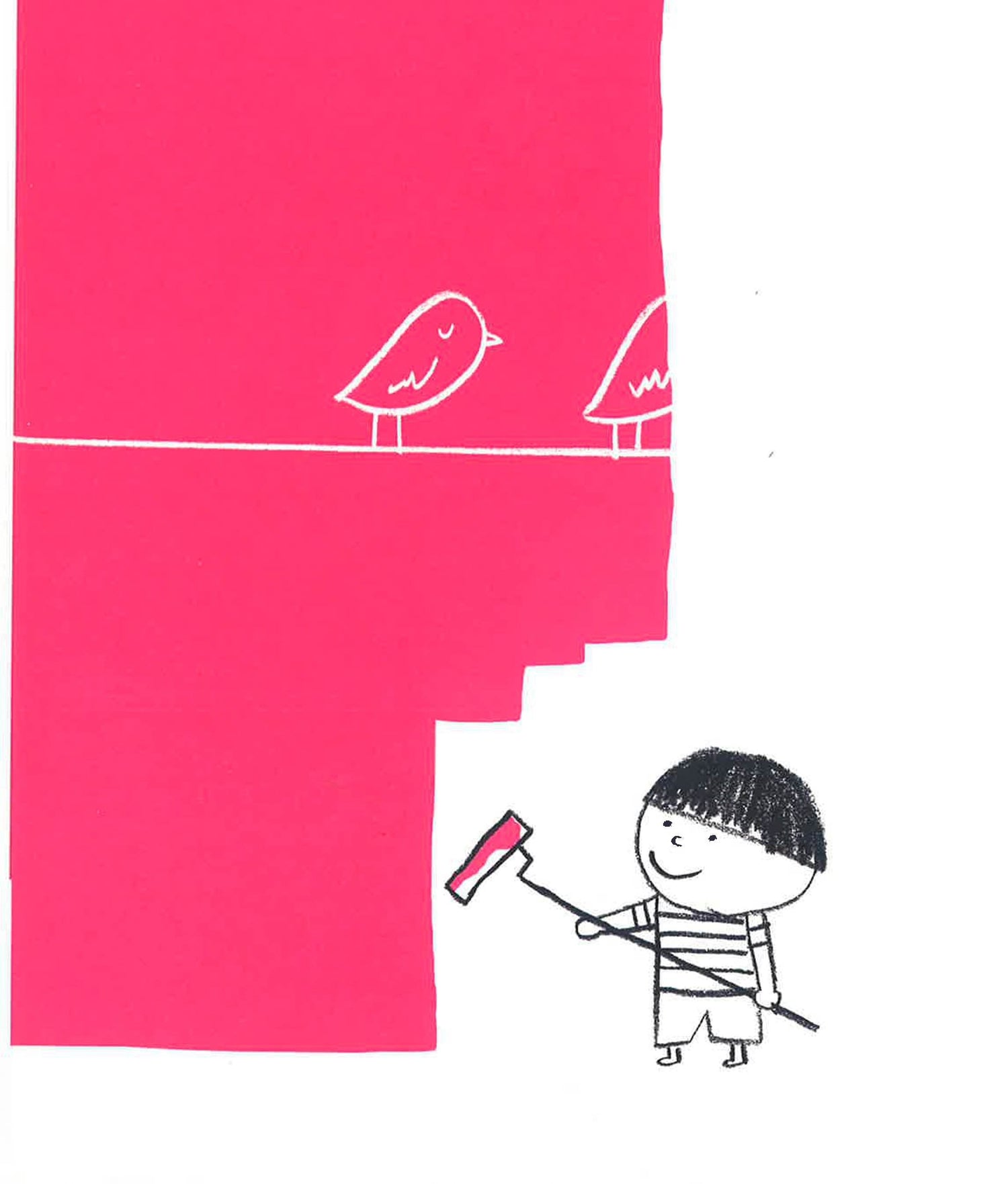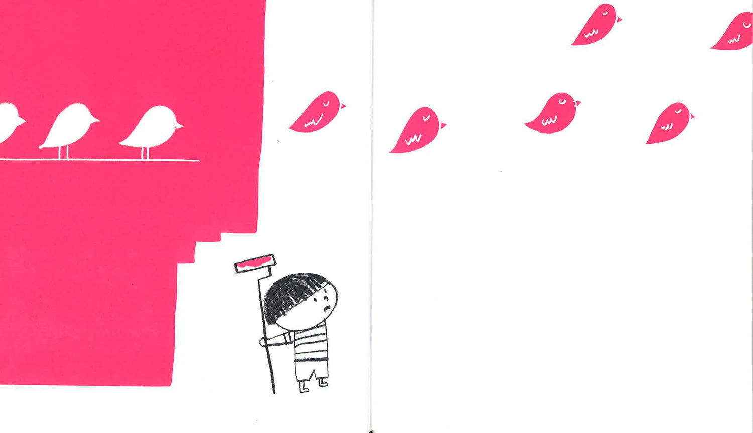 No words are needed--and unexpected things can happen--when a boy, some bold paint, an active imagination, and a white wall come together. Roller in hand, a boy starts to paint a blank wall. First it's a plain coat of pink. Then six birds emerge, perched on a branch. . . . Wait, they were there a minute ago! Then he tries the blue paint, and it happens again: fourteen fish swimming in formation, until green paint reveals a giant dinosaur with big teeth and a mind of its own. Whether gray, yellow, purple, or orange, each spread draws on visual humor and an array of unpredictable animals to yield a bigger surprise, right up to the warm and rewarding finale.