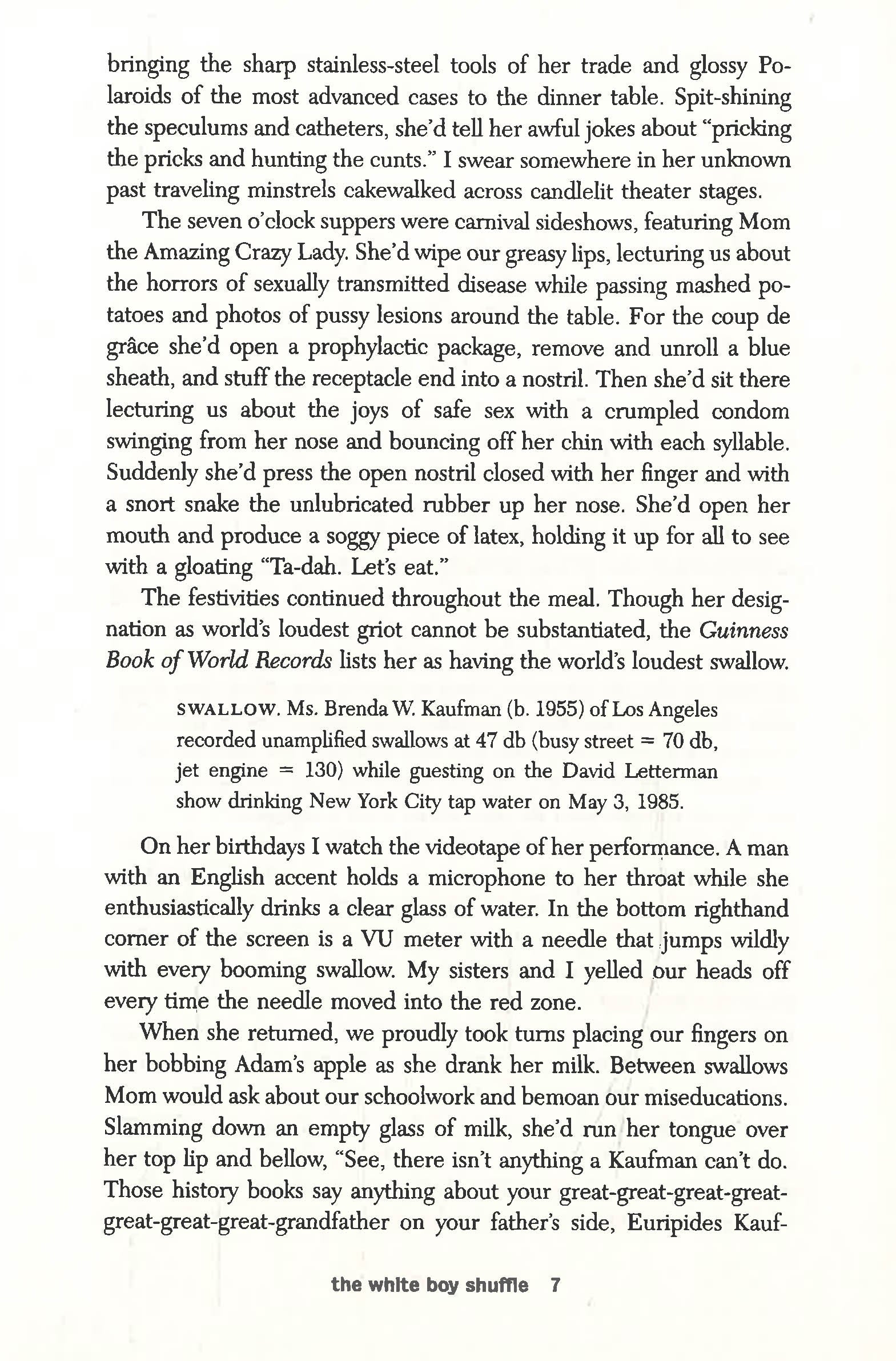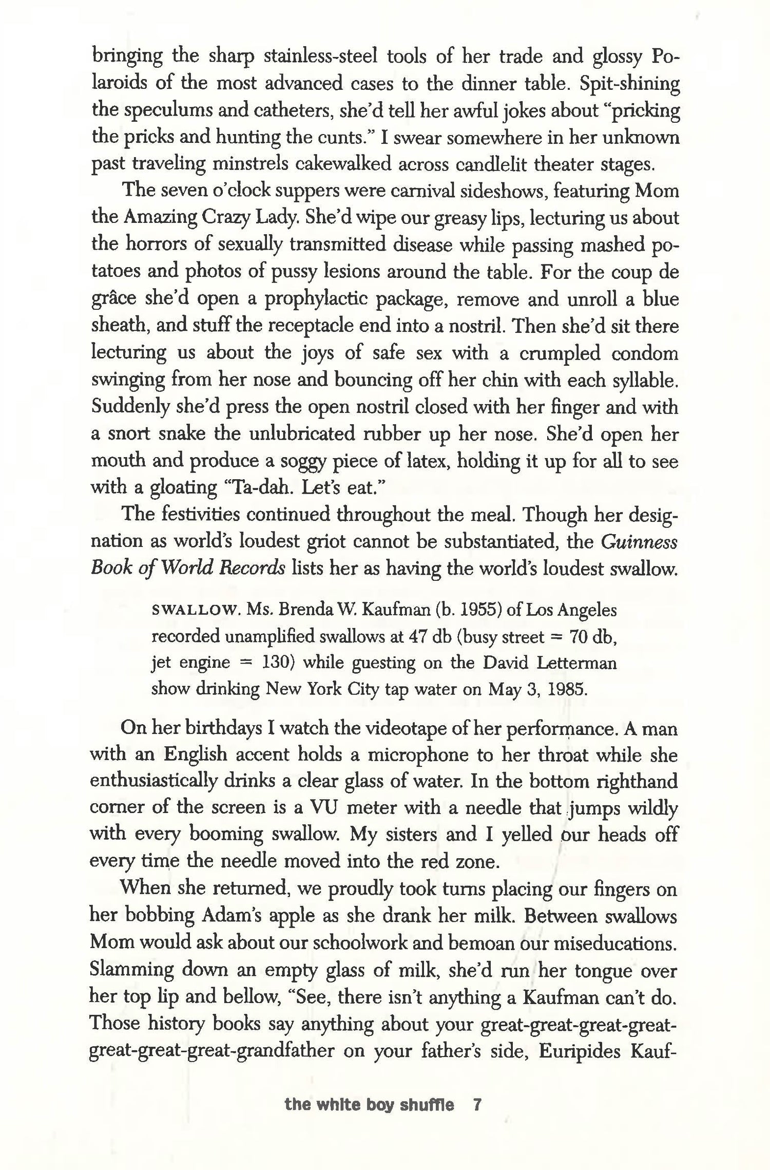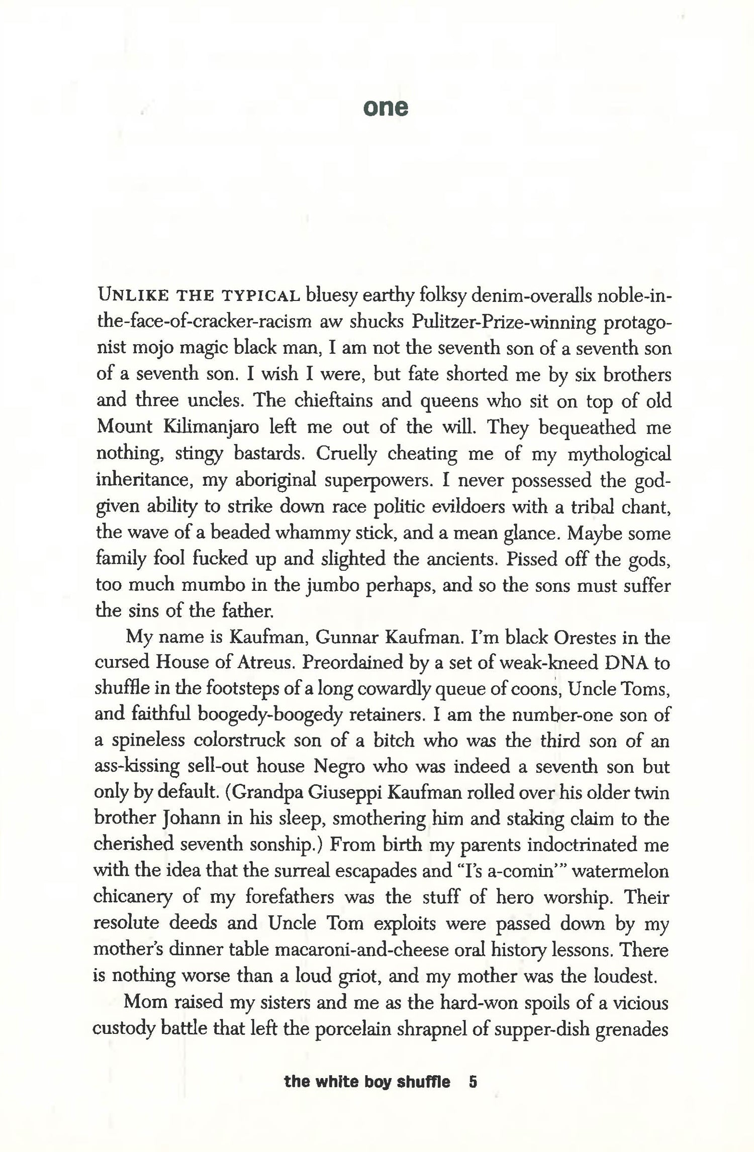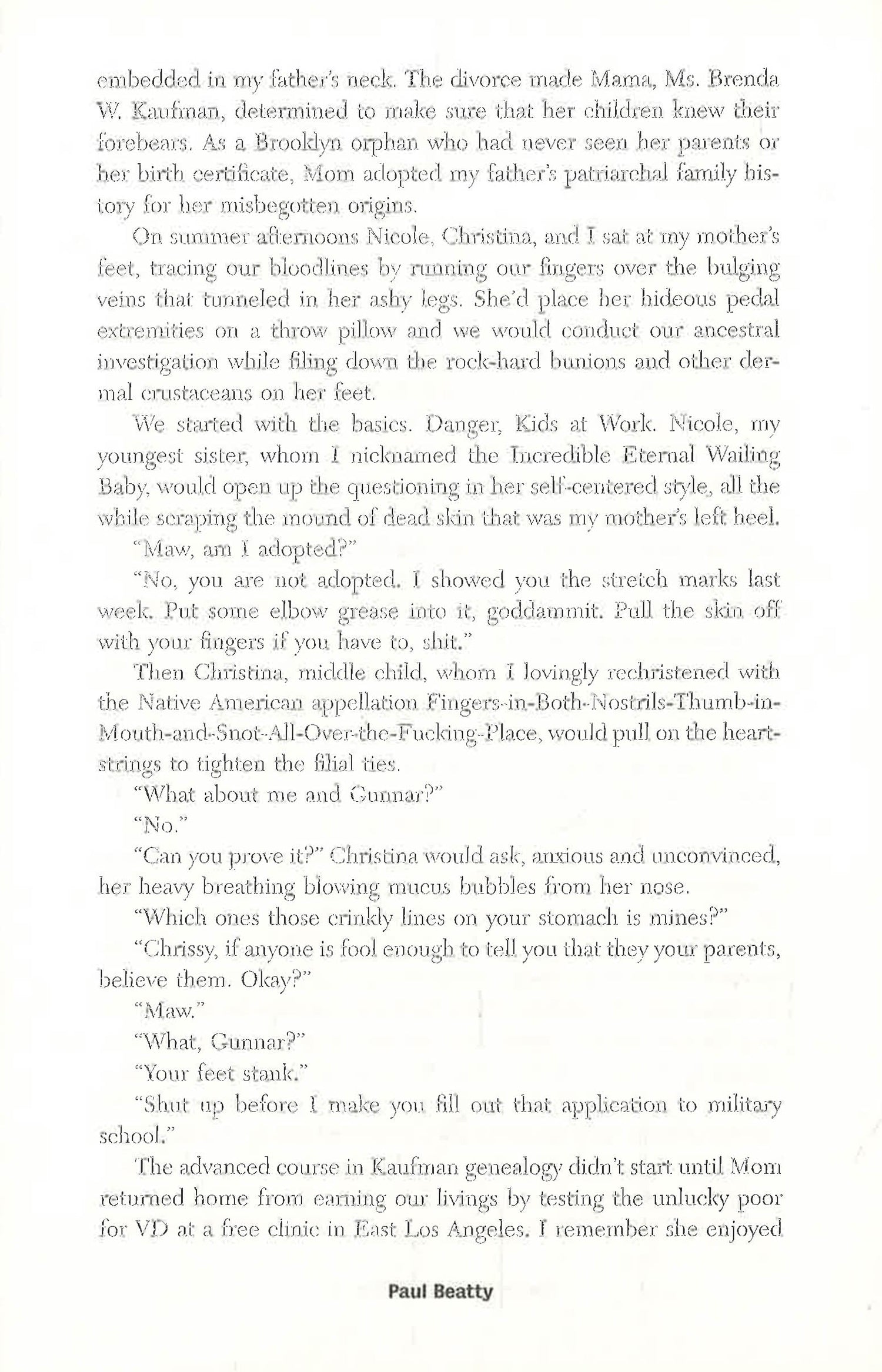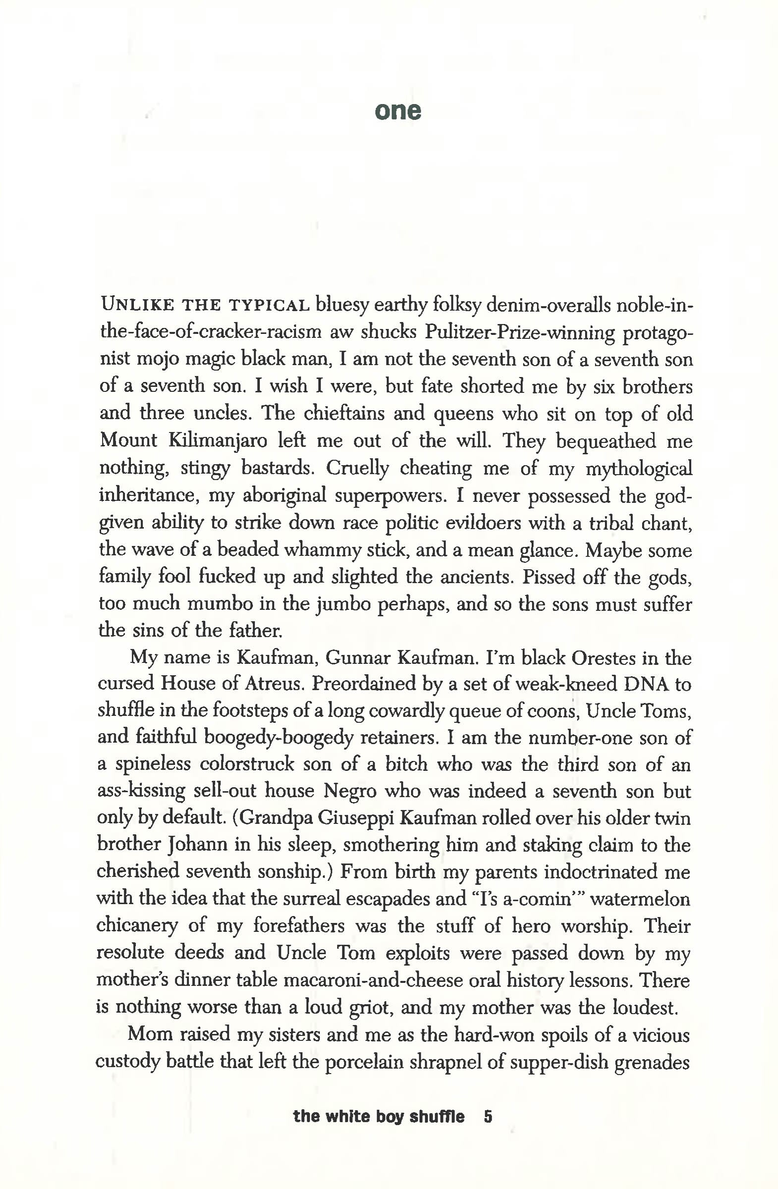 Paul Beatty's hilarious and scathing debut novel is about Gunnar Kaufman, an awkward, black surfer bum who is moved by his mother from Santa Monica to urban West Los Angeles. There, he begins to undergo a startling transformation from neighborhood outcast to basketball superstar, and eventually to reluctant messiah of a "divided, downtrodden people."
