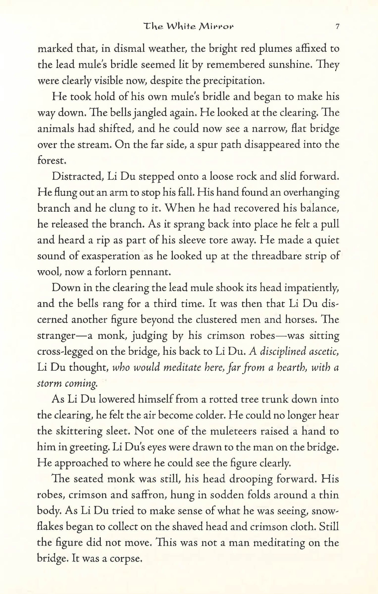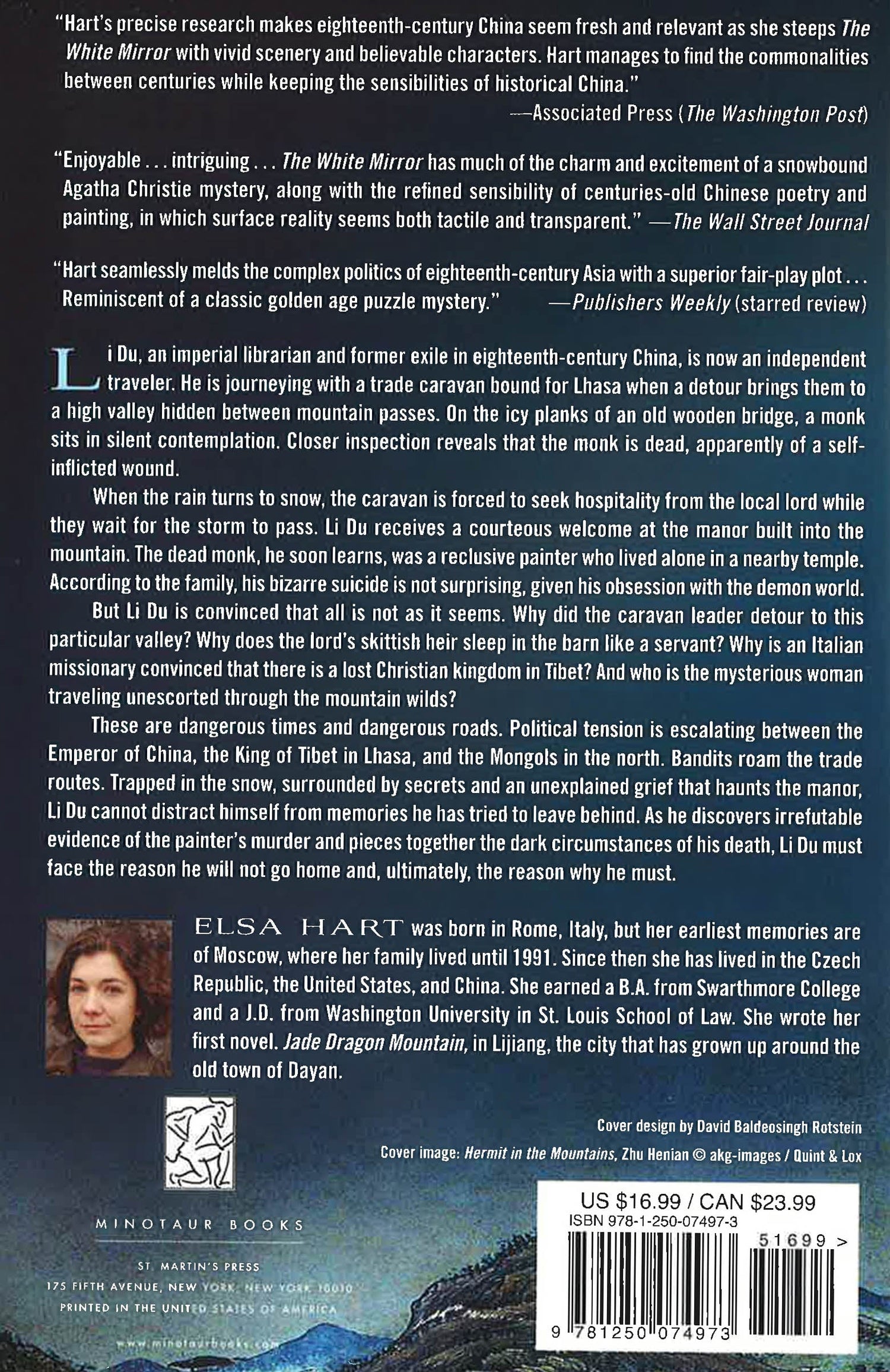 In The White Mirror, the follow-up to Elsa Hart's critically acclaimed debut, Jade Dragon Mountain, Li Du, an imperial librarian and former exile in 18th century China, is now an independent traveler. He is journeying with a trade caravan bound for Lhasa when a detour brings them to a valley hidden between mountain passes. On the icy planks of a wooden bridge, a monk sits in contemplation. Closer inspection reveals that the monk is dead, apparently of a self-inflicted wound. His robes are rent, revealing a strange symbol painted on his chest. When the rain turns to snow, the caravan is forced to seek hospitality from the local lord while they wait for the storm to pass. The dead monk, Li Du soon learns, was a reclusive painter. According to the family, his bizarre suicide is not surprising, given his obsession with the demon world. But Li Du is convinced that all is not as it seems. Why did the caravan leader detour to this particular valley? Why does the lord's heir sleep in the barn like a servant? And who is the mysterious woman traveling through the mountain wilds? Trapped in the snow, surrounded by secrets and an unexplained grief that haunts the manor, Li Du cannot distract himself from memories he's tried to leave behind. As he discovers irrefutable evidence of the painter's murder and pieces together the dark circumstances of his death, Li Du must face the reason he will not go home and, ultimately, the reason why he must. *This book may have remainder mark*