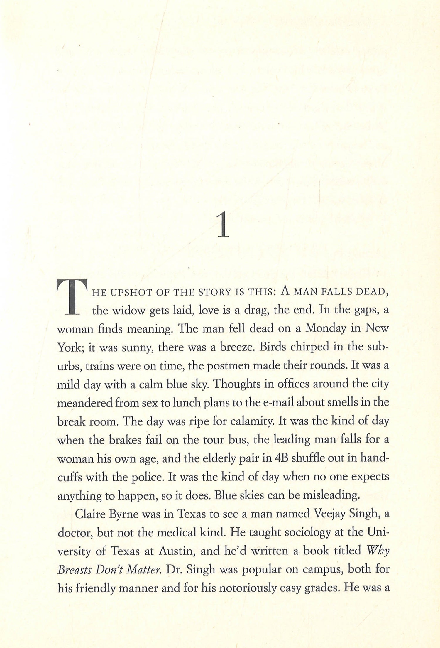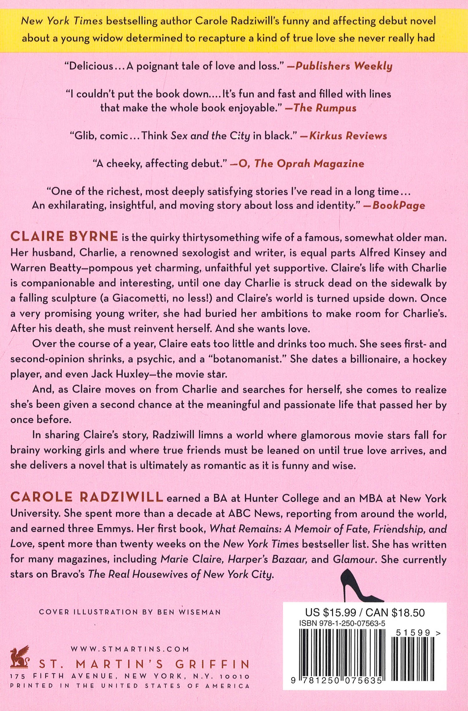 Claire Byrne is a quirky and glamorous 34-year-old Manhattanite and the wife of a famous, slightly older man. Her husband, Charlie, is a renowned sexologist and writer. Equal parts Alfred Kinsey and Warren Beatty, Charlie is pompous yet charming, supportive yet unfaithful; he's a firm believer that sex and love can't coexist for long, and he does little to hide his affairs. Claire's life with Charlie is an always interesting if not deeply devoted one, until Charlie is struck dead one day on the sidewalk by a falling sculpture . . . a Giacometti, no less! Once a promising young writer, Claire had buried her ambitions to make room for Charlie's. After his death, she must reinvent herself. Over the course of a year, she sees a shrink (or two), visits an oracle, hires a "botanomanist," enjoys an erotic interlude (or ten), eats too little, drinks too much, dates a hockey player, dates a billionaire, dates an actor (not any actor either, but the handsome movie star every woman in the world fantasizes about dating). As she grieves for Charlie and searches for herself, she comes to realize that she has an opportunity to find something bigger than she had before - maybe even, possibly, love.