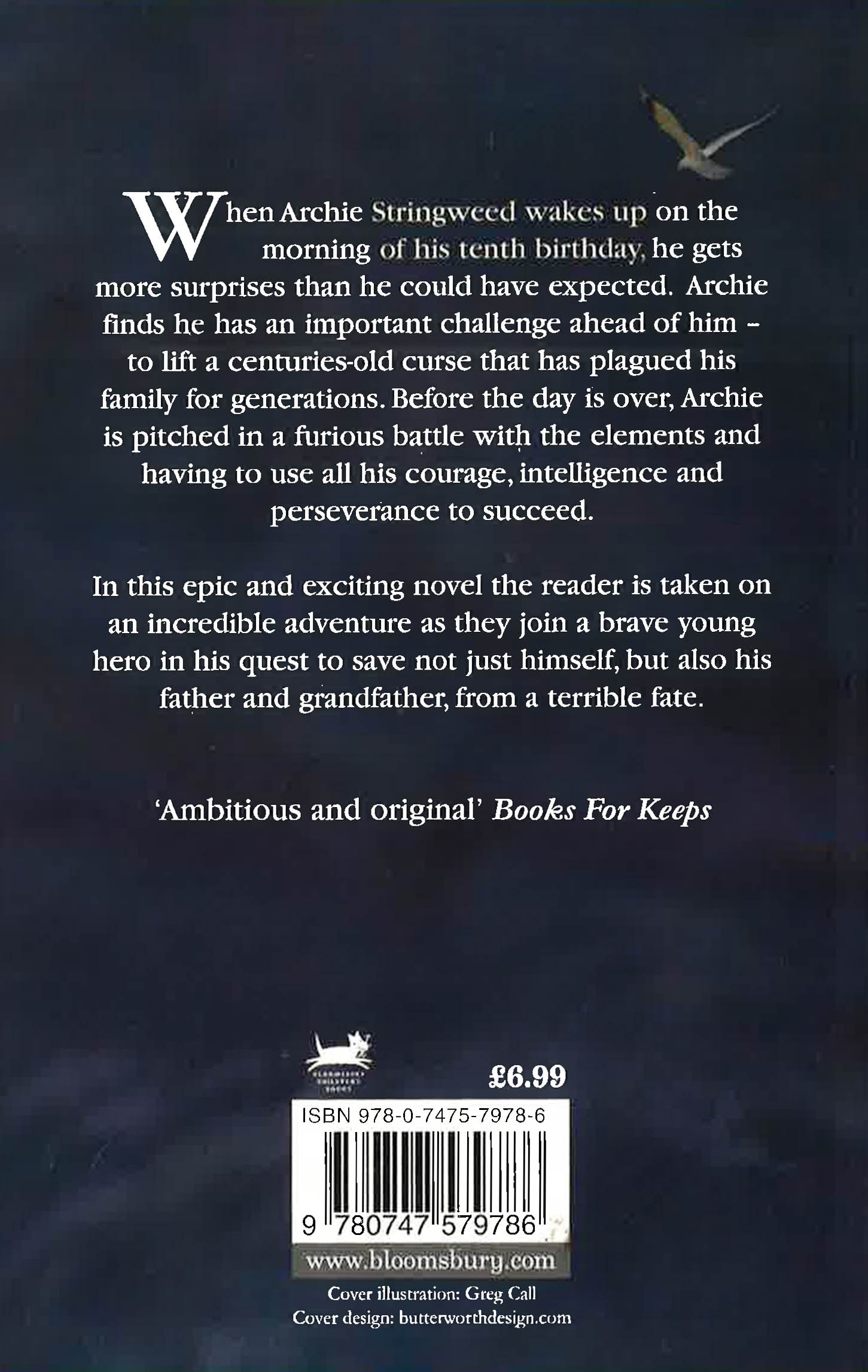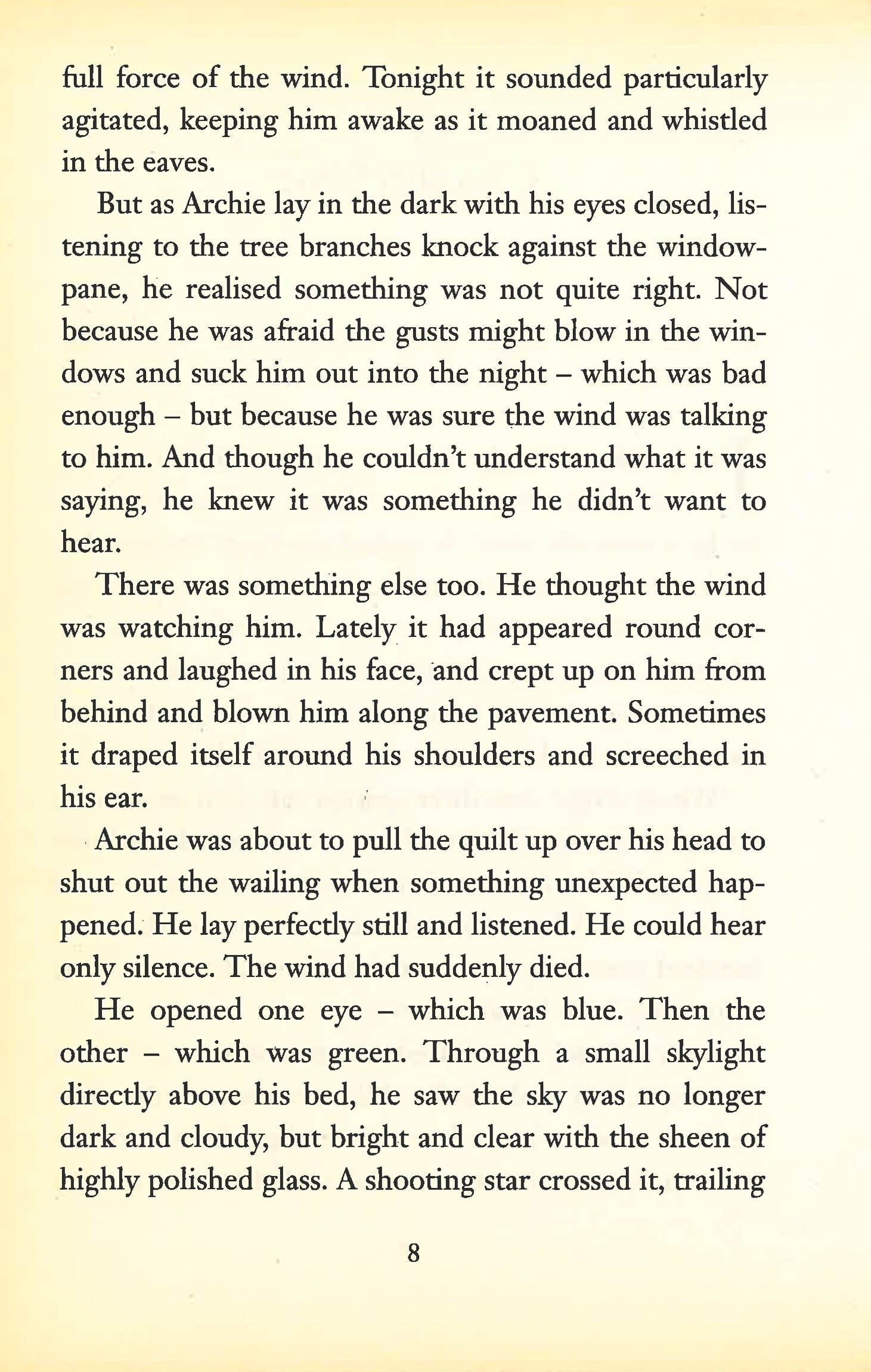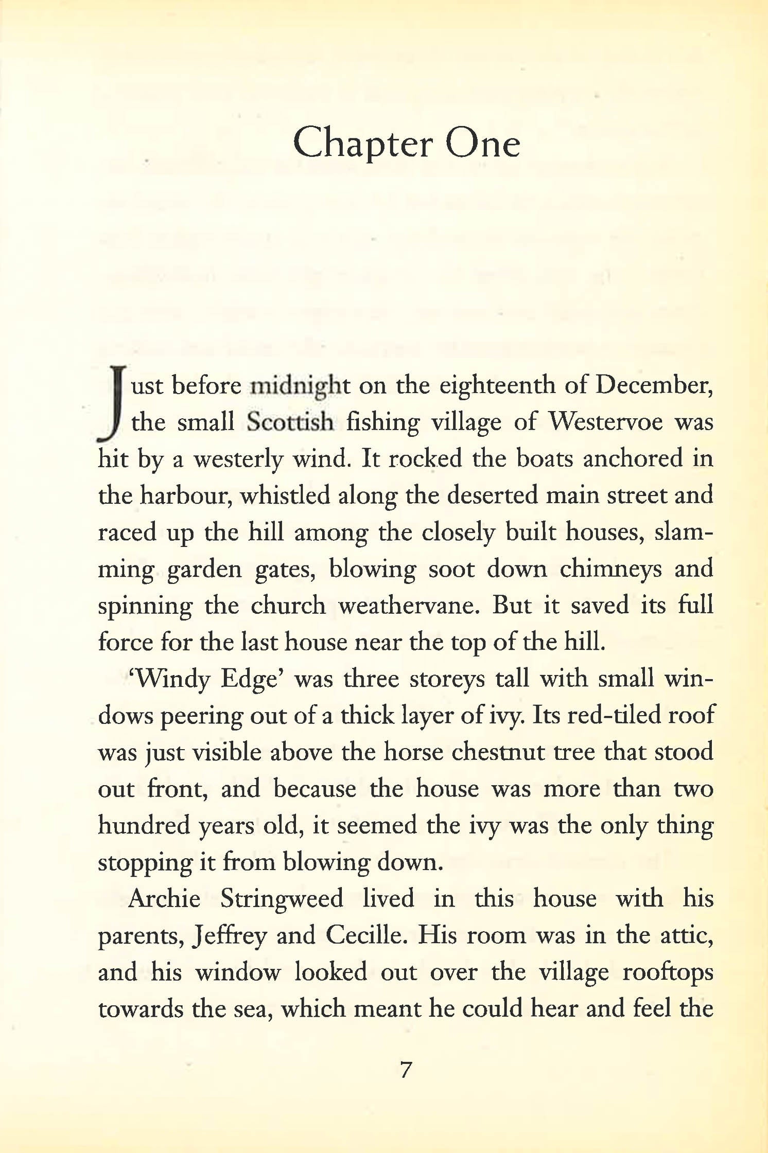 Archie Stringweed lives in the windswept Scottish fishing village of Westervoe. Archie is sure that the wind talks to him; that the wind watches him. It seems to appear round corners and laugh at him; to creep up behind him and blow him along the pavement; to drape itself round his shoulders and screech in his ear. Then, on Archie's tenth birthday, he discovers that he faces a huge challenge - one that will determine the fate of his family, who have been plagued by a curse for generations. Before the day is out, Archie is pitched in a furious battle with the elements ...