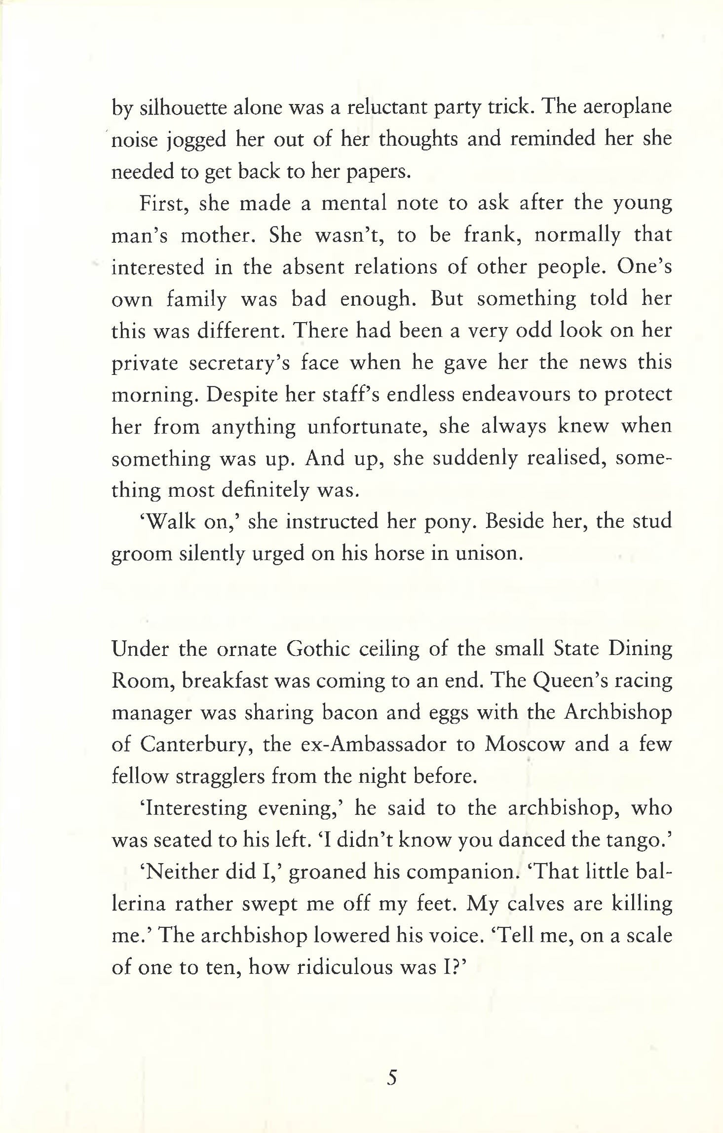 The morning after a dinner party at Windsor Castle, eighty-nine-year-old Queen Elizabeth is shocked to discover that one of her guests has been found murdered in his room, with a rope around his neck. When the police begin to suspect her loyal servants, Her Majesty knows they are looking in the wrong place. For the Queen has been living an extraordinary double life ever since her coronation. Away from the public eye, she has a brilliant knack for solving crimes. With her household's happiness on the line, her secret must not get out. Can the Queen and her trusted secretary Rozie catch the killer, without getting caught themselves?