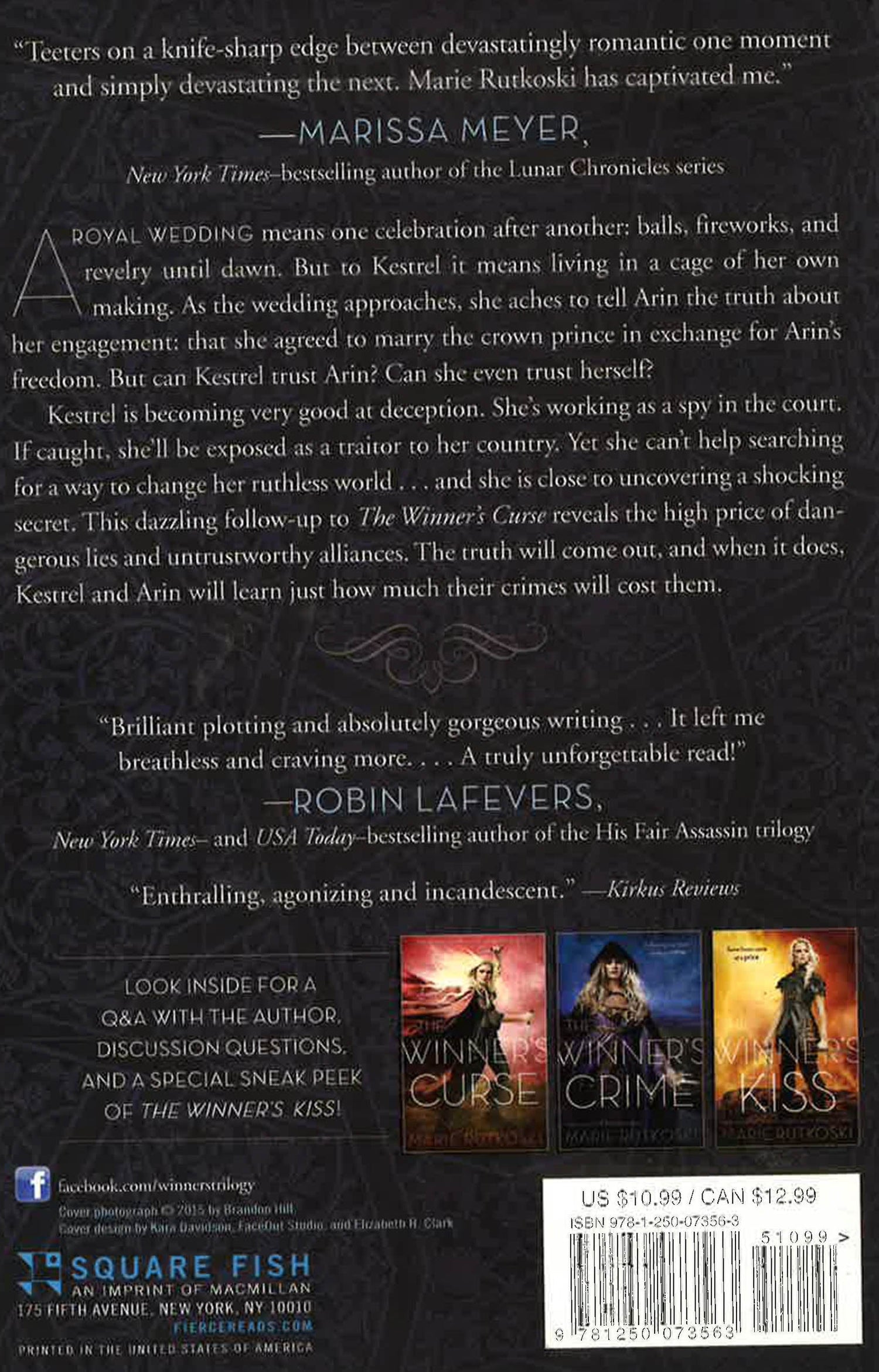 Following your heart can be a crime A royal wedding is what most girls dream about. It means one celebration after another: balls, fireworks, and revelry until dawn. But to Kestrel it means living in a cage of her own making. As the wedding approaches, she aches to tell Arin the truth about her engagement: that she agreed to marry the crown prince in exchange for Arin's freedom. But can Kestrel trust Arin? Can she even trust herself? For Kestrel is becoming very good at deception. She's working as a spy in the court. If caught, she'll be exposed as a traitor to her country. Yet she can't help searching for a way to change her ruthless world . . . and she is close to uncovering a shocking secret. This dazzling follow-up to The Winner's Curse reveals the high price of dangerous lies and untrustworthy alliances. The truth will come out, and when it does, Kestrel and Arin will learn just how much their crimes will cost them. The Winner's Crime by Marie Rutkoski is the second book in the Winner's Trilogy. "The Winner's Crime teeters on a knife-sharp edge between devastatingly romantic one moment and simply devastating the next. Marie Rutkoski has captivated me with her world of mind games, power struggles, and espionage, and left me positively desperate to see how Kestrel and Arin's story will play out." --Marissa Meyer, New York Times-bestselling author of the Lunar Chronicles series The middle entry in a fantasy trilogy brings new players to the game while exponentially raising the stakes. . . . . The twisty plot is a cleverly constructed puzzle box of intrigue and deceit, couched in graceful prose that shifts from restrained to voluptuous. . . . Enthralling, agonizing and incandescent. --Kirkus Reviews, starred review "Brilliant plotting and absolutely gorgeous writing combine to make The Winner's Crime a standout, but it is the complex, deeply layered characters with their gut wrenching dilemmas and impossible choices that cracked my heart wide open. It left me breathless and craving more--I don't know how I will be able to wait for the final book. A truly unforgettable read!" --Robin LaFevers, New York Times-bestselling author of Grave Mercy and Dark Triumph