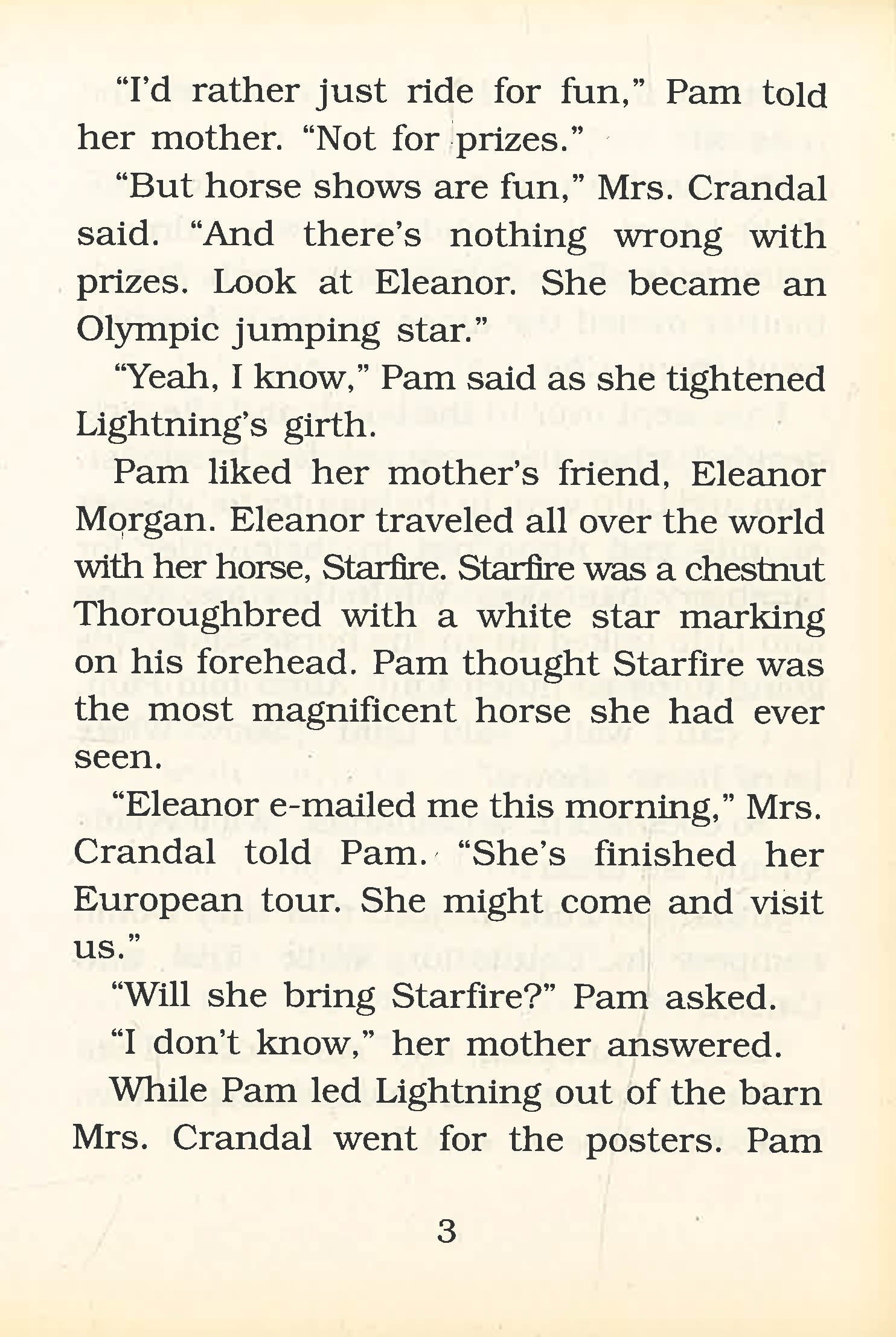 Pam doesn’t enjoy competing in horse shows. She’d much rather help to coach Mimi and Rosalie. For Pam, winning really isn’t important. But after some lessons from an Olympic rider, will Pam change her mind and turn Lightning into a champ?