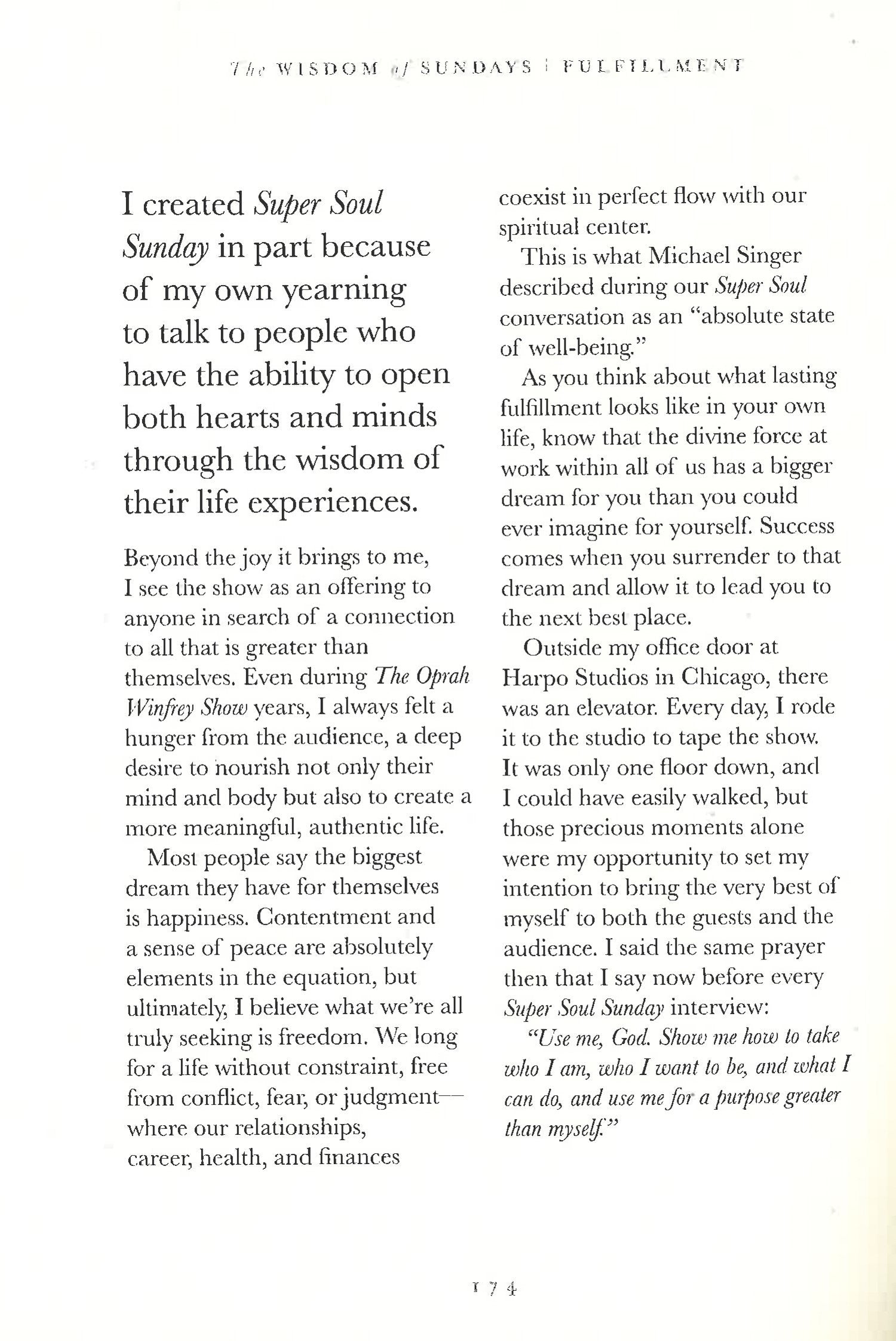 Oprah Winfrey says Super Soul Sunday is the television show she was born to do. "I see it as an offering," she explains. "If you want to be more fully present and live your life with a wide-open heart, this is the place to come to."Now, for the first time, the aha moments of inspiration and soul-expanding insight that have enlightened millions on the three-time Emmy Award-winning Super Soul Sunday are collected in The Wisdom of Sundays, a beautiful, cherishable, deeply-affecting book.Organized into ten chapters - each one representing a powerful step in Oprah’s own spiritual journey and introduced with an intimate, personal essay by Oprah herself - the Wisdom of Sundays features selections from the most meaningful conversations between Oprah and some of today’s most-admired thought-leaders. Visionaries like Tony Robbins, Arianna Huffington, and Shonda Rhimes share their lessons in finding purpose through mindfulness and intention. World renowned authors and teachers like Eckhart Tolle, Thich Nhat Hahn, Marianne Williamson and Wayne Dyer, explain our complex relationship with the ego and the healing powers of love and connection; and award-winning and bestselling writers like Cheryl Strayed, Elizabeth Gilbert, and Elizabeth Lesser explore the beauty of forgiveness and spirituality.Paired with beautiful photographs, including many from Oprah’s private property in California where each episode of Super Soul Sunday is filmed, The Wisdom of Sundays promises to be a timeless keepsake that will help readers awaken to life’s wondrous possibilities and discover a deeper connection to the natural world around them.