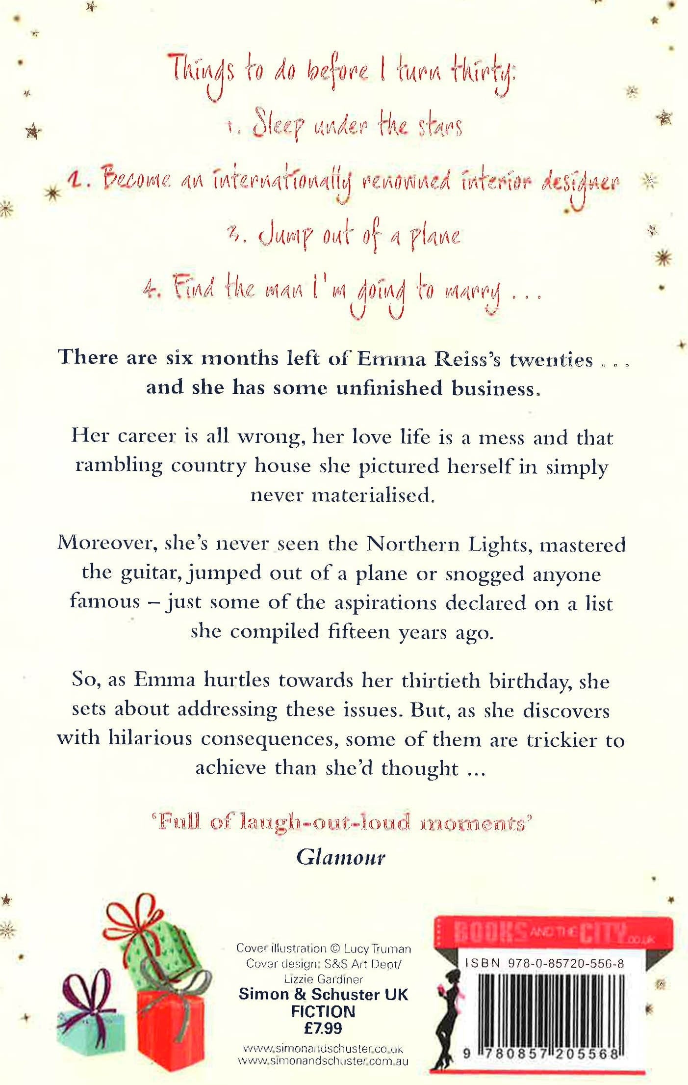 The Big 3-0 is looming, but there's so much still to do... The brilliant new novel from the Sunday Times Top 10 bestselling author There are six months left of Emma Reiss's twenties...and she has some unfinished business. Emma and her friends are about to turn thirty, and for Emma it's a defining moment. Defined, that is, by her having achieved none of the things she'd imagined she would. Her career is all wrong, her love life is a desert and that penthouse apartment she pictured herself in simply never materialised. Moreover, she's never jumped out of a plane, hasn't met the man she's going to marry, has never slept under the stars, or snogged anyone famous - just some of the aspirations on a list she and her friends compiled fifteen years ago. As an endless round of birthday parties sees Emma hurtle towards her own thirtieth, she sets about addressing these issues. But, as she discovers with hilarious consequences, some of them are trickier to tick off than she'd thought?