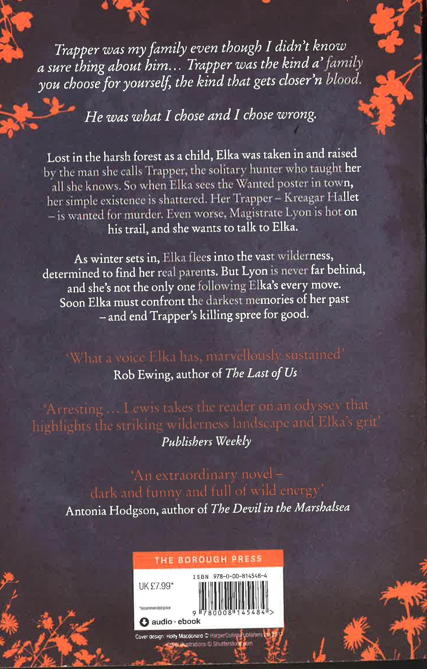 A debut literary thriller from an incredible new voice. What do you do when the man who gave you everything turns out to be a killer? Perfect for fans of STATION ELEVEN by Emily St. John Mandel. Trapper was my family even though I didn't know a sure thing about him... Trapper was the kind a' family you choose for yourself, the kind that gets closer'n blood. He was what I chose and I chose wrong. Lost in the harsh forest as a child, Elka was taken in and raised by the man she calls Trapper, the solitary hunter who taught her all she knows. So when Elka sees the Wanted poster in town, her simple existence is shattered. Her Trapper - Kreagar Hallet - is wanted for murder. Even worse, Magistrate Lyon is hot on his trail, and she wants to talk to Elka. As winter sets in, Elka flees into the vast wilderness, determined to find her real parents. But Lyon is never far behind, and she's not the only one following Elka's every move. Soon Elka must confront the darkest memories of her past- and end Trapper's killing spree for good.