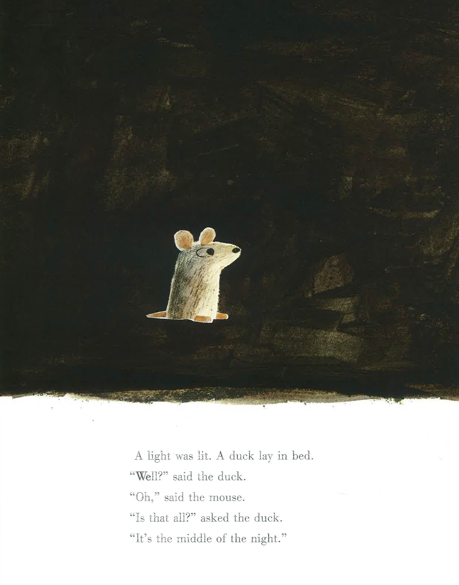 When a woeful mouse is swallowed up by a wolf, he quickly learns he is not alone: a duck has already set up digs and, boy, has that duck got it figured out! Turns out it’s pretty nice inside the belly of the beast – there's delicious food, elegant table settings and, best of all, dancing. And there’s something more: no more fear of being eaten by a wolf! Life's not so bad, considering the alternatives. That is, until a hunter shows up... With a nod to traditional fables and a wink to the reader, the award-winning Mac Barnett and Jon Klassen of Sam and Dave Dig a Hole, Extra Yarn and Triangle offer a tale of cooperation and creative cuisine that is sure to go down easy.