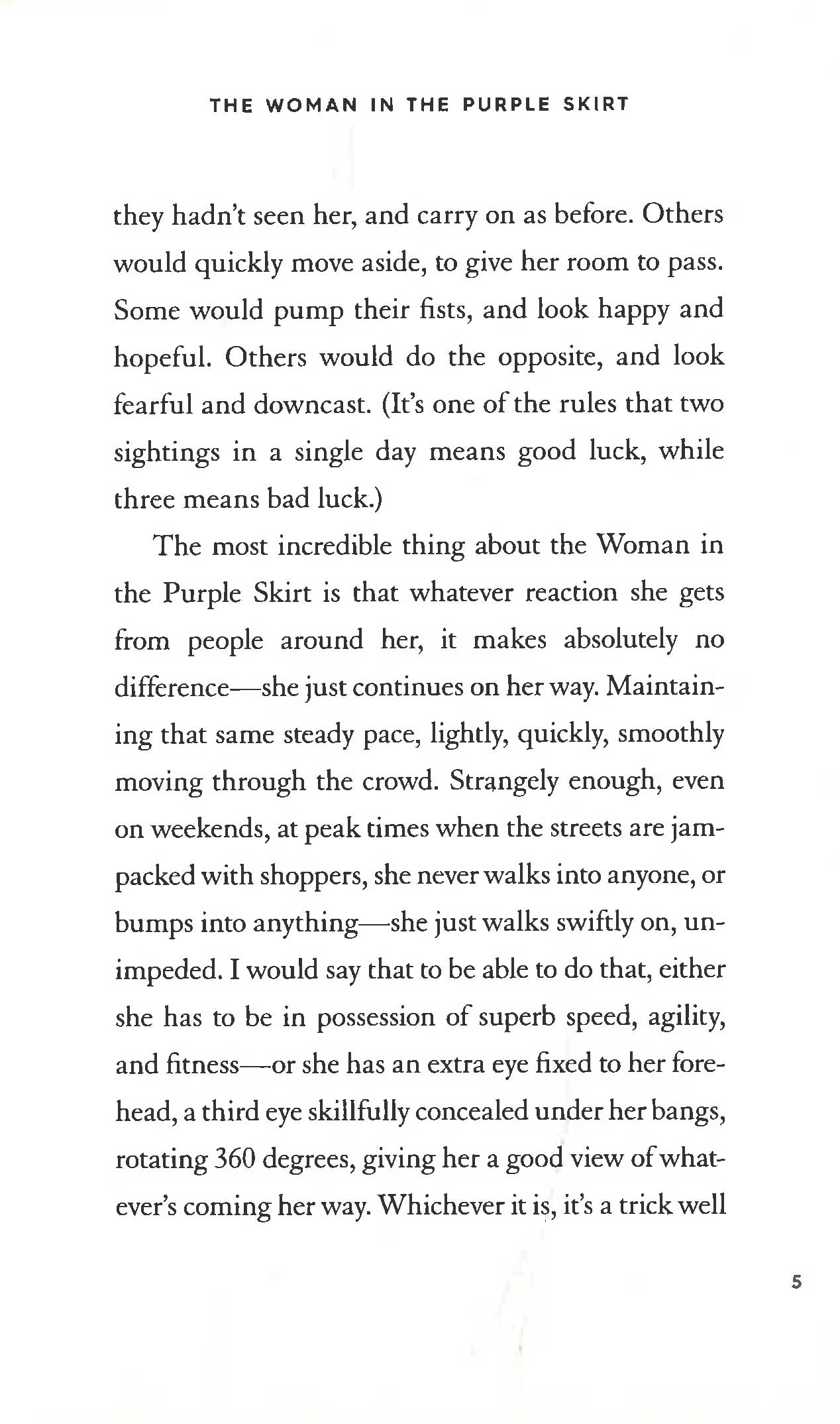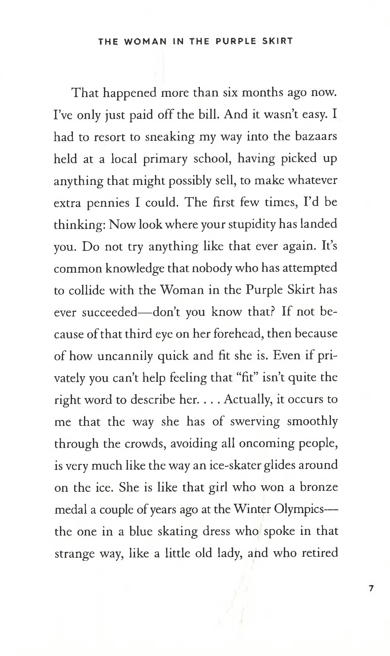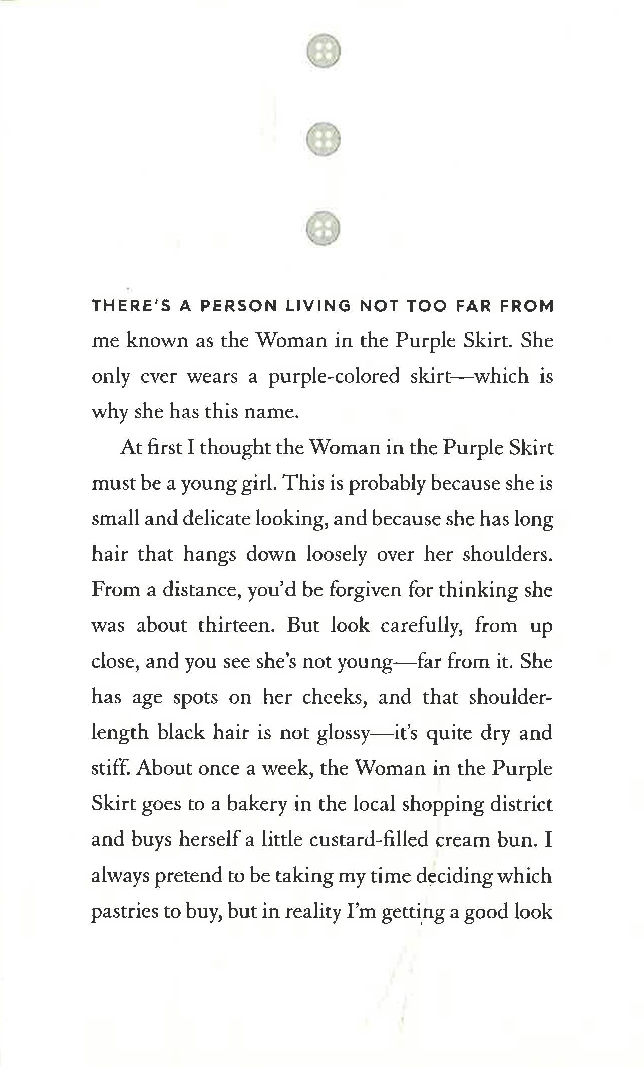 From a distance, the Woman in the Purple Skirt looks like a schoolgirl, but there are age spots on her face, and her hair is dry and stiff. She is single, she lives in a small apartment, and she is short on money--just like the Woman in the Yellow Cardigan, who lures her to a job as a housekeeper at a hotel, where she too is a housekeeper. Soon, the Woman in the Purple Skirt is having an affair with the boss and all eyes are on her. But no one knows or cares about the Woman in the Yellow Cardigan. That's the difference between her and the Woman in the Purple Skirt.